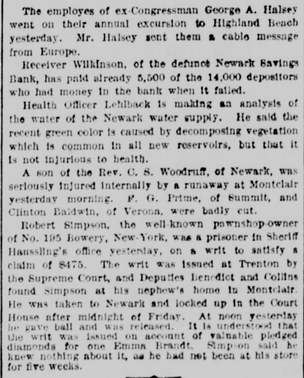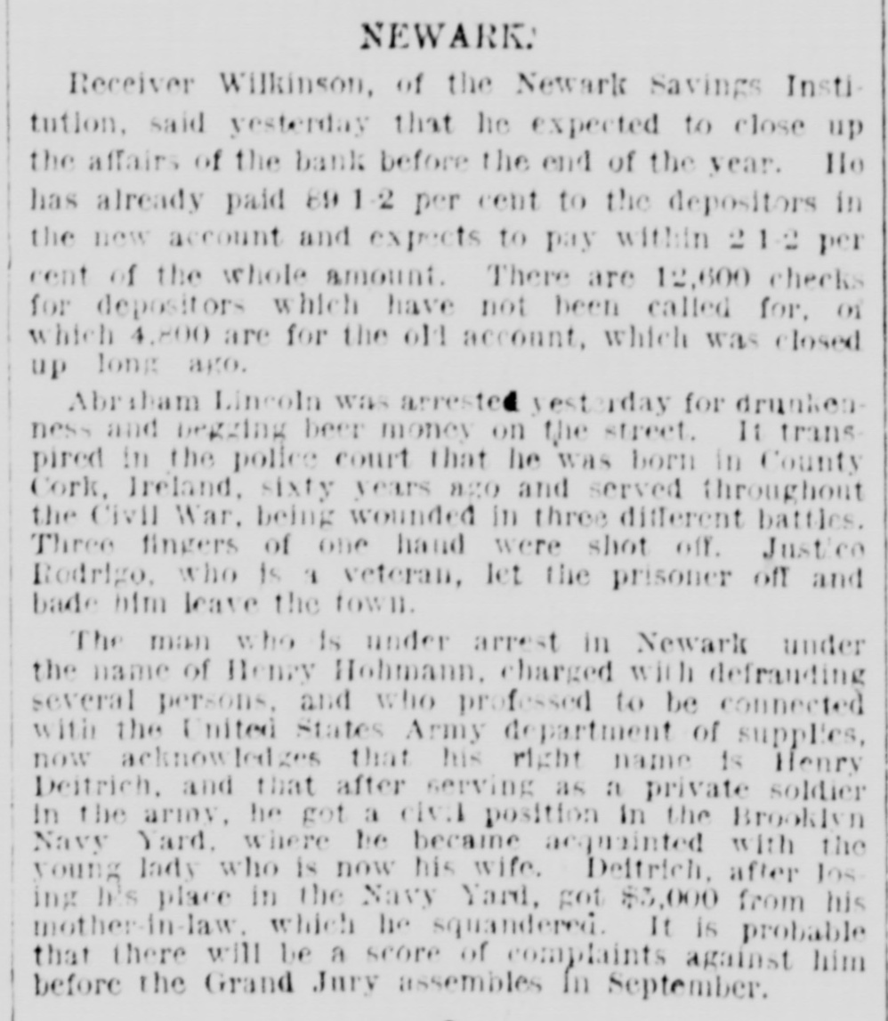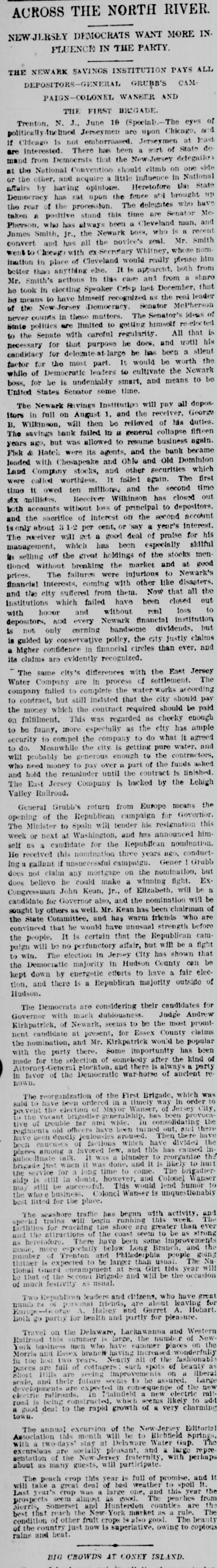 The Newark S Savings Institution is about to disappear, and never was the end of an old institution more welcome. The bank failed owing depositora millions. An arrangement was made by which the bank reorganized, was allowed to pay off its indebtedness as slowly as it pleased, and was permitted to receive new deposits, all under the control and by permission of the Court of Chancery. The first failure had been caused by bad Investments, yet the managers went to the same Wall Street speculators and dabbled in the same stocks which had caused the first collapse, and a new fallure was the natural and legitimate result. The liabilities this time were $6,000,000. The whole matter was then put in a receiver's hands, and has there remained for years. The "old account" has been paid in full, and there was some surplus even. The sale of real estate and the realization of other assets sufficed after a time to pay depositors 89 1-2 per cent, and the negligent managers were compelled to pay $100,000 toward this. The remaining assets were $1,200,000 of Chesapeake and Ohio second preferred stock, and $176,000 of Old Dominion Land Company stock with some other odds and ends-the scrapings of Fish & Hatch's office after the failure of that firm, which also carried down the bank. The receiver has at last sold the Chesapeake and Ohio stock at a good price and has good offers for the Old Dominion stock, and will thus have enough to pay every depositor in full in sixty