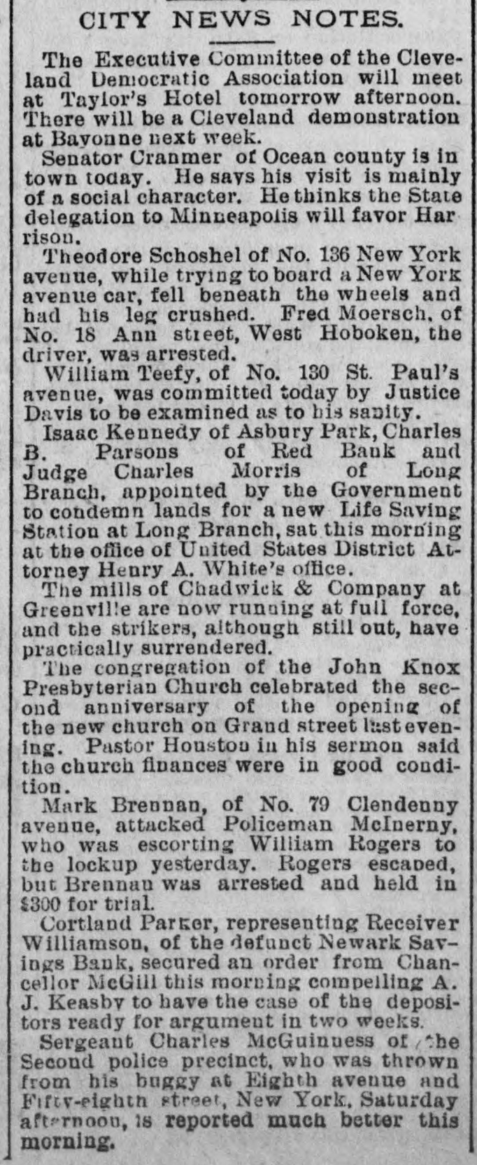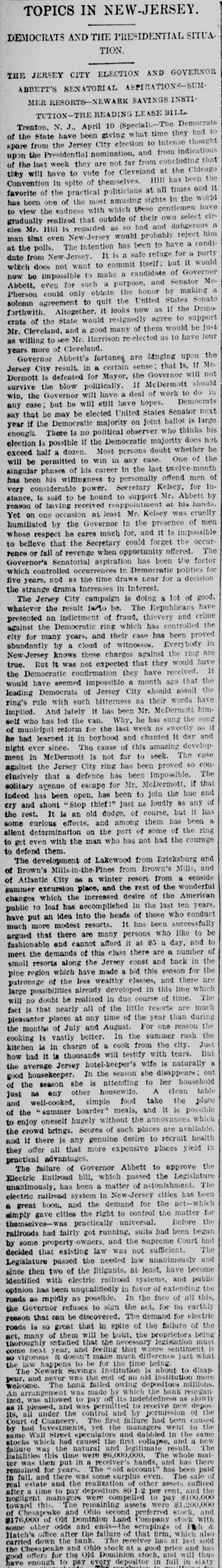 Governor Abbett's fortunes are 1Anging upon the Jersey City result, in a certain sense; that is, if McDermott is defeated for Mayor, the Governor will not survive the blow politically. If McDermott should win, the Governor will have a deal of work to do in any case; but he will still have hopes. Democrats say that he may be elected United States Senator next year if the Democratic majority on joint ballot is large enought. There is no political observer who thinks his election is possible if the Democratic majority does not exceed half a dozen. Most persons doubt whether he will be permitted to win in any case. One of the singular phases of his career in the last twelve-month has been his willingness to personally offend men of very considerable power. Secretary Kelsey, for instance, is said to be bound to support Mr. Abbett by reason of having received reappointment at his hands. Yet on one occasion at least Mr. Kelsey was cruelly humiliated by the Governor in the presence of men whose respect he cares much for, and it is impossible to belleve that the Secretary could forget the occurrence or fall of revenge when opportunity offered. The Governor's Senatorial aspiration has been the factor which controlled occurrences in Democratic politics for five years, and as the time draws near for a decision the strange drama increases in Interest.