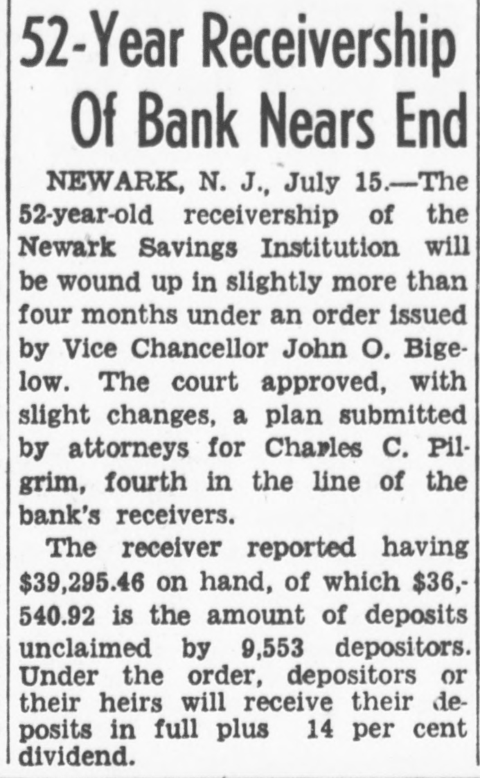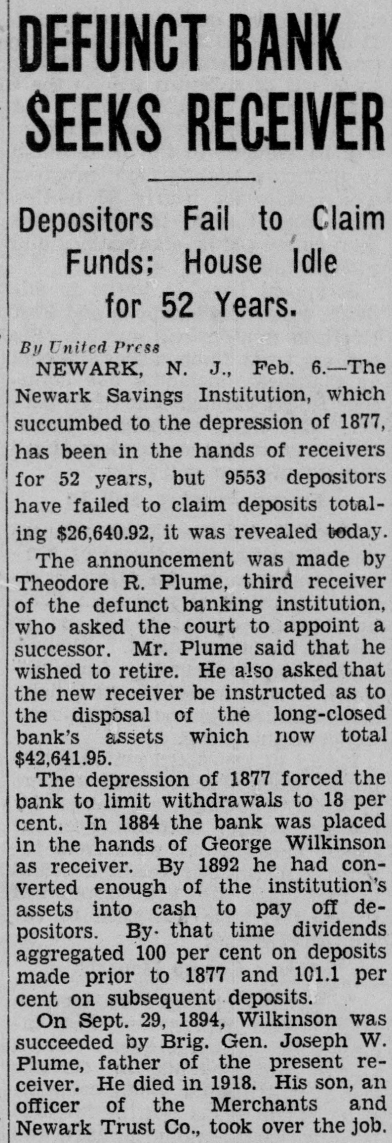 DEFUNCT BANK SEEKS RECEIVER Depositors Fail to Claim Funds: House Idle for 52 Years. By United Press NEWARK, N. J., Feb. 6.-The Newark Savings Institution, which succumbed to the depression of 1877, has been in the hands of receivers for 52 years, but 9553 depositors have failed to claim deposits totaling $26,640.92, it was revealed today. The announcement was made by Theodore R. Plume, third receiver of the defunct banking institution, who asked the court to appoint a successor. Mr. Plume said that he wished to retire. He also asked that the new receiver be instructed as to the disposal of the long-closed bank's assets which now total $42,641.95. The depression of 1877 forced the bank to limit withdrawals to 18 per cent. In 1884 the bank was placed in the hands of George Wilkinson as receiver. By 1892 he had converted enough of the institution's assets into cash to pay off depositors. By. that time dividends aggregated 100 per cent on deposits made prior to 1877 and 101.1 per cent on subsequent deposits. On Sept. 29, 1894, Wilkinson was succeeded by Brig. Gen. Joseph W. Plume, father of the present receiver. He died in 1918. His son, an officer of the Merchants and Newark Trust Co., took over the job.