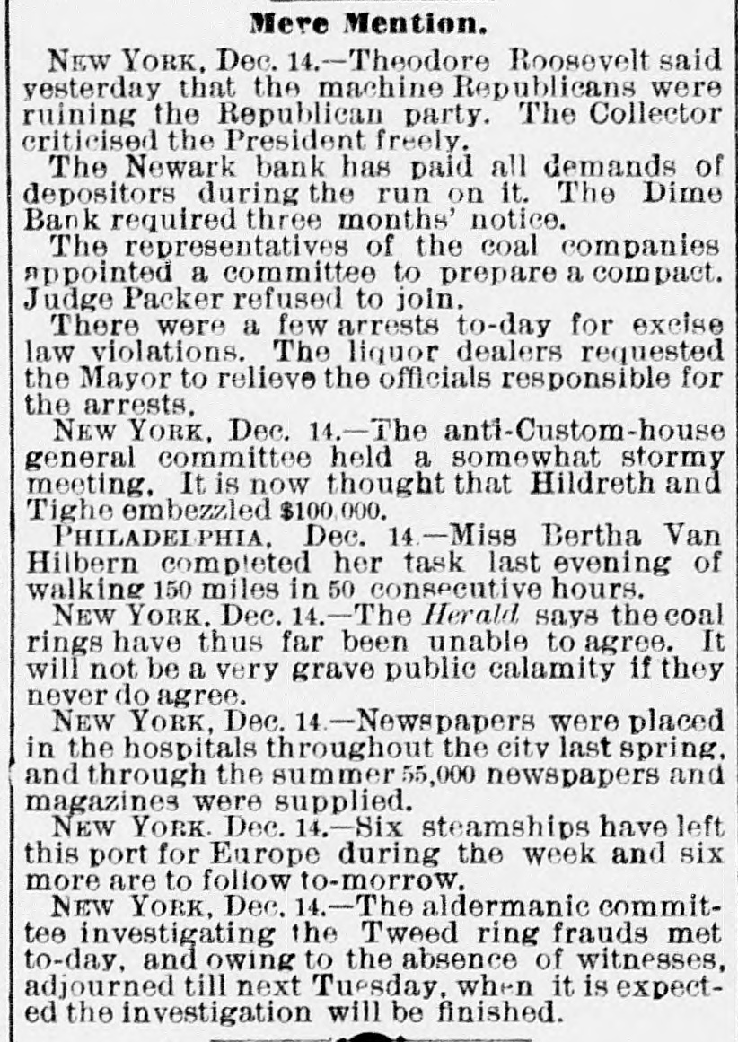 Mere Mention. NEW YORK, Dec. 14.-Theodore Roosevelt said yesterday that the machine Republicans were ruining the Republican party. The Collector criticised the President freely. The Newark bank has paid all demands of depositors during the run on it. The Dime Bank required three months' notice. The representatives of the coal companies appointed a committee to prepare a compact. Judge Packer refused to join. There were a few arrests to-day for excise law violations. The liquor dealers requested the Mayor to relieve the officials responsible for the arrests, NEW YORK, Dec. 14.-The anti-Custom-house general committee held a somewhat stormy meeting, It is now thought that Hildreth and Tighe embezzled $100.000. PHILADELPHIA, Dec. 14-Miss Bertha Van Hilbern completed her task last evening of walking 150 miles in 50 consecutive hours. NEW YORK, Dec. 4.-The Herald says the coal rings have thus far been unable to agree. It will not be a very grave public calamity if they never do agree. NEW YORK, Dec. 14.-Newspapers were placed in the hospitals throughout the city last spring, and through the summer 55,000 newspapers and magazines were supplied. NEW YORK. Dec. 14.-Six steamships have left this port for Europe during the week and six more are to follow to-morrow. NEW YORK, Dec. 14.-The aldermanic committee investigating the Tweed ring frauds met to-day. and owing to the absence of witnesses, adjourned till next Tuesday. when it is expected the investigation will be finished.