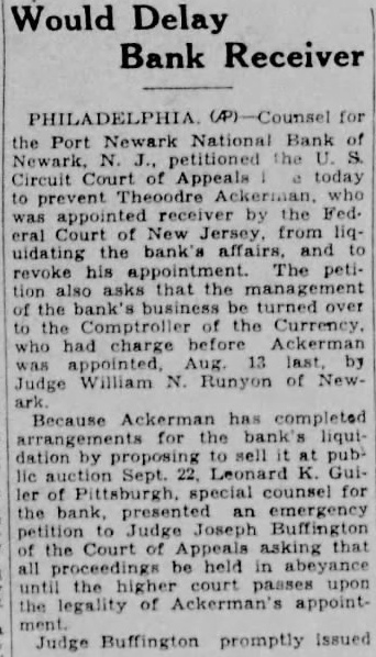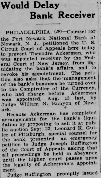 Would Delay Bank Receiver for the Port Newark National Bank of Newark, petitioned Circuit Court of Appeals today prevent was appointed by the Fed. Court New from liquidating the bank' revoke his appointment. The petithat the management the bank's turned the Comptroller the Currency. who charge before Ackerman 13 by Judge William N. Runyon of NewBecause Ackerman has completed arrangements the bank liquidation by proposing sell Sept. Leonard Guiler of Pittsburgh. counsel for presented an emergency Judge Buffington the Court asking that all held the court upon the of Ackerman's appointJudge Buffington promptly Issued