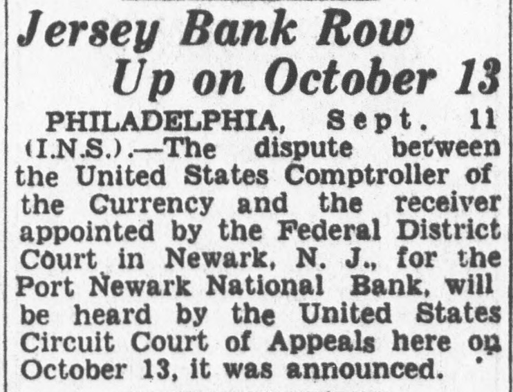 PHILADELPHIA, Sept. 11 (I.N.S.).—The dispute between the United States Comptroller of the Currency and the receiver appointed by the Federal District Court in Newark, N. J., for the Port Newark National Bank, will be heard by the United States Circuit Court of Appeals here on October 13, it was announced.