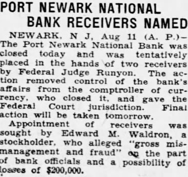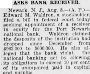 Newark N.J., Aug. 8.-(A. P.)Edward M. Waldron. stockholder. filed a bill in federal court today seeking appoints of receiver in equity for the Port Newark national bank Waldron claimed the desposits of the institution had dropped since December from $962,000 to $600,000. He also alleged that the bank violat the national banking act by allowing its obligations to exceed 10 per cent of its unimpaired paid in capital and