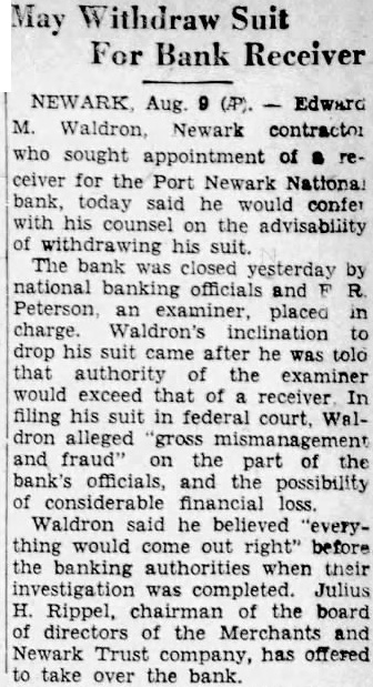 Aug. M. Newark contractor sought appointment of ceiver for the Port Newark National bank, today said he would confer his counsel the advisability withdrawing his suit. The bank closed yesterday national banking officials and Peterson, examiner, placed charge. Waldron's inclination drop suit came after he tolo that authority the examiner would exceed that receiver In filing federal dron alleged fraud" part bank's officials, possibility considerable financial Waldron he believed "everything would come right" before the banking when their Julius Rippel, of the board directors of the and Trust has offered take over the bank.