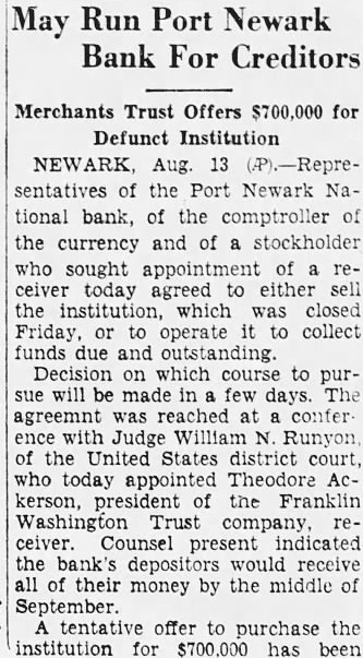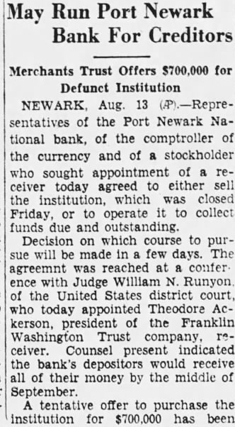 Jersey Income Jumps As They're ReOrganized. Press) Trenton. and re-openings banks closed in New Jersey the past year releasing state the now need adequate revenues for Records the Treasurer's office has been repaid and added to the state's curtailed income largest deposit affected by held the Peoples' National Bank and Trust Company, consolidated the Elizabeth Company Re$330,000 made the balance available. $10,000 of deposits totaling six banks been repaid and The ed banks the Freehold Trust Company, the First National Trust Merchantville, the Merchantville Trust Company, the First National Bank of Ocean City, and the Port Newark National Bank In fifteen closed banks. however which been released. Jersey Na. these banks tional Bank and Trust Newark. recently, with deposit