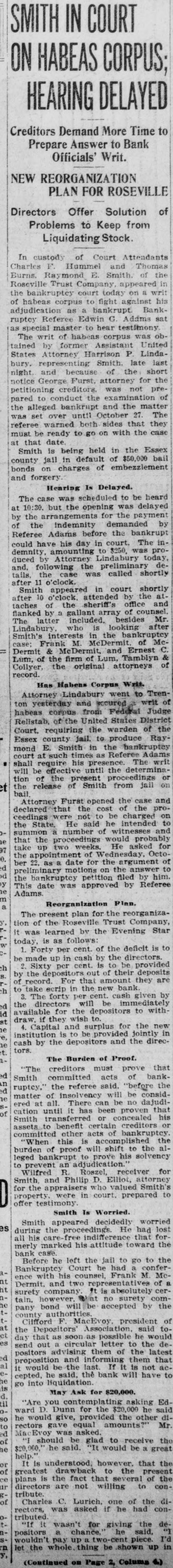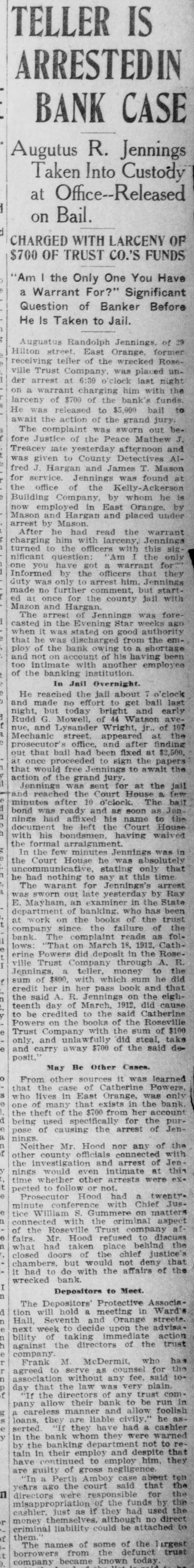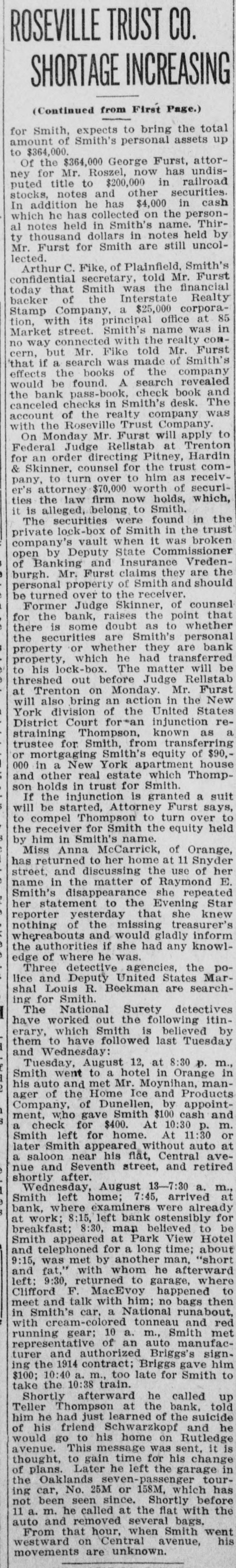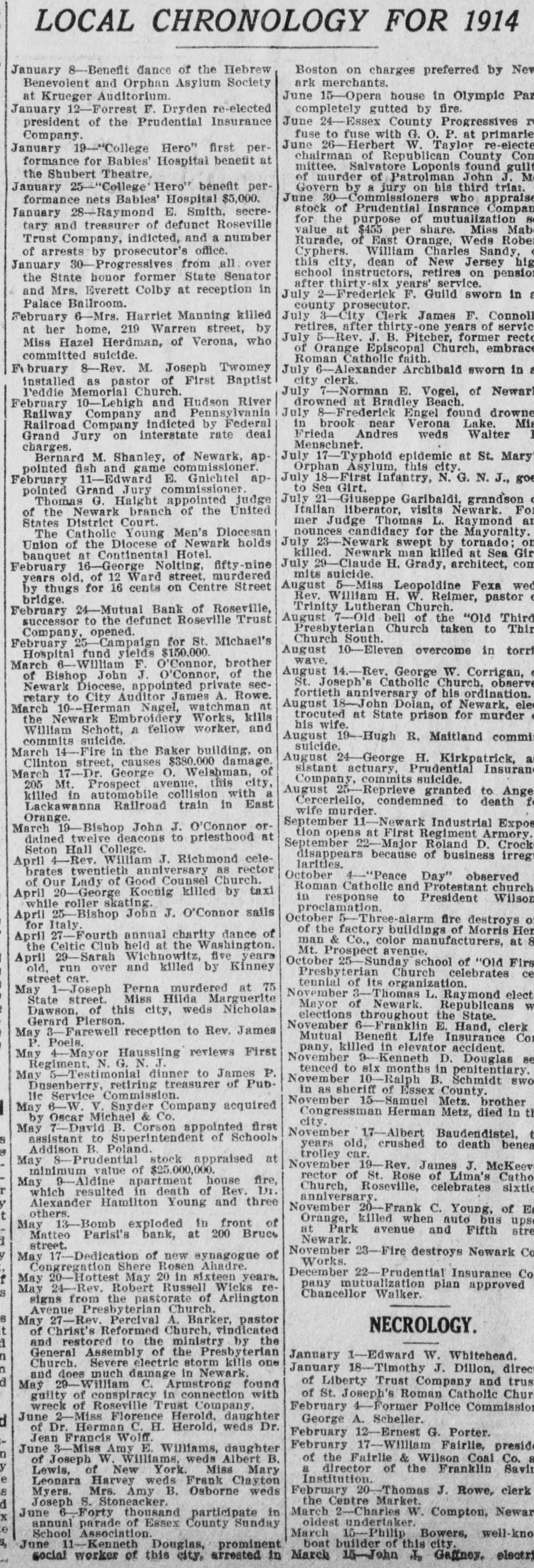 LOCAL CHRONOLOGY FOR 1914 January 8-Benefit dance of the Hebrew Boston on charges preferred by New ark merchants. Benevolent and Orphan Asylum Society at Krueger Auditorium. June 15-Opera house in Olympic Paz completely gutted by fire. January 12-Forrest F. Dryden re-elected June -Essex County Progressives I president of the Prudential Insurance Company. fuse to fuse with G. O. P. at primarie June -Herbert W. Taylor re-electe January 9-College Hero" first perchairman of Republican County Con formance for Babies' Hospital benefit at mittee. Salvatore Loponis found guilt the Shubert Theatre, of murder of Patrolman John J. M Govern by a jury on his third trial. January 25--"College Hero" benefit perJune 30- Commissioners who appraise formance nets Babies' Hospital $5,000. stock of Prudential Insrance Compan January 28-Raymond E. Smith, secrefor the purpose of mutualization B tary and treasurer of defunct Roseville value at $455 per share. Miss Mab Trust Company, indicted, and a number Rurade, of East Orange, Weds Rober ( of arrests by prosecutor's office. Cyphers. William Charles Sandy, this city, dean of New Jersey hig January D-Progressives from all over school instructors, retires on pension the State honor former State Senator after thirty-s years' service. and Mrs. Everett Colby at reception in July 2-Frederick F. Guild sworn in a Palace Ballroom. county prosecutor. July 3- City Clerk James F. Connoll February 6-Mrs. Harriet Manning killed retires, after thirty-one years of service at her home, 219 Warren street, by July 5-Rev. J. B. Pitcher, former recto Miss Hazel Herdman, of Verona, who of Orange Episcopal Church, embrace committed suicide. Roman Catholic faith. February 8-Rev. M. Joseph Twomey July 6-Alexander Archibald sworn in a city clerk. installed as pastor of First Baptist l'eddie Memorial Church. July -Norman E. Vogel, of Newark drowned at Bradley Beach. February 10-Lehigh and Hudson River July 8-Frederick Engel found drowne Railway Company and Pennsylvania in brook near Verona Lake. Mis Railroad Company indicted by Federal Frieda Andres weds Walter 1 Grand Jury on interstate rate deal Menschnet. charges. Bernard M. Shanley, of Newark, ap July 17-Typhoid epidemic at St. Mary Orphan Asylum, this city. pointed fish and game commissioner. July 18-First Infantry, N. G. N. J., goe February 11-Edward E. Gnichtel ap. to Sea Girt. pointed Grand Jury commissioner July 21 Giuseppe Garibaldi, grandson Thomas G. Haight appointed judge Italian liberator, visits Newark. For of the Newark branch of the United mer Judge Thomas L. Raymond an States District Court. nounces candidacy for the Mayoralty. The Catholic Young Men's Diocesan July 3-Newark swept by tornado; on Union of the Diocese of Newark holds killed. Newark man killed at Sea Gir banquet at Continental Hotel. July 29 -Claude H. Grady, architect, com February 16-George Nolting, fifty-nine mits suicide. years old, of 12 Ward street, murdered August 5 Miss Leopoldine Fexa wed by thugs for 16 cents on Centre Street Rev. William H. W. Reimer, pastor € bridge. Trinity Lutheran Church. February 24-Mutual Bank of Roseville, August bell of the "Old Third successor to the defunct Roseville Trust Presbyterian Church taken to Thin Company, opened. Church South. February 25 Campaign for St. Michael's August 10-Eleven overcome in torrt Hospital fund yields $150,000. wave, March -William F. O'Connor, brother August 14.-Rev. George W. Corrigan, e of Bishop John J. O'Connor, of the St. Joseph's Catholic Church, observe Newark Diocese, appointed private secfortieth anniversary of his ordination. retary to City Auditor James A. Rowe. August -John Dolan, of Newark, ele March 10--Herman Nagel, watchman at trocuted at State prison for murder < the Newark Embroidery Works, kills his wife. William Schott, a fellow worker, and August Hugh R. Maitland commis commits suicide. suicide. March -Fire in the Baker building, on August 24 George H. Kirkpatrick, a Clinton street, causes $380.000 damage, sistant actuary, Prudential Insuran March -Dr. George O. Welshman, of Company, commits suicide. 205 Mt. Prospect avenue, this city, August Reprieve granted to Ange killed in automobile collision with a Cerceriello, condemned to death f Lackawanna Railroad train in East wife murder. Orange. September 11-Newark Industrial Expos March 9-Bishop John J. O'Connor ortion opens at First Regiment Armory. dained twelve deacons to priesthood at September 22- Major Roland D. Crock Seton Hall College. disappears because of business irreg April -Rev. William J. Richmond celelarities. brates twentieth anniversary as rector October .."Peace Day" observed of Our Lady of Good Counsel Church. Roman Catholic and Protestant church April -George Koenig killed by taxi in response to President Wilson while roller skating. proclamation. April -Bishop John J. O'Connor sails October 5-Three-alarm fire destroys o for Italy. of the factory buildings of Morris Her April 7-Fourth annual charity dance of man Co., color manufacturers, at 8 the Celtic Club held at the Washington. Mt. Prospect avenue. April -Sarah Wichnowitz, five years October 25- Sunday school of "Old Firs old, run over and killed by Kinney Presbyterian Church celebrates ce street car. tennial of its organization. May 1-Joseph Perna murdered at 75 November -Thomas L. Raymond elect State street. Miss Hilda Marguerite Mayor of Newark. Republicans W Dawson, of this city, weds Nicholas elections throughout the State. Gerard Pierson. November 6-Franklin E. Hand, clerk May B-Farewell reception to Rev. James Mutual Benefit Life Insurance Co P. Poels. pany, killed in elevator accident. May --Mayor Haussling reviews First November 2 Kenneth D. Douglas se Regiment. N. G. N. J. tenced to six months in penitentiary. May 5-Testimonial dinner to James P. November 10-Ralph B. Schmidt SWO Dusenberry, retiring treasurer of Pubin as sheriff of Essex County. 11c Service Commission. November 15-Samuel Metz. brother May B-W. V. Snyder Company acquire