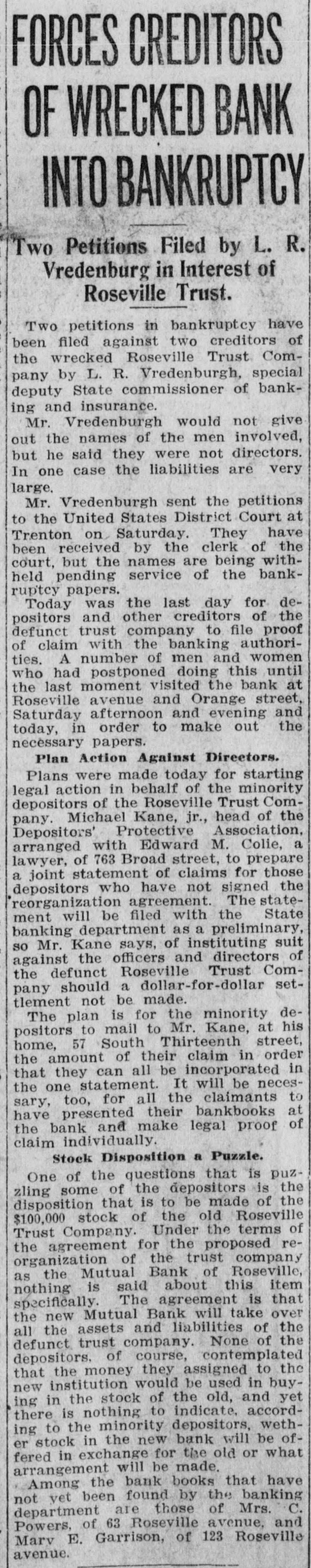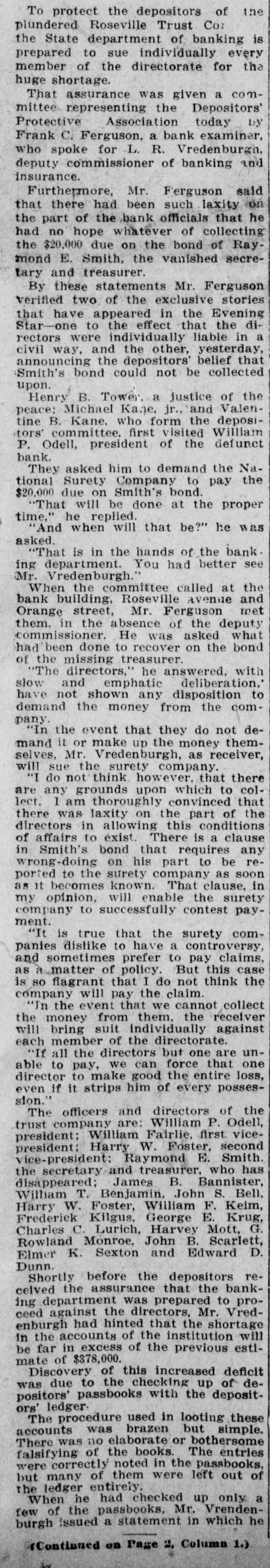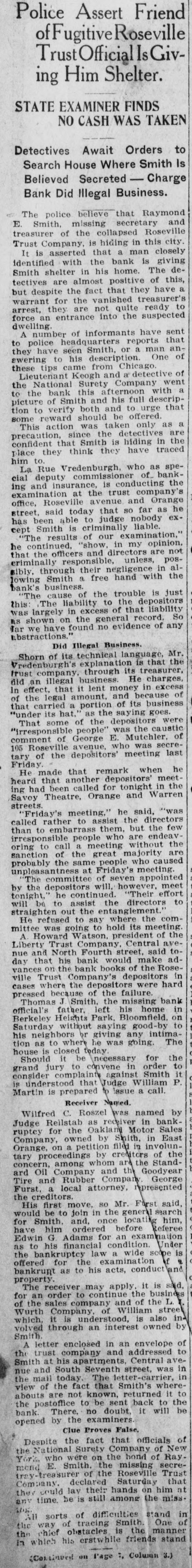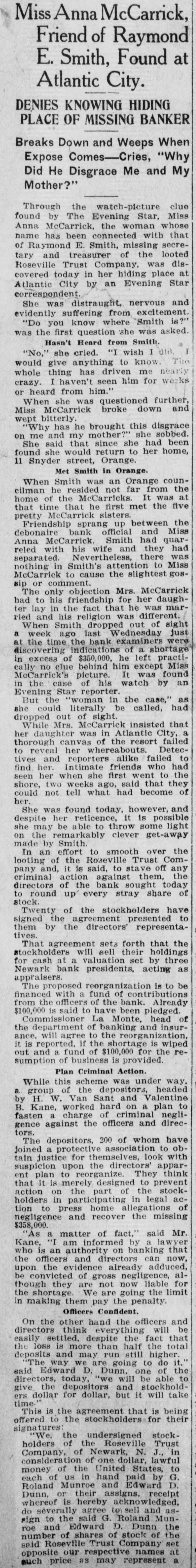 LOCAL CHRONOLOGY FOR 1914 January 8-Benefit dance of the Hebrew Boston on charges preferred by New ark merchants. Benevolent and Orphan Asylum Society at Krueger Auditorium. June 15-Opera house in Olympic Paz completely gutted by fire. January 12-Forrest F. Dryden re-elected June -Essex County Progressives I president of the Prudential Insurance Company. fuse to fuse with G. O. P. at primarie June -Herbert W. Taylor re-electe January 9-College Hero" first perchairman of Republican County Con formance for Babies' Hospital benefit at mittee. Salvatore Loponis found guilt the Shubert Theatre, of murder of Patrolman John J. M Govern by a jury on his third trial. January 25--"College Hero" benefit perJune 30- Commissioners who appraise formance nets Babies' Hospital $5,000. stock of Prudential Insrance Compan January 28-Raymond E. Smith, secrefor the purpose of mutualization B tary and treasurer of defunct Roseville value at $455 per share. Miss Mab Trust Company, indicted, and a number Rurade, of East Orange, Weds Rober ( of arrests by prosecutor's office. Cyphers. William Charles Sandy, this city, dean of New Jersey hig January D-Progressives from all over school instructors, retires on pension the State honor former State Senator after thirty-s years' service. and Mrs. Everett Colby at reception in July 2-Frederick F. Guild sworn in a Palace Ballroom. county prosecutor. July 3- City Clerk James F. Connoll February 6-Mrs. Harriet Manning killed retires, after thirty-one years of service at her home, 219 Warren street, by July 5-Rev. J. B. Pitcher, former recto Miss Hazel Herdman, of Verona, who of Orange Episcopal Church, embrace committed suicide. Roman Catholic faith. February 8-Rev. M. Joseph Twomey July 6-Alexander Archibald sworn in a city clerk. installed as pastor of First Baptist l'eddie Memorial Church. July -Norman E. Vogel, of Newark drowned at Bradley Beach. February 10-Lehigh and Hudson River July 8-Frederick Engel found drowne Railway Company and Pennsylvania in brook near Verona Lake. Mis Railroad Company indicted by Federal Frieda Andres weds Walter 1 Grand Jury on interstate rate deal Menschnet. charges. Bernard M. Shanley, of Newark, ap July 17-Typhoid epidemic at St. Mary Orphan Asylum, this city. pointed fish and game commissioner. July 18-First Infantry, N. G. N. J., goe February 11-Edward E. Gnichtel ap. to Sea Girt. pointed Grand Jury commissioner July 21 Giuseppe Garibaldi, grandson Thomas G. Haight appointed judge Italian liberator, visits Newark. For of the Newark branch of the United mer Judge Thomas L. Raymond an States District Court. nounces candidacy for the Mayoralty. The Catholic Young Men's Diocesan July 3-Newark swept by tornado; on Union of the Diocese of Newark holds killed. Newark man killed at Sea Gir banquet at Continental Hotel. July 29 -Claude H. Grady, architect, com February 16-George Nolting, fifty-nine mits suicide. years old, of 12 Ward street, murdered August 5 Miss Leopoldine Fexa wed by thugs for 16 cents on Centre Street Rev. William H. W. Reimer, pastor € bridge. Trinity Lutheran Church. February 24-Mutual Bank of Roseville, August bell of the "Old Third successor to the defunct Roseville Trust Presbyterian Church taken to Thin Company, opened. Church South. February 25 Campaign for St. Michael's August 10-Eleven overcome in torrt Hospital fund yields $150,000. wave, March -William F. O'Connor, brother August 14.-Rev. George W. Corrigan, e of Bishop John J. O'Connor, of the St. Joseph's Catholic Church, observe Newark Diocese, appointed private secfortieth anniversary of his ordination. retary to City Auditor James A. Rowe. August -John Dolan, of Newark, ele March 10--Herman Nagel, watchman at trocuted at State prison for murder < the Newark Embroidery Works, kills his wife. William Schott, a fellow worker, and August Hugh R. Maitland commis commits suicide. suicide. March -Fire in the Baker building, on August 24 George H. Kirkpatrick, a Clinton street, causes $380.000 damage, sistant actuary, Prudential Insuran March -Dr. George O. Welshman, of Company, commits suicide. 205 Mt. Prospect avenue, this city, August Reprieve granted to Ange killed in automobile collision with a Cerceriello, condemned to death f Lackawanna Railroad train in East wife murder. Orange. September 11-Newark Industrial Expos March 9-Bishop John J. O'Connor ortion opens at First Regiment Armory. dained twelve deacons to priesthood at September 22- Major Roland D. Crock Seton Hall College. disappears because of business irreg April -Rev. William J. Richmond celelarities. brates twentieth anniversary as rector October .."Peace Day" observed of Our Lady of Good Counsel Church. Roman Catholic and Protestant church April -George Koenig killed by taxi in response to President Wilson while roller skating. proclamation. April -Bishop John J. O'Connor sails October 5-Three-alarm fire destroys o for Italy. of the factory buildings of Morris Her April 7-Fourth annual charity dance of man Co., color manufacturers, at 8 the Celtic Club held at the Washington. Mt. Prospect avenue. April -Sarah Wichnowitz, five years October 25- Sunday school of "Old Firs old, run over and killed by Kinney Presbyterian Church celebrates ce street car. tennial of its organization. May 1-Joseph Perna murdered at 75 November -Thomas L. Raymond elect State street. Miss Hilda Marguerite Mayor of Newark. Republicans W Dawson, of this city, weds Nicholas elections throughout the State. Gerard Pierson. November 6-Franklin E. Hand, clerk May B-Farewell reception to Rev. James Mutual Benefit Life Insurance Co P. Poels. pany, killed in elevator accident. May --Mayor Haussling reviews First November 2 Kenneth D. Douglas se Regiment. N. G. N. J. tenced to six months in penitentiary. May 5-Testimonial dinner to James P. November 10-Ralph B. Schmidt SWO Dusenberry, retiring treasurer of Pubin as sheriff of Essex County. 11c Service Commission. November 15-Samuel Metz. brother May B-W. V. Snyder Company acquire
