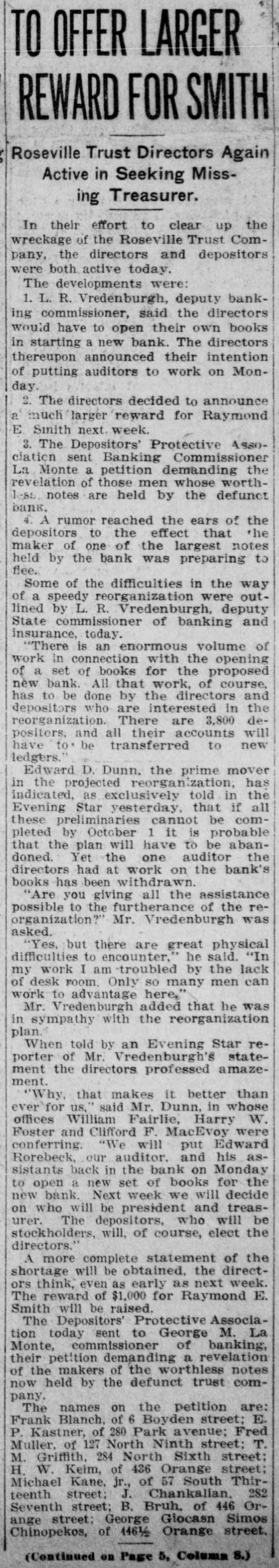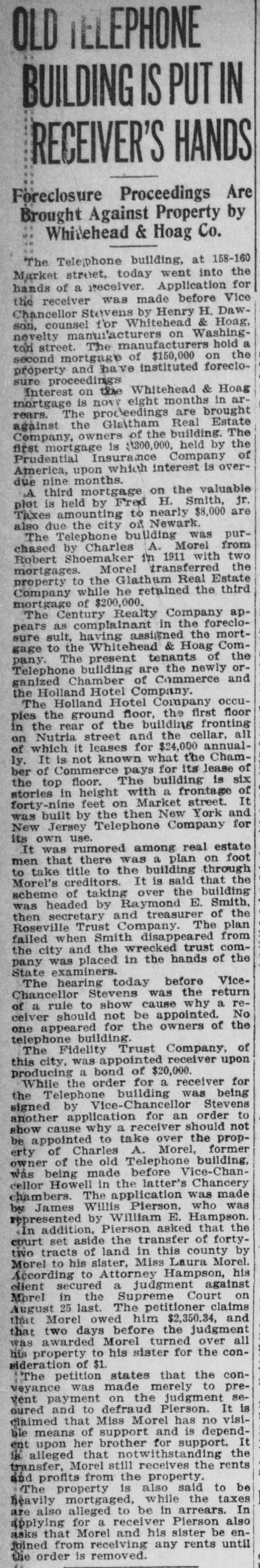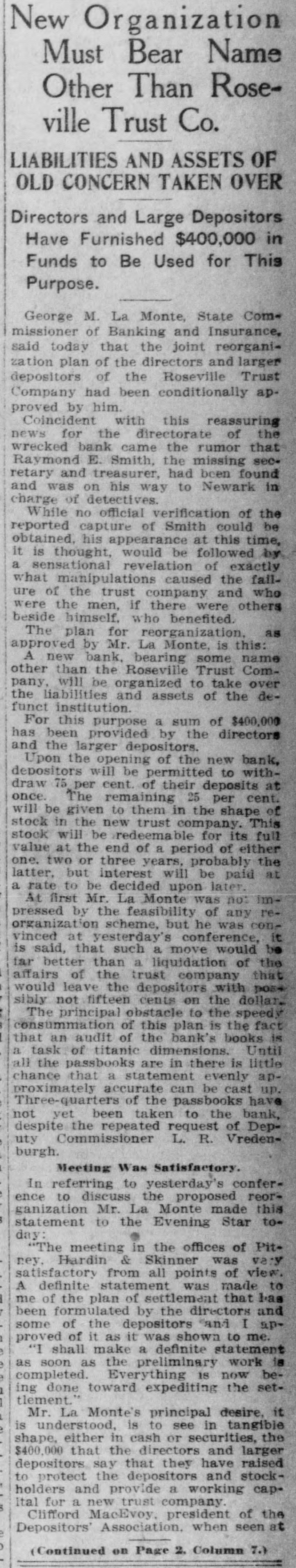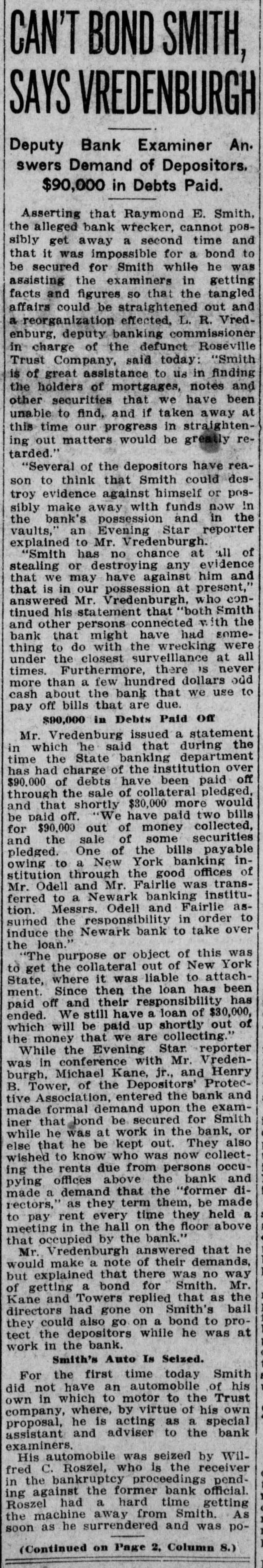 LOCAL CHRONOLOGY FOR 1914 January 8-Benefit dance of the Hebrew Boston on charges preferred by New ark merchants. Benevolent and Orphan Asylum Society at Krueger Auditorium. June 15-Opera house in Olympic Paz completely gutted by fire. January 12-Forrest F. Dryden re-elected June -Essex County Progressives I president of the Prudential Insurance Company. fuse to fuse with G. O. P. at primarie June -Herbert W. Taylor re-electe January 9-College Hero" first perchairman of Republican County Con formance for Babies' Hospital benefit at mittee. Salvatore Loponis found guilt the Shubert Theatre, of murder of Patrolman John J. M Govern by a jury on his third trial. January 25--"College Hero" benefit perJune 30- Commissioners who appraise formance nets Babies' Hospital $5,000. stock of Prudential Insrance Compan January 28-Raymond E. Smith, secrefor the purpose of mutualization B tary and treasurer of defunct Roseville value at $455 per share. Miss Mab Trust Company, indicted, and a number Rurade, of East Orange, Weds Rober ( of arrests by prosecutor's office. Cyphers. William Charles Sandy, this city, dean of New Jersey hig January D-Progressives from all over school instructors, retires on pension the State honor former State Senator after thirty-s years' service. and Mrs. Everett Colby at reception in July 2-Frederick F. Guild sworn in a Palace Ballroom. county prosecutor. July 3- City Clerk James F. Connoll February 6-Mrs. Harriet Manning killed retires, after thirty-one years of service at her home, 219 Warren street, by July 5-Rev. J. B. Pitcher, former recto Miss Hazel Herdman, of Verona, who of Orange Episcopal Church, embrace committed suicide. Roman Catholic faith. February 8-Rev. M. Joseph Twomey July 6-Alexander Archibald sworn in a city clerk. installed as pastor of First Baptist l'eddie Memorial Church. July -Norman E. Vogel, of Newark drowned at Bradley Beach. February 10-Lehigh and Hudson River July 8-Frederick Engel found drowne Railway Company and Pennsylvania in brook near Verona Lake. Mis Railroad Company indicted by Federal Frieda Andres weds Walter 1 Grand Jury on interstate rate deal Menschnet. charges. Bernard M. Shanley, of Newark, ap July 17-Typhoid epidemic at St. Mary Orphan Asylum, this city. pointed fish and game commissioner. July 18-First Infantry, N. G. N. J., goe February 11-Edward E. Gnichtel ap. to Sea Girt. pointed Grand Jury commissioner July 21 Giuseppe Garibaldi, grandson Thomas G. Haight appointed judge Italian liberator, visits Newark. For of the Newark branch of the United mer Judge Thomas L. Raymond an States District Court. nounces candidacy for the Mayoralty. The Catholic Young Men's Diocesan July 3-Newark swept by tornado; on Union of the Diocese of Newark holds killed. Newark man killed at Sea Gir banquet at Continental Hotel. July 29 -Claude H. Grady, architect, com February 16-George Nolting, fifty-nine mits suicide. years old, of 12 Ward street, murdered August 5 Miss Leopoldine Fexa wed by thugs for 16 cents on Centre Street Rev. William H. W. Reimer, pastor € bridge. Trinity Lutheran Church. February 24-Mutual Bank of Roseville, August bell of the "Old Third successor to the defunct Roseville Trust Presbyterian Church taken to Thin Company, opened. Church South. February 25 Campaign for St. Michael's August 10-Eleven overcome in torrt Hospital fund yields $150,000. wave, March -William F. O'Connor, brother August 14.-Rev. George W. Corrigan, e of Bishop John J. O'Connor, of the St. Joseph's Catholic Church, observe Newark Diocese, appointed private secfortieth anniversary of his ordination. retary to City Auditor James A. Rowe. August -John Dolan, of Newark, ele March 10--Herman Nagel, watchman at trocuted at State prison for murder < the Newark Embroidery Works, kills his wife. William Schott, a fellow worker, and August Hugh R. Maitland commis commits suicide. suicide. March -Fire in the Baker building, on August 24 George H. Kirkpatrick, a Clinton street, causes $380.000 damage, sistant actuary, Prudential Insuran March -Dr. George O. Welshman, of Company, commits suicide. 205 Mt. Prospect avenue, this city, August Reprieve granted to Ange killed in automobile collision with a Cerceriello, condemned to death f Lackawanna Railroad train in East wife murder. Orange. September 11-Newark Industrial Expos March 9-Bishop John J. O'Connor ortion opens at First Regiment Armory. dained twelve deacons to priesthood at September 22- Major Roland D. Crock Seton Hall College. disappears because of business irreg April -Rev. William J. Richmond celelarities. brates twentieth anniversary as rector October .."Peace Day" observed of Our Lady of Good Counsel Church. Roman Catholic and Protestant church April -George Koenig killed by taxi in response to President Wilson while roller skating. proclamation. April -Bishop John J. O'Connor sails October 5-Three-alarm fire destroys o for Italy. of the factory buildings of Morris Her April 7-Fourth annual charity dance of man Co., color manufacturers, at 8 the Celtic Club held at the Washington. Mt. Prospect avenue. April -Sarah Wichnowitz, five years October 25- Sunday school of "Old Firs old, run over and killed by Kinney Presbyterian Church celebrates ce street car. tennial of its organization. May 1-Joseph Perna murdered at 75 November -Thomas L. Raymond elect State street. Miss Hilda Marguerite Mayor of Newark. Republicans W Dawson, of this city, weds Nicholas elections throughout the State. Gerard Pierson. November 6-Franklin E. Hand, clerk May B-Farewell reception to Rev. James Mutual Benefit Life Insurance Co P. Poels. pany, killed in elevator accident. May --Mayor Haussling reviews First November 2 Kenneth D. Douglas se Regiment. N. G. N. J. tenced to six months in penitentiary. May 5-Testimonial dinner to James P. November 10-Ralph B. Schmidt SWO Dusenberry, retiring treasurer of Pubin as sheriff of Essex County. 11c Service Commission. November 15-Samuel Metz. brother May B-W. V. Snyder Company acquire