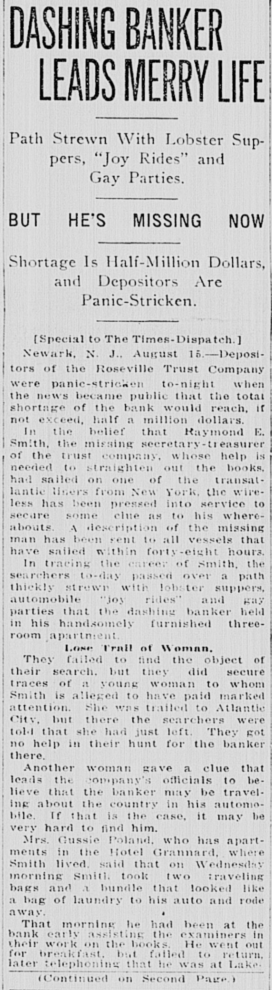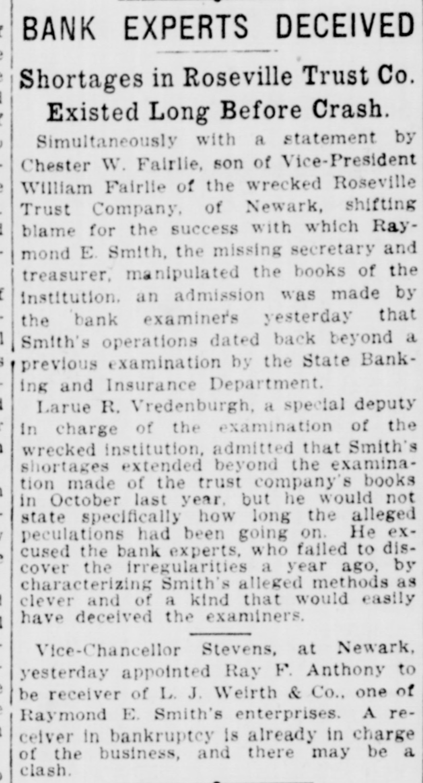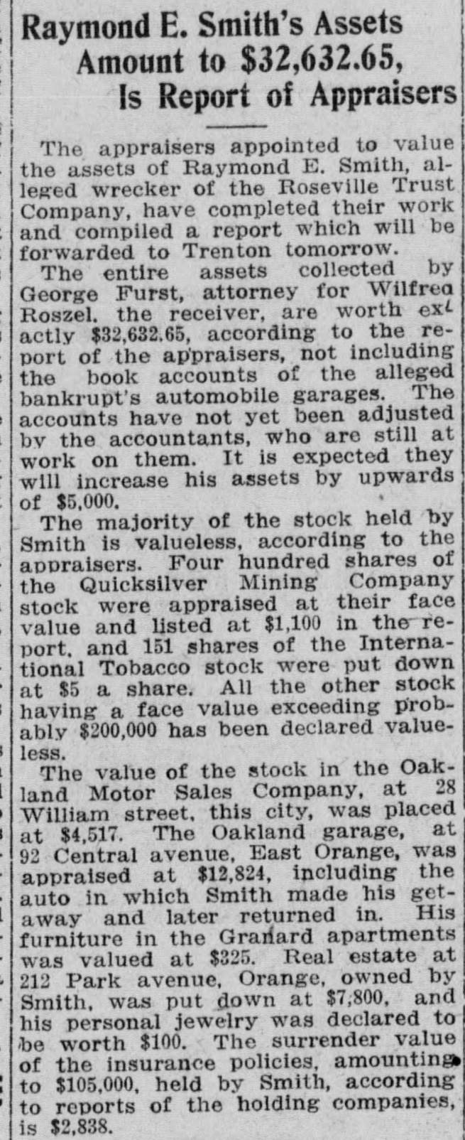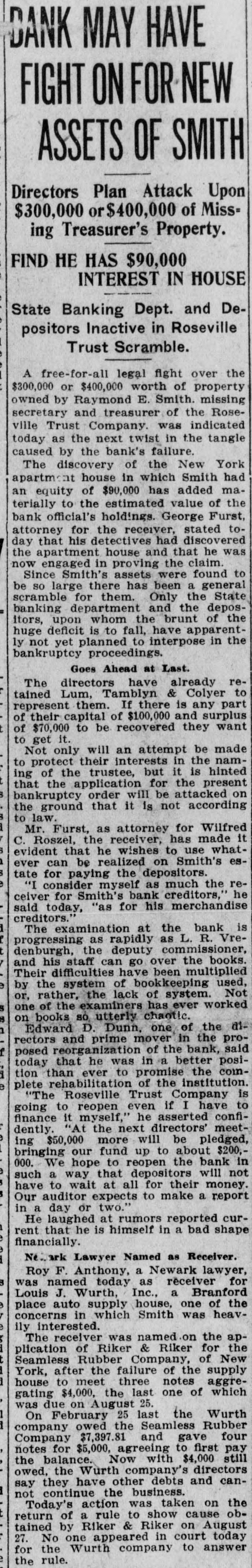 LOCAL CHRONOLOGY FOR 1914 January 8-Benefit dance of the Hebrew Boston on charges preferred by New ark merchants. Benevolent and Orphan Asylum Society at Krueger Auditorium. June 15-Opera house in Olympic Paz completely gutted by fire. January 12-Forrest F. Dryden re-elected June -Essex County Progressives I president of the Prudential Insurance Company. fuse to fuse with G. O. P. at primarie June -Herbert W. Taylor re-electe January 9-College Hero" first perchairman of Republican County Con formance for Babies' Hospital benefit at mittee. Salvatore Loponis found guilt the Shubert Theatre, of murder of Patrolman John J. M Govern by a jury on his third trial. January 25--"College Hero" benefit perJune 30- Commissioners who appraise formance nets Babies' Hospital $5,000. stock of Prudential Insrance Compan January 28-Raymond E. Smith, secrefor the purpose of mutualization B tary and treasurer of defunct Roseville value at $455 per share. Miss Mab Trust Company, indicted, and a number Rurade, of East Orange, Weds Rober ( of arrests by prosecutor's office. Cyphers. William Charles Sandy, this city, dean of New Jersey hig January D-Progressives from all over school instructors, retires on pension the State honor former State Senator after thirty-s years' service. and Mrs. Everett Colby at reception in July 2-Frederick F. Guild sworn in a Palace Ballroom. county prosecutor. July 3- City Clerk James F. Connoll February 6-Mrs. Harriet Manning killed retires, after thirty-one years of service at her home, 219 Warren street, by July 5-Rev. J. B. Pitcher, former recto Miss Hazel Herdman, of Verona, who of Orange Episcopal Church, embrace committed suicide. Roman Catholic faith. February 8-Rev. M. Joseph Twomey July 6-Alexander Archibald sworn in a city clerk. installed as pastor of First Baptist l'eddie Memorial Church. July -Norman E. Vogel, of Newark drowned at Bradley Beach. February 10-Lehigh and Hudson River July 8-Frederick Engel found drowne Railway Company and Pennsylvania in brook near Verona Lake. Mis Railroad Company indicted by Federal Frieda Andres weds Walter 1 Grand Jury on interstate rate deal Menschnet. charges. Bernard M. Shanley, of Newark, ap July 17-Typhoid epidemic at St. Mary Orphan Asylum, this city. pointed fish and game commissioner. July 18-First Infantry, N. G. N. J., goe February 11-Edward E. Gnichtel ap. to Sea Girt. pointed Grand Jury commissioner July 21 Giuseppe Garibaldi, grandson Thomas G. Haight appointed judge Italian liberator, visits Newark. For of the Newark branch of the United mer Judge Thomas L. Raymond an States District Court. nounces candidacy for the Mayoralty. The Catholic Young Men's Diocesan July 3-Newark swept by tornado; on Union of the Diocese of Newark holds killed. Newark man killed at Sea Gir banquet at Continental Hotel. July 29 -Claude H. Grady, architect, com February 16-George Nolting, fifty-nine mits suicide. years old, of 12 Ward street, murdered August 5 Miss Leopoldine Fexa wed by thugs for 16 cents on Centre Street Rev. William H. W. Reimer, pastor € bridge. Trinity Lutheran Church. February 24-Mutual Bank of Roseville, August bell of the "Old Third successor to the defunct Roseville Trust Presbyterian Church taken to Thin Company, opened. Church South. February 25 Campaign for St. Michael's August 10-Eleven overcome in torrt Hospital fund yields $150,000. wave, March -William F. O'Connor, brother August 14.-Rev. George W. Corrigan, e of Bishop John J. O'Connor, of the St. Joseph's Catholic Church, observe Newark Diocese, appointed private secfortieth anniversary of his ordination. retary to City Auditor James A. Rowe. August -John Dolan, of Newark, ele March 10--Herman Nagel, watchman at trocuted at State prison for murder < the Newark Embroidery Works, kills his wife. William Schott, a fellow worker, and August Hugh R. Maitland commis commits suicide. suicide. March -Fire in the Baker building, on August 24 George H. Kirkpatrick, a Clinton street, causes $380.000 damage, sistant actuary, Prudential Insuran March -Dr. George O. Welshman, of Company, commits suicide. 205 Mt. Prospect avenue, this city, August Reprieve granted to Ange killed in automobile collision with a Cerceriello, condemned to death f Lackawanna Railroad train in East wife murder. Orange. September 11-Newark Industrial Expos March 9-Bishop John J. O'Connor ortion opens at First Regiment Armory. dained twelve deacons to priesthood at September 22- Major Roland D. Crock Seton Hall College. disappears because of business irreg April -Rev. William J. Richmond celelarities. brates twentieth anniversary as rector October .."Peace Day" observed of Our Lady of Good Counsel Church. Roman Catholic and Protestant church April -George Koenig killed by taxi in response to President Wilson while roller skating. proclamation. April -Bishop John J. O'Connor sails October 5-Three-alarm fire destroys o for Italy. of the factory buildings of Morris Her April 7-Fourth annual charity dance of man Co., color manufacturers, at 8 the Celtic Club held at the Washington. Mt. Prospect avenue. April -Sarah Wichnowitz, five years October 25- Sunday school of "Old Firs old, run over and killed by Kinney Presbyterian Church celebrates ce street car. tennial of its organization. May 1-Joseph Perna murdered at 75 November -Thomas L. Raymond elect State street. Miss Hilda Marguerite Mayor of Newark. Republicans W Dawson, of this city, weds Nicholas elections throughout the State. Gerard Pierson. November 6-Franklin E. Hand, clerk May B-Farewell reception to Rev. James Mutual Benefit Life Insurance Co P. Poels. pany, killed in elevator accident. May --Mayor Haussling reviews First November 2 Kenneth D. Douglas se Regiment. N. G. N. J. tenced to six months in penitentiary. May 5-Testimonial dinner to James P. November 10-Ralph B. Schmidt SWO Dusenberry, retiring treasurer of Pubin as sheriff of Essex County. 11c Service Commission. November 15-Samuel Metz. brother May B-W. V. Snyder Company acquire