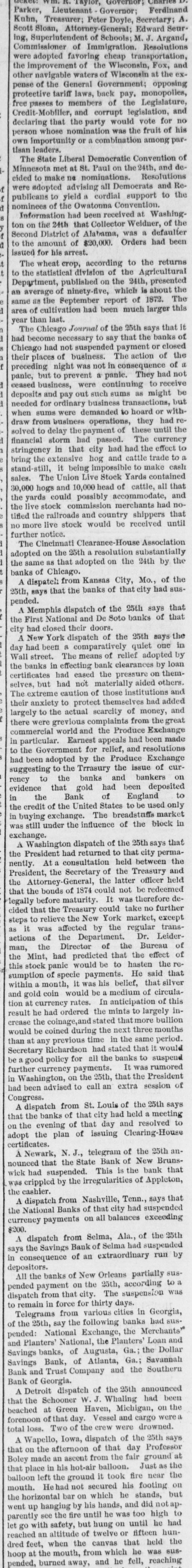 wm. R. Taylor, Governor; Parker, Lieutenant Governor; Ferdinand Kuhn, Treasurer; Peter Doyle, Secretary; A. Scott Sloan, Attorney-General; Edward Seuring, Superintendent of Schools; M. Argand, Commissioner of Immigration. Resolutions were adopted favoring cheap transportation, and the improvement of the Wisconsin, Fox, other navigable waters of Wisconsin at the expense of the General Government; opposing protective tariff laws, back pay. monopolies, to members of the Legislature, and corrupt and that the party would his no declaring free Credit-Mobilier, passes legislation, vote fruit for of person whose nomination was the own Importunity or a combination among partisan lenders. The State Liberal Democratic Convention de- of Minnesota met at St. Paul on the 24th, and eided to make ne nominations. Resolutions Rewere adopted advising all Democrats and to the publicans to yield cordial support nominees of the Owatonna Convention. Information had been received at Washing- of the 24th that Collector Weidner, defaulter the ton Second on District of Alabama, was a had been to the amount of $20,000. Orders issued for his arrest. The wheat crop, according to the returns to the statistical division of the Agricultural presented Department, published on the 24th, the average of ninety-five, which is 1872. about The an the September report of this same area of as cultivation had been much larger than last. year Journal of the 25th says that of it necessary to say that not suspended payment the Chicago had The become Chicago had the or banks of closed places of business. The action of a preceding their night was not in consequence had not but to prevent a panic. They receive ceased panic, business, were continuing might to be deposits and pay out such sums as but needed for ordinary business transactions, withsums were demanded to hoard or draw when from business operations, they until had the solved to delay the payment of these currency storm had passed. The stringency financial in that city had had the trade effect extensi hog and cattle stand-still, bring the it being impossible to make cash sales. The Union Live Stock Yards contained that 30,000 hogs and 10,000 head of cattle, all and the yards could possibly accommodate, had nostock commission merchants the live the railroads and country shippers until that tifled more live stock would be received further notice. The Cincinnati Clearance- House Association on the 25th resolution substantially the adopted the same as that adopted on the 24th by banks of Chicago. dispatch from Kansas City, Mo., had of sus- the 25th, A says that the banks of that city pended. Memphis dispatch of the 25th says of that that the First National and De Soto banks had closed their doors. city New York dispatch of the 25th says the in A a comparatively quiet one Wall street. day had been The means of relief adopted loan by banks in effecting bank clearances by themthe had eased the pressure on certificates selves, but had not materially aided others. and to protect The extreme caution of those themselves institutions had added their anxiety the actual scarcity of money, and largely were to grevious complaints from the great there world and the Produce Exchange made commercial Earnest appeals had been in particular. the Government for relief, and resolutions Exchange to had been adopted by the Produce of curto the Trrasury the issue suggesting to the banks and bankers on rency that gold had been deposited to evidence in the Bank of England be used only credit of the United States to market the exchange. The breadstuffs block in in was buying still under the influence of the exchange. Washington dispatch of the 25th says that A President had returned to that city perma- the the At consultation held between and nently. the Secretary of the Treasury President, General, the latter officer redeemed held that the Attorney the bonds of 1874 could not therefore be debefore maturity. It was take no further legally that the Treasury could relieve cided the New York market, except transsteps to affected by the regular Leiderof Director as actions it was of the Department. the Dr. Bureau of man, the had predicted that the effect the of be to of specie payments. this sumption the stock Mint, panic would hasten He that said silver that it was his belief, within month, be medium of circularates. In the mints to tion and gold at currency had coin ordered would anticipation largely bullion of this inresult he the coinage,and stated that more months crease be coined during the next three period. would previous time in the same than at any Richardson had stated that it would Secretary good policy for all the banks was to rumored suspend be a currency payments. It the President further on the 25th, that session of had in Washington, been advised to call an extra Congress. from St. Louis of the 25th meeting says A dispatch banks of that city had held resolved to that the evening of that day and on adopt the the plan of issuing Clearing-House certificates. N. J., telegram of New the 25th Bruns- an A Newark, that the State Bank of bank that nounced suspended. This is the Appleton, wick had yas crippled by the irregularities of the cashier. from Nashville, Tenn., suspended says that A dispatch Banks of that city had exceeding currency the National payments on all balances $200. from Selma, Ala., of suspended the 25th the Savings run in says A consequence dispatch of Bank an of extraordinary Selma had by depositors. All the banks of New Orleans according partially sus- to from pended payment that on city. the 25th, The suspension was to dispatch in force for thirty days. in remain from various cities Georgia, had susTelegrams 25th, say the following banks Merchants* of the Exchange, the pended: National the Planters' Loan and and Planters' Ga. the Dollar Savings Ga.; banks, Bank, National, of of Augusta, Atlanta, Savannah Southern Bank and Savings Trust Company and the Bank of Georgia. of the 25t