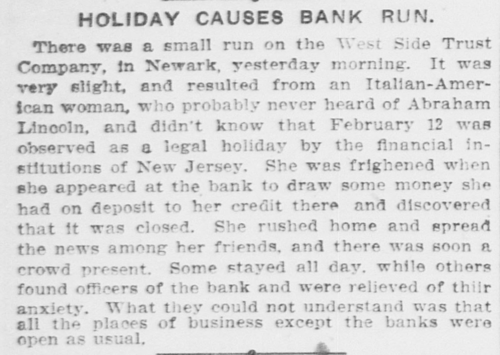HOLIDAY CAUSES BANK RUN. There was a small run on the West Side Trust Company, in Newark, yesterday morning. It was very slight, and resulted from an Italian-American woman, who probably never heard of Abraham Lincoln, and didn't know that February 12 was observed as a legal holiday by the financial institutions of New Jersey. She was frighened when she appeared at the bank to draw some money she had on deposit to her credit there and discovered that it was closed. She rushed home and spread the news among her friends, and there was soon a crowd present. Some stayed all day. while others found officers of the bank and were relieved of thiir anxiety. What they could not understand was that all the places of business except the banks were open as usual.