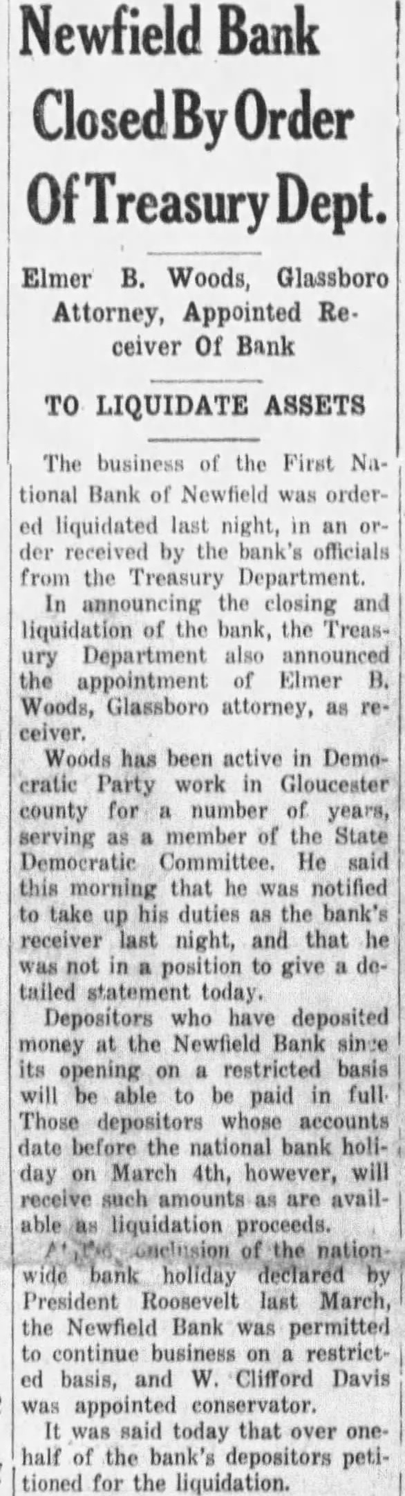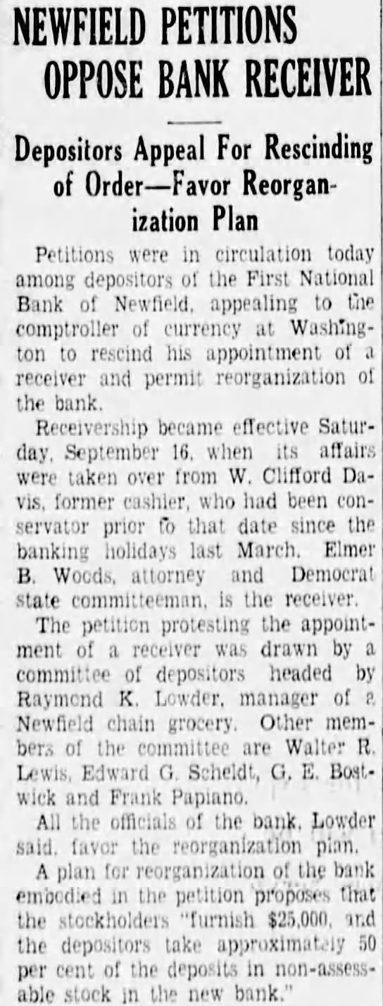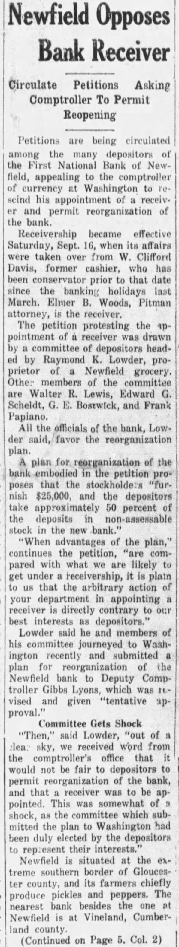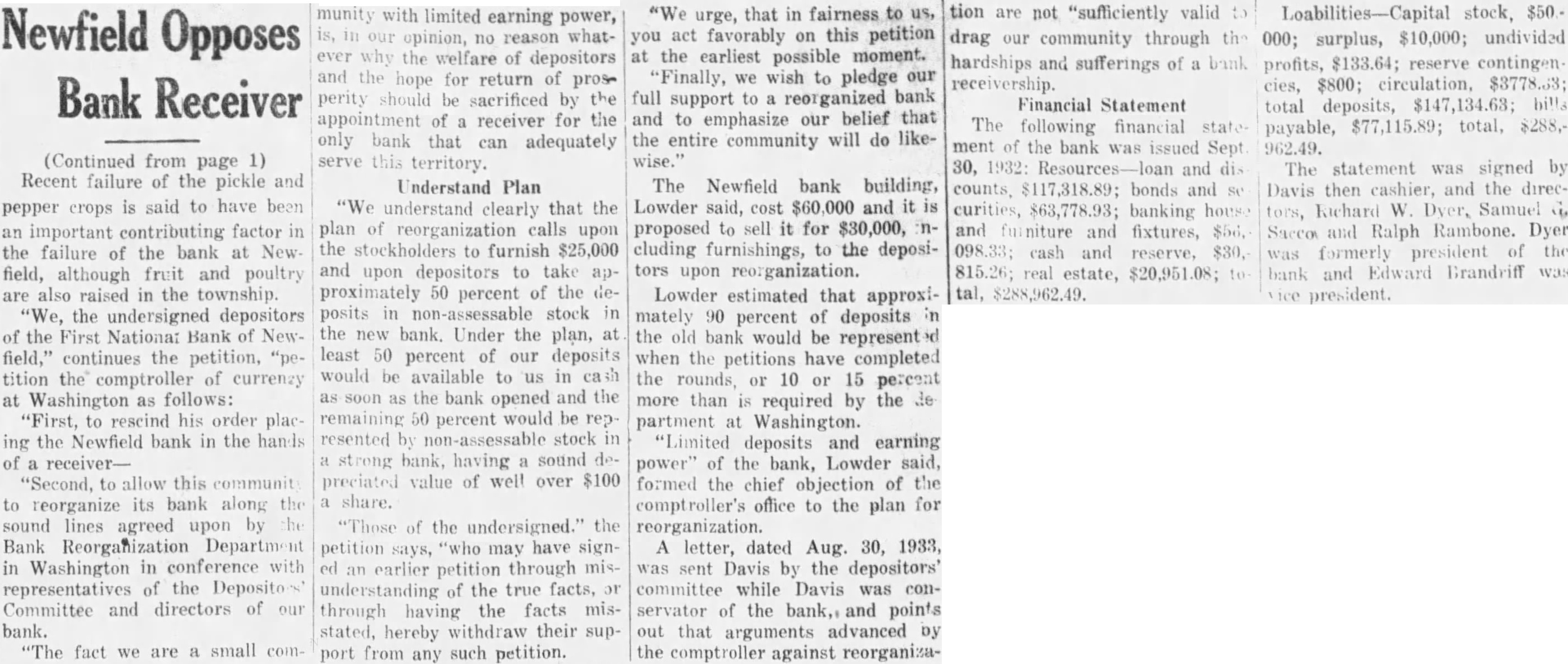 (Continued from page 1) Recent failure of the pickle and pepper crops is said to have been an important contributing factor in the failure of the bank at New field, although fruit and poultry are also raised in the township. "We, the undersigned depositors of the First National Bank of Newfield," continues the petition, "petition the comptroller of currenzy at Washington as follows: "First, to rescind his order placing the Newfield bank in the hands of a receiver"Second, to allow this community to reorganize its bank along the sound lines agreed upon by the Bank Reorganization Department in Washington in conference with representatives of the Depositors' Committee and directors of our bank. "The fact we are a small com- munity with limited earning power, is, in our opinion, no reason whatever why the welfare of depositors and the hope for return of prosperity should be sacrificed by the appointment of a receiver for the only bank that can adequately serve this territory.