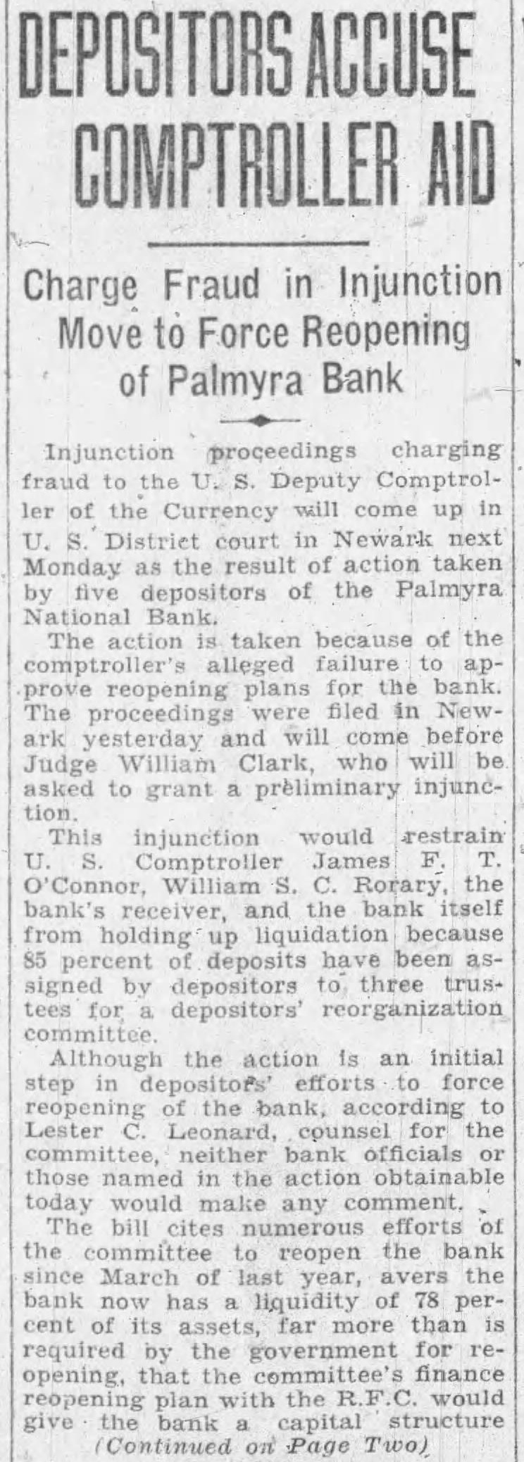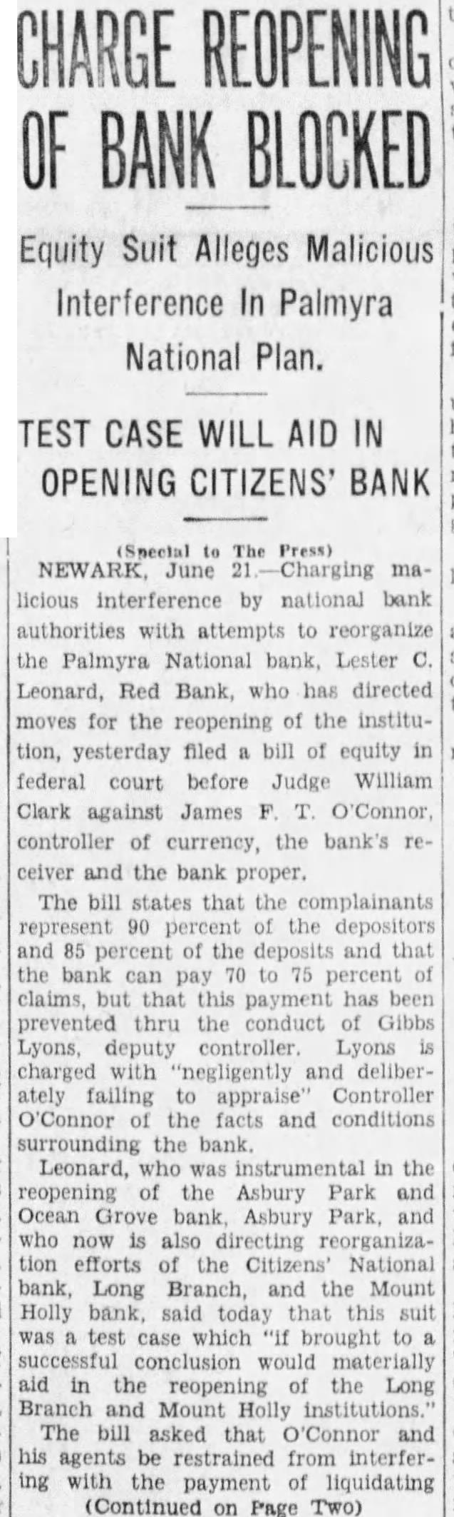 CHARGE REOPENING BANK BLOCKED Equity Suit Alleges Malicious Interference In Palmyra National Plan. TEST CASE WILL AID IN OPENING CITIZENS' BANK Press) NEWARK, June licious interference by national bank authorities with attempts to reorganize the Palmyra National bank, Lester Leonard, Red Bank, who has directed moves for the reopening of the institution, yesterday filed bill of equity federal court before Judge William Clark against James controller of currency, the bank's ceiver and the bank proper. The bill states that the complainants represent percent the depositors and 85 percent of the deposits and that the bank can pay percent claims, that this payment has prevented thru the conduct Gibbs Lyons, deputy controller Lyons charged "negligently and deliberately failing to appraise' Controller O'Connor the and conditions surrounding the Leonard, instrumental in the reopening the Asbury Park and Ocean Asbury Park, and who directing reorganizaefforts the National bank, Long Branch, and the Mount Holly bank, this suit test brought would aid in the reopening the Long Branch Mount institutions The bill asked that and his agents be restrained interfering with the payment liquidating (Continued on Page Two)