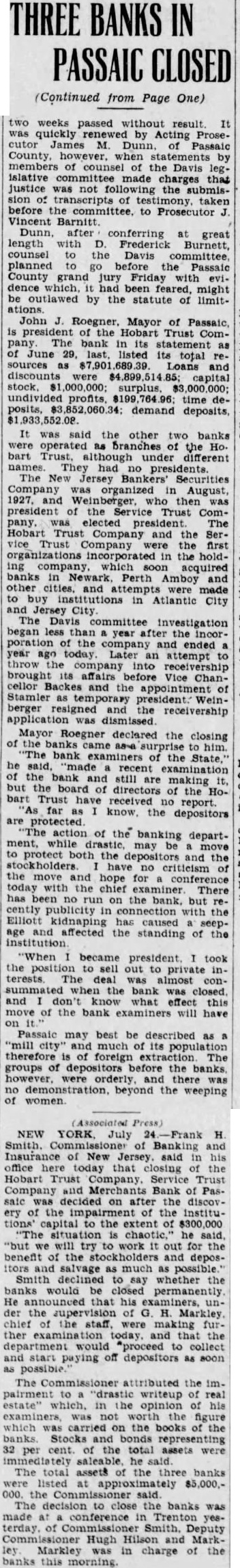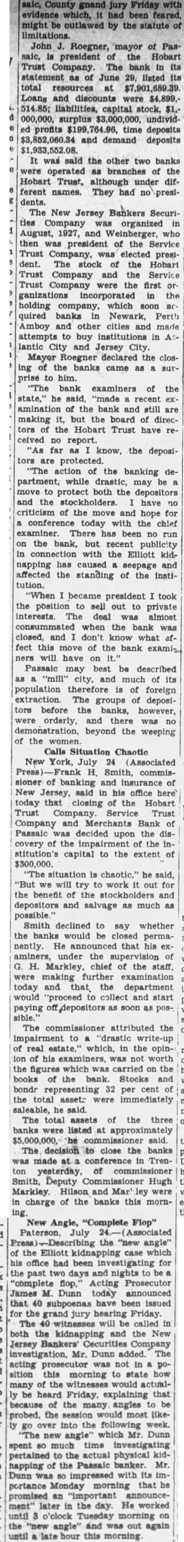 The extent of this drying up process has been from the scandal, position the New Jersey Bankers and every with and the recent kidnsping of Willard H. then the Hobart's executive and resignation and that his the bank was responsible the act siolence combined hasten up process, that the past weeks Hodeposits have shrunk the extent of In statement Smith said that the of Hobart Service and the Merchants Bank decided upon of the covery the impairment of the institution's capital to the extent