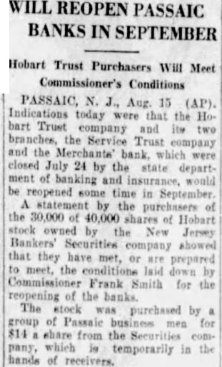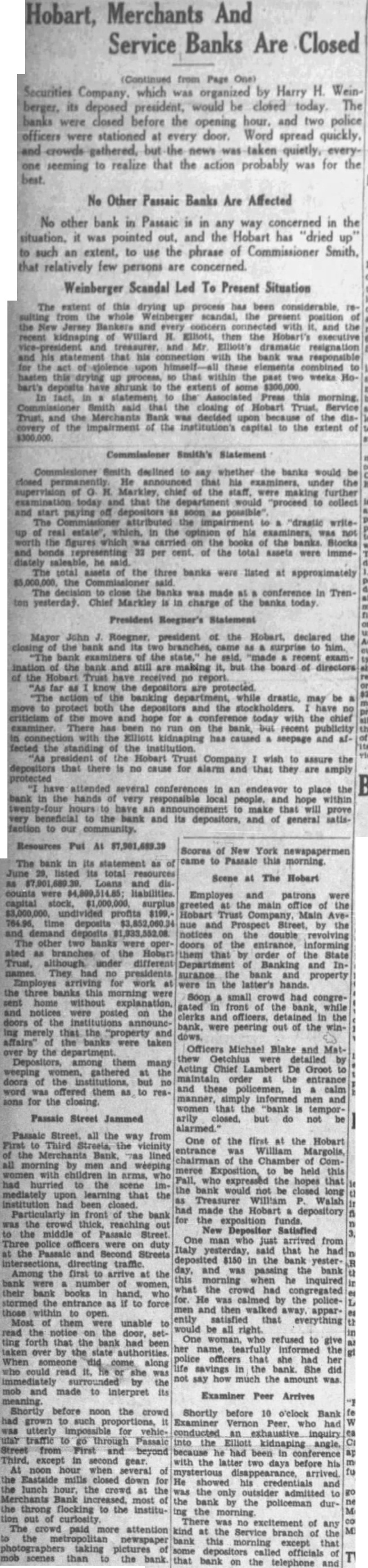 Employes and patrons were greeted the main office of the Hobart Company, Main Aveand Prospect Street, by the double revolving doors of the entrance, informing that order of State Department of Banking and Insurance bank property were the latter's hands. small crowd had congrefront of bank, while clerks and officers, detained in the bank, were peering out of the winOfficers Michael Blake and MatGetchius were detailed by Acting Chief De Groot maintain order at the entrance and these calm manner, informed men women that the "bank temporarily closed. not be One of the first at the Hobart entrance William Margolis, chairman of the Chamber of Commerce be held this Fall, expressed the hopes that the bank would not closed Treasurer William Walsh had made the Hobart depository for exposition funds. New Depositor Satisfied One man who just arrived Italy yesterday, that he had deposited $150 in yesterand passing the bank inquired what the crowd had congregated for. He calmed by the policeand then walked away apparently satisfied that everything would be all right. One refused to give her name tearfully informed the police her life savings the bank. She did not say how much the amount was