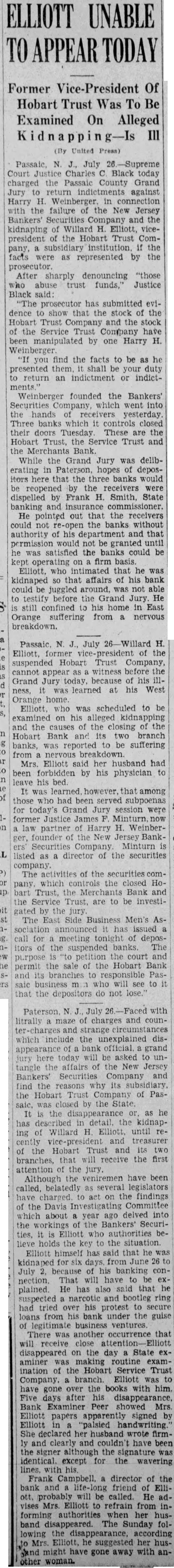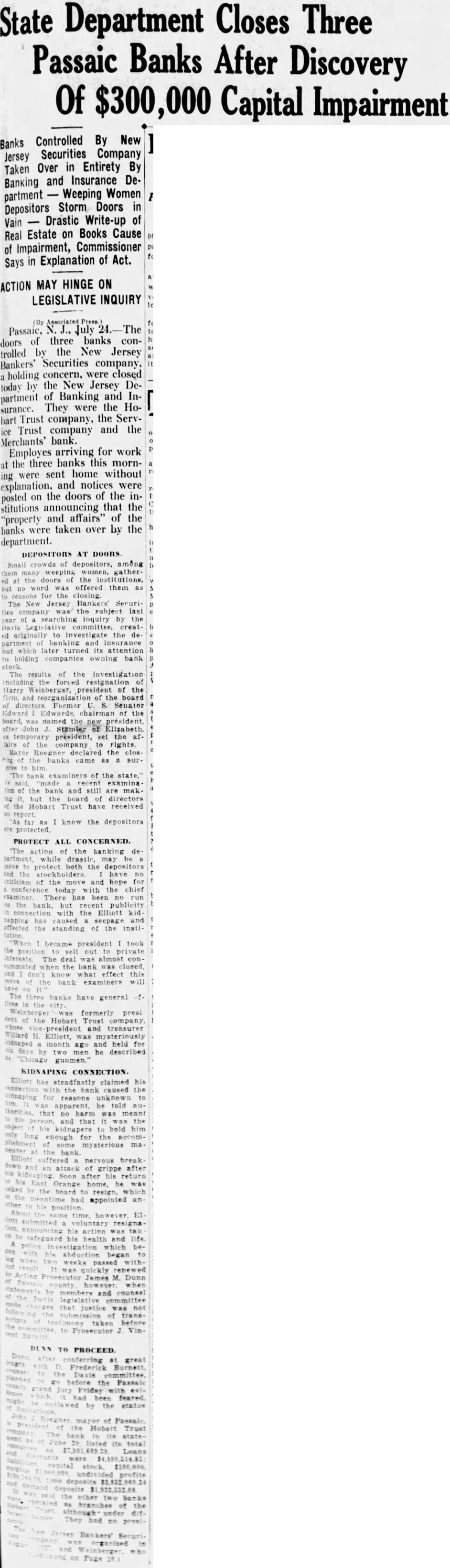 State Department Closes Three Passaic Banks After Discovery Of $300,000 Capital Impairment Banks Controlled By New Jersey Securities Company Taken Over in Entirety By Banking and Insurance Department - Weeping Women Depositors Storm Doors in Vain Drastic Write-up of Real Estate on Books Cause of Impairment, Commissioner Says in Explanation of Act. ACTION MAY HINGE ON LEGISLATIVE INQUIRY (By Associated Passaic, N. J., July 24. The doors of three banks controlled by the New Jersey Bankers' Securities company. holding concern, were closed today by the New Jersey Department of Banking and Insurance. They were the Hobart Trust company, the Service Trust company and the Merchants' bank. Employes arriving for work at the three banks this morning were sent home without explanation, and notices were posted on the doors of the institutions announcing that the "property and affairs' of the banks were taken over by the department. DEPOSITORS AT DOORS crowds of depositors, among gatherthe doors the word offered as The New last inquiry by the its attention bank of the president of the and the board Senator chairman of the Stamler set the declared the "The and board Hobart Trust the depositors drastic depositors the Elliott caused seepage The general formerly presi Hobart Trust company and held for he described KIDN APING CONNECTION. steadfastly his meant of Soon his his East board appointed and which began to passed quickly James to Prosecutor TO Friday undivided 34 other