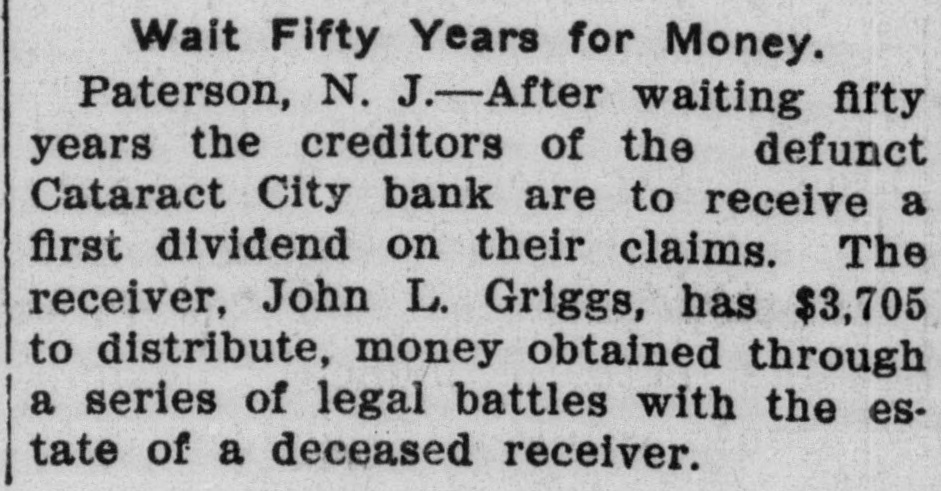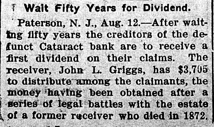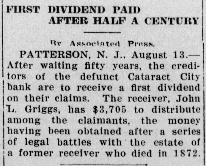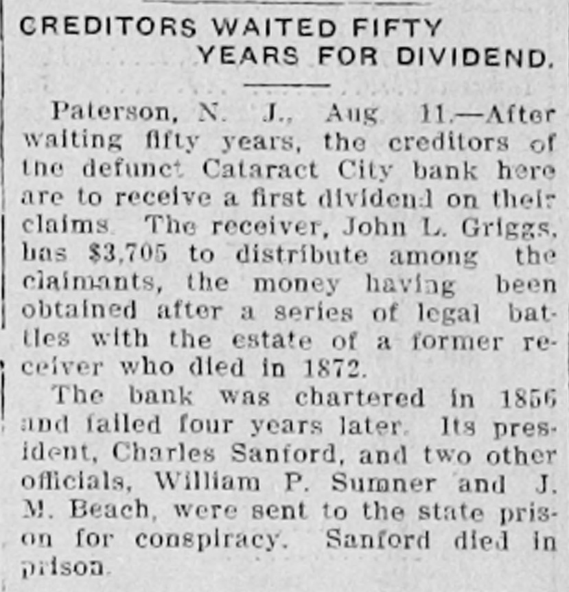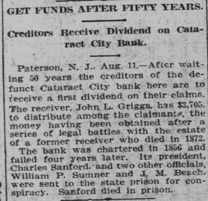 GET FUNDS AFTER FIFTY YEARS. Creditors Receive Dividend on Cataract City Bank. Paterson, N. J., Aug. 11.-After waiting 50 years the creditors of the defunct Cataract City bank here are to receive a first dividend on their claims. The receiver, John L. Griggs, has $3,705, to distribute among the claimants, the money having been obtained after a series of legal battles with the estate of a former receiver who died in 1872. The bank was chartered in 1856 and failed four years later. Its president, Charles Sanford. and two other officials, William P. Sumner and J. M. Beach, were sent to the state prison for conspiracy. Sanford died in prison.