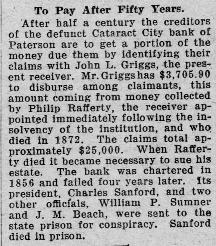 To Pay After Fifty Years. After half a century the creditors of the defunct Cataract City bank of Paterson are to get a portion of the money due them by identifying their claims with John L. Griggs, the present receiver. Mr. Griggshas $3,705.90 to disburse among claimants, this amount coming from money collected by Philip Rafferty, the receiver appointed immediately following the insolvency of the institution, and who died in 1872. The claims total approximately $25,000. When Rafferty died it became necessary to sue his estate. The bank was chartered in 1856 and failed four years later. Its president, Charles Sanford, and two other officials, William P. Sumner and J. M. Beach, were sent to the state prison for conspiracy. Sanford died in prison.