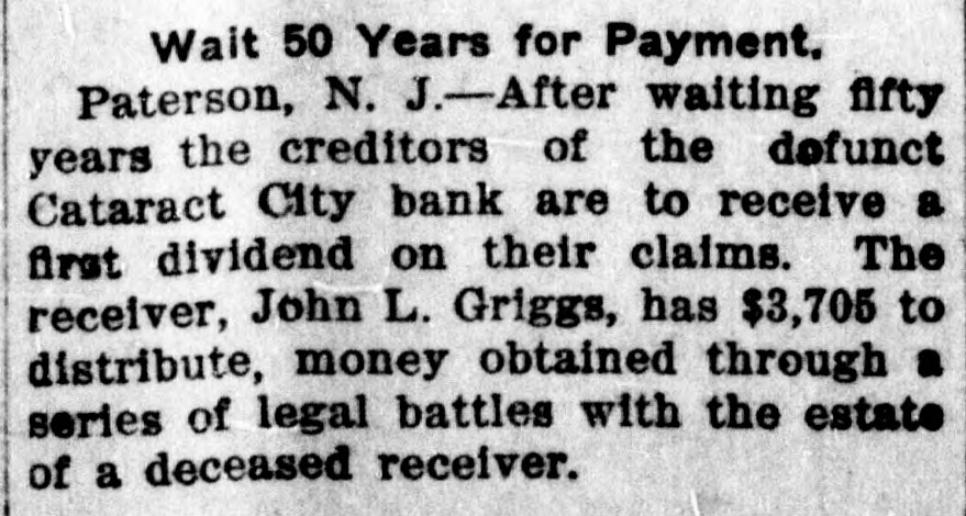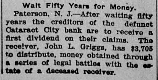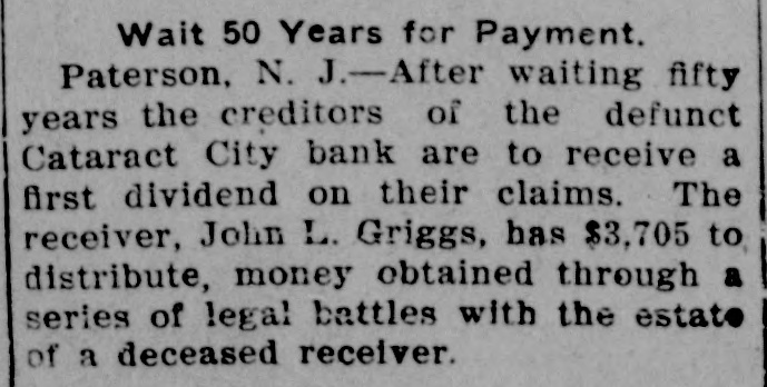 Wait 50 Years for Payment. Paterson, N. J.-After waiting fifty years the creditors of the defunct Cataract City bank are to receive a first dividend on their claims. The receiver, John L. Griggs, has $3,705 to distribute, money obtained through a series of legal battles with the estate of a deceased receiver.