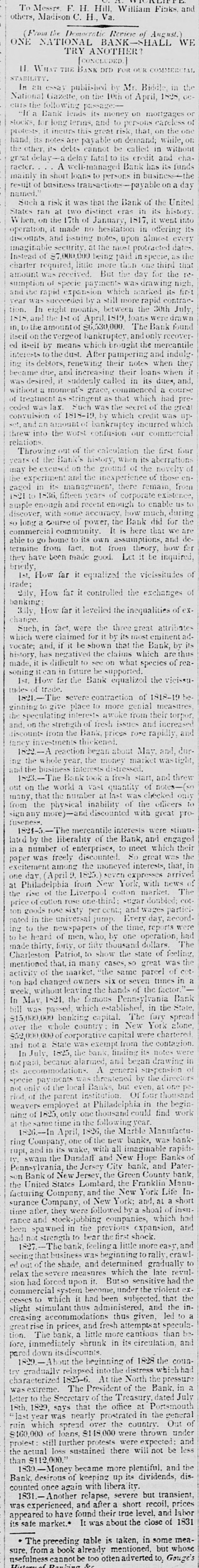 To Messrs. F. H. Hill, William Finks, and others, Madison C. H., Va. (From the Democratic Review of August.) # ONE NATIONAL BANK-SHALL WE TRY ANOTHER? [CONCLUDED.] II. WHAT THE BANK DID FOR OUR COMMERCIAL STABILITY. In an essay published by Mr. Biddle, in the National Gazette, on the 10th of April, 1828, occurs the following passage:- "If a Bank lends its money on mortgages or stocks, for long terms, and to persons careless of protests, it incurs this great risk, that, on the one hand, its notes are payable on demand; while, on the other, its debts cannot be called in without great delay-a delay fatal to its credit and character. . . A well-managed Bank has its funds mainly in short loans to persons in business-the result of business transactions-payable on a day named." Such a risk it was that the Bank of the United States ran at two distinct eras in its history. When, on the 17th of January, 1817, it went into operation, it made no hesitation in offering its discounts, and issuing notes, upon almost every imaginable security, at the most protracted dates. Instead of $7,000,000 being paid in specie, as the charter required, little more than one third that amount was received. But the day for the resumption of specie payments was drawing nigh, and the rapid expansion which marked its first year was succeeded by a still more rapid contraction. In eight months, between the 30th July, 1818, and the 1st of April, 1819, loans were drawn in, to the amount of $6,530,000. The Bank found itself on the verge of bankruptcy, and only recovered itself by means which brought the mercantile interests to the dust. After pampering and indulging its debtors, renewing their notes when they became due, and increasing their loans when it was desired, it suddenly called in its dues, and, without a moment's grace, commenced a course of treatment as stringent as that which had preceded was lax. Such was the secret of the great convulsion of 1818-19, by which credit was upset, and an amount of bankruptcy incurred which threw into the worst confusion our commercial relations. Throwing out of the calculation the first four years of the Bank's history, when its aberrations may be excused on the ground of the novelty of the experiment and the inexperience of those engaged in its management, there remain, from 1821 to 1836, fifteen years of corporate existence, ample enough and recent enough to enable us to discover, with some accuracy, how much, during so long a course of power, the Bank did for the commercial community. It is here that we are able to go home to its own assumptions, and determine from fact, not from theory, how far they have been made good. Let it be inquired, briefly, 1st, How far it equalized the vicissitudes of trade; 2dly, How far it controlled the exchanges of banking; 3dly, How far it levelled the inequalities of exchange. Such, in fact, were the three great attributes which were claimed for it by its most eminent advocate; and, if it be shown that the Bank, by its history, has negatived the claims which are thus made, it is difficult to see on what species of reasoning it can in future be supported. 1st. How far the Bank equalized the vicissitudes of trade. 1821. The severe contraction of 1818-19 beginning to give place to more genial measures, the speculating interests awoke from their torpor, and, on the strength of fresh issues and increased discounts from the Bank, prices rose rapidly, and fancy investments thickened. 1822. A reaction began about May, and, during the whole year, the money market was tight, and the business interests distressed. 1823.-The Bank took a fresh start, and threw out on the world a vast quantity of notes-(so many, that the number at last was checked only from the physical inability of the officers to sign any more)-and discounted with great profuseness. 1824-5-The mercantile interests were stimulated by the liberality of the Bank, and engaged in a number of enterprises, to meet which their paper was freely discounted. So great was the excitement among the moneyed interests, that, in one day, (April 9, 1825,) seven expresses arrived at Philadelphia from New York, with news of the rise of the Liverpool cotton market. The price of cotton rose one-third; sugar doubled; cotton goods rose sixty per cent.; and wages participated in the universal jump. Every day, according to the newspapers of the time, reports were to be heard of men, who, by one operation, had made thirty, forty, or fifty thousand dollars. The Charleston Patriot, to show the state of feeling, mentioned that, in many cases, so great was the activity of the market, "the same parcel of cotton had changed owners six or seven times in a week, without leaving the hands of the factor."- In May, 1821, the famous Pennsylvania Bank bill was passed, which established, in the State, $15,000,000 banking capital. The fury spread over the whole country; in New York alone, $52,000,000 of corporative capital were chartered, and not a State was exempt from the contagion. In July, 1825, the bank, finding its notes were not paid, became alarmed, and began drawing in its accommodations. A general suspension of specie payments was threatened by the directors not only of the local Banks, but even, at one period, of the parent institution. Of four thousand weavers employed at Philadelphia in the beginning of 1825, only one thousand could find work at the same time in the following year. 1826.-In April, 1826, the Marble Manufacturing Company, one of the new banks, was bankrupt, and in its wake, with all imaginable rapidity, swam the Dundaff and New Hope Banks of Pennsylvania, the Jersey City bank, and Paterson Bank of New Jersey, the Green County bank, the United States Lombard, the Franklin Manufacturing Company, and the New York Life Insurance Company, of New York; and, at a short time after, they were followed by a shoal of insurance and stock-jobbing companies, which had been spawned in the previous expansion, and had not 