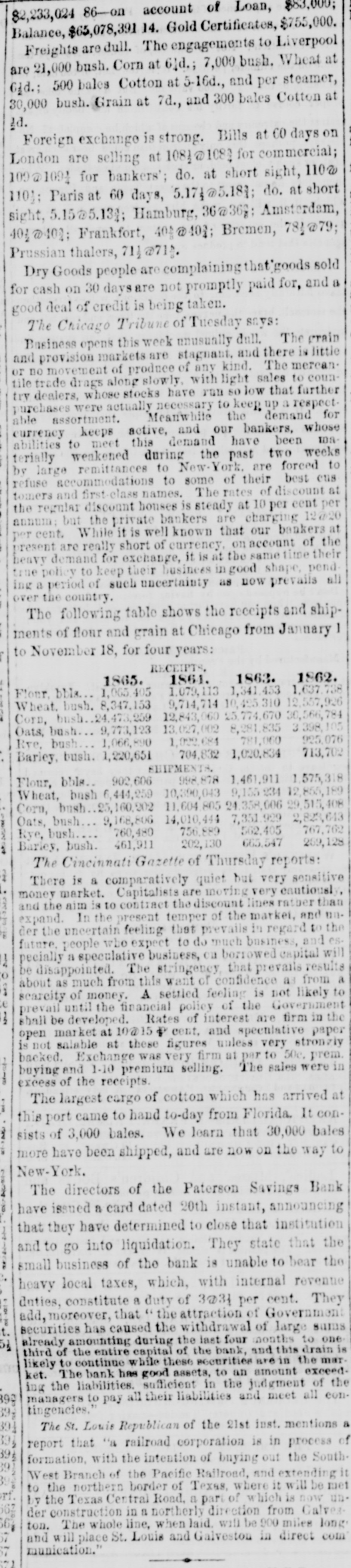 30,000 2d. Foreign exchange is strong. Bills at CO days on London are selling at 1081 @1083 for commercial; 109@1094 for bankers'; do. at short sight, 110.20 1101; Paris at 60 days, 5.171@5.183; do. at short sight,5.15@5.13} Hamburg, 36@368; Amsterdam, 4012402 Frankfort, 404@401; Bremen, 784@79; Prussian thalers, 711 @71). Dry Goods people are complaining that) "goods sold for cash on 30 daysare not promptly paid for, and a good deal of credit is being taken. The Chicago Tribune of Tuesday says: Business opens this week unusually dull. The grain and provision markets are stagnant. and there is little or no movement of produce of any kind. The mercan tile trade drags along slowly, with light sales to country dealers, whose stocks have run so low that further purchases were actually necessary to keep up a respectable assortment. Meanwhite the demand for currency keeps active, and our bankers, whose abilities to meet this demand have been 108 terially weakened during the past two weeks by large remittances to New-York. are forced to refuse accommodations to some of their best cus tomers and first class names. The rates of discount at the regular discount houses is steady at 10 per cent per annum but the private bankers are charging 12@20 per cent. While it is well known that our bankers at present are really short of currency, on account of the heavy demand for exchange, it is at the same time their true policy to keep their business in good shape, pend ing a period of such uncertainty as now prevails all over the country. The following table shows the receipts and shipments of flour and grain at Chicago from January 1 to November 18, for four years: RECEIPTS 1862. 1863. 1861. 1865. Flour, bblx 1,065,405 1.079.113 1,341,453 1,637,738 Wheat bush. 8,347,153 9,714,714 10,425.310 12,557,926 bush 24,473,259 12,843,060 25,774,670 30,566,784 Corn, Oats, bush 9,773,123 13.027.002 8,281,835 3 398,105 925,076 781,060 1,022,684 1,066,890 Rye. bush 713,702 1,020,834 704,832 Barley, bush. 1,220,651 SHIPMENTS. 1,575,318 1,461,911 998,878 902.606 Flour, bble Wheat, bush 6,444,259 10,390,043 9,155 234 12,855,189 Corn, bush 25,160,202 11,604,805 24.358.006 29,515,408 Oats, bush 9,168,806 14,010,444 7,351,929 2,823,643 767,762 562,405 756,889 760,480 Rye, bush 665,547 259,128 202,130 Barley, bush. 461,911 : The Cincinnati Gazette of Thursday reports: 1 There is a comparatively quiet but very sensitive money market. Capitalists are moving very cautiously, and the aim is to contract the discount lines rather than expand. In the present temper of the market, and 111. der the uncertain feeling that prevails in regard to the future. people who expect to do much business, and es. specially a speculative business, on borrowed capital will 1 be disappointed. The stringency that prevails results O about as much from this want of confidence as from a 1 scarcity of money. A settled feeling is not likely to prevail until the financial policy of the Government 1/2 shall be developed. Rates of interest are firm in the open market at 10@15 P cent. and speculative paper is not salable at these figures unless very stronzly backed. Exchange was very firm at par to 50c. prem. buying and 1-10 premium selling. The sales were in excess of the receipts. The largest cargo of cotton which has arrived at this port came to hand to-day from Florida. It consists of 3,000 bales. We learn that 30,000 bales more have been shipped, and are now on the way to New-York. The directors of the Paterson Savings Bank have issued a card dated 20th instant, announcing that they have determined to close that institution and to go into liquidation. They state that the small business of the bank is unable to bear the heavy local taxes, which, with internal revenue duties, constitute a duty of 3@31 per cent. They 4 add, moreover, that the attraction of Government I t. securities has caused the withdrawal of large sums already amounting during the last four months to one 51 third of the entire capital of the bank, and this drain is likely to continue while these securities Brein the mar. ket. The bank has good assets, to an amount exceed. ing the liabilities. sufficient in the judgment of the 39 managers to pay all their liabilities and meet all contingencies." 39, 394 The St. Louis Republican of the 21st just. mentions a report that "is railroad corporation is in process of 39 formation, with the intention of buying out the SouthWest Branch of the Pacific Railroad, and extending it to the northern border of Texas, where it will be met by the Texas Central Road, a pari of which is now under construction in a northerly direction from Galveston. The whole line, when laid. will be 900 miles long and will place St. Louis and Galveston in direct com munication."