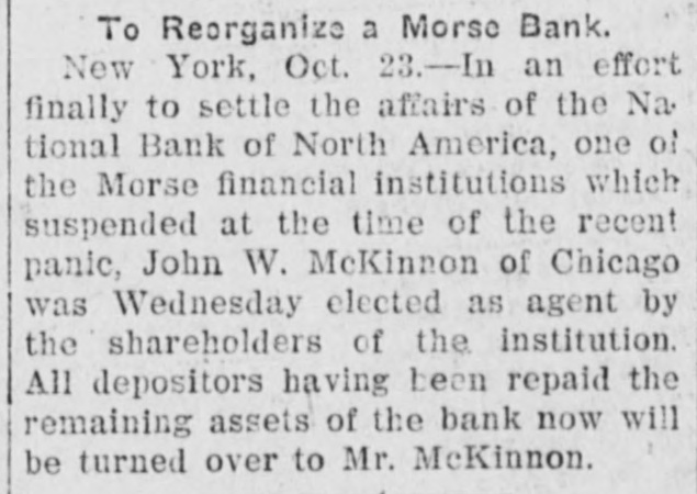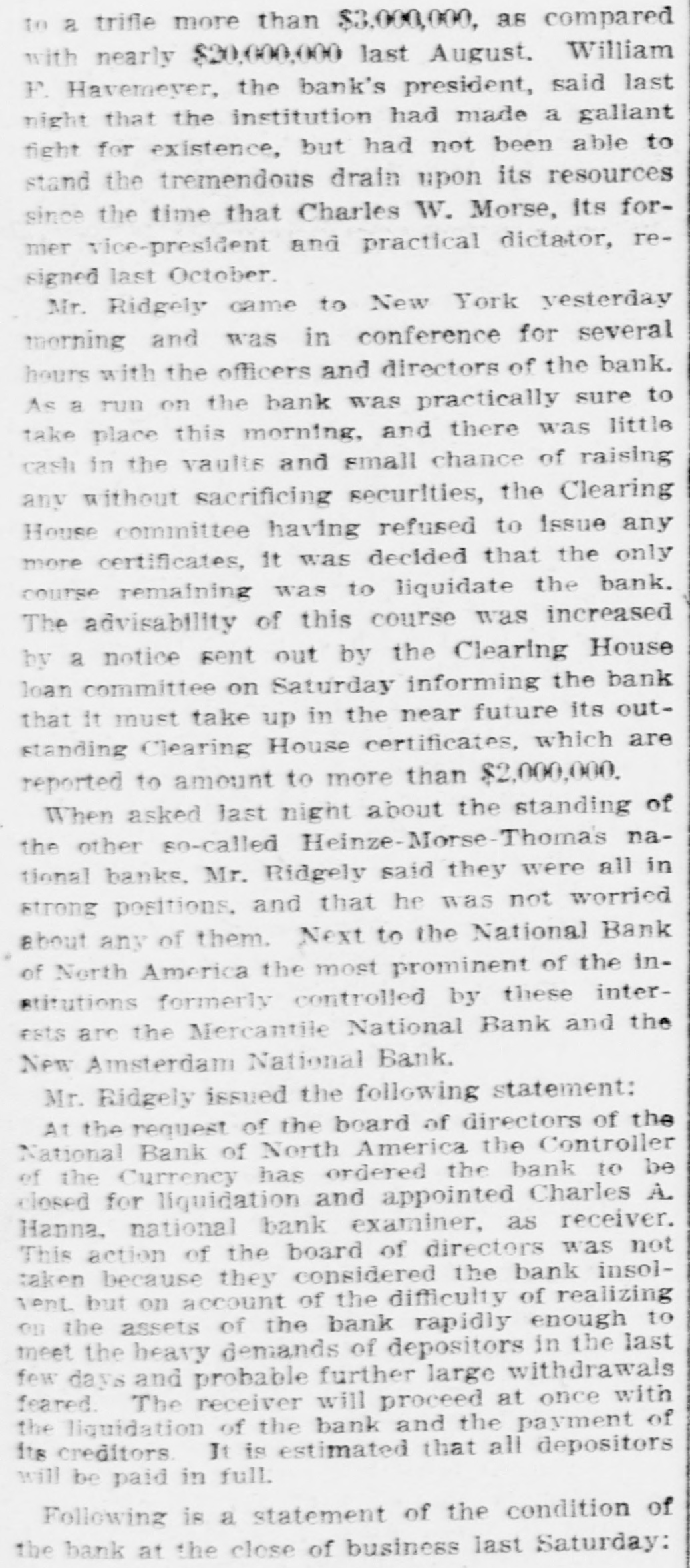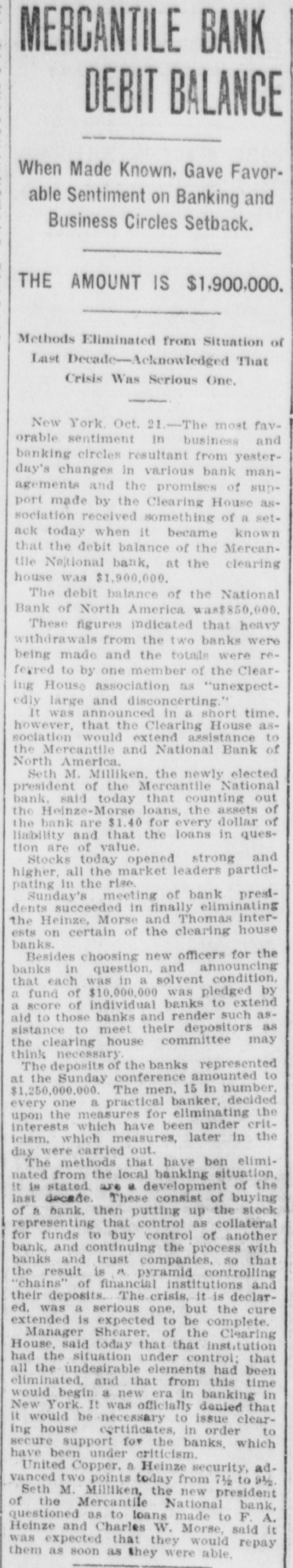 MERCANTILE BANK DEBIT BALANCE When Made Known. Gave Favorable Sentiment on Banking and Business Circles Setback. THE AMOUNT IS $1,900,000. Methods Eliminated from Situation of Last Decade-Acknowledged That Crisis Was Serious One. New York. Oct. 21.-The most favorable sentiment in business and banking circles resultant from yesterday's changes in various bank managements and the promises of support made by the Clearing House association received something of a setack today when it became known that the debit balance of the Mercantile National bank, at the clearing house was $1,900,000. The debit balance of the National Bank of North America was$850,000. These figures indicated that heavy withdrawals from the two banks were being made and the totals were referred to by one member of the Clearing House association as "unexpectedly large and disconcerting." It was announced in a short time. however, that the Clearing House association would extend assistance to the Mercantile and National Bank of North America. Seth M. Milliken, the newly elected president of the Mercantile National bank. said today that counting out the Heinze-Morse loans, the assets of the bank are $1.40 for every dollar of liability and that the loans in ques~ tion are of value. Stocks today opened strong and higher, all the market leaders participating in the rise. Sunday's meeting of bank prestdents succeeded in finally eliminating the Heinze, Morse and Thomas interests on certain of the clearing house banks. Besides choosing new officers for the banks in question, and announcing that each was in a solvent condition, a fund of $10,000,000 was pledged by a score of individual banks to extend aid to those banks and render such assistance to meet their depositors as the clearing house committee may think necessary The deposits of the banks represented at the Sunday conference amounted to $1,250,000,000. The men, 15 in number, every one a practical banker, decided upon the measures for eliminating the interests which have been under criticism, which measures, later in the day were carried out. The methods that have ben eliminated from the local banking situation, it is stated are a. development of the last decade. These consist of buying of a bank. then putting up the stock representing that control as collateral for funds to buy control of another bank, and continuing the process with banks and trust companies, so that the result is a pyramid controlling "chains" of financial institutions and their deposits. The crisis, it is declared. was a serious one, but the cure extended is expected to be complete. Manager Shearer, of the Clearing House, said today that that institution had the situation under control; that all the undesirable elements had been eliminated, and that from this time would begin a new era in banking in New York. It was officially denied that it would be necessary to issue clearing house certificates, in order to secure support for the banks, which have been under criticism. United Copper, a Heinze security, advanced two points today from 73/2 to 9Β½. Seth M. Milliken, the new president of the Mercantile National bank, questioned as to loans made to F. A. Heinze and Charles W. Morse, said it was expected that they would repay them as soon as they were able.