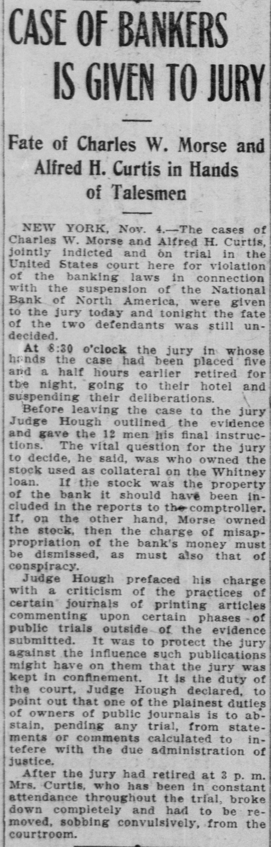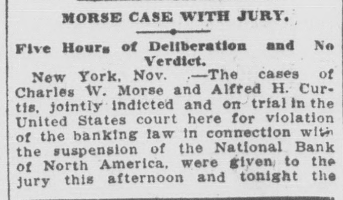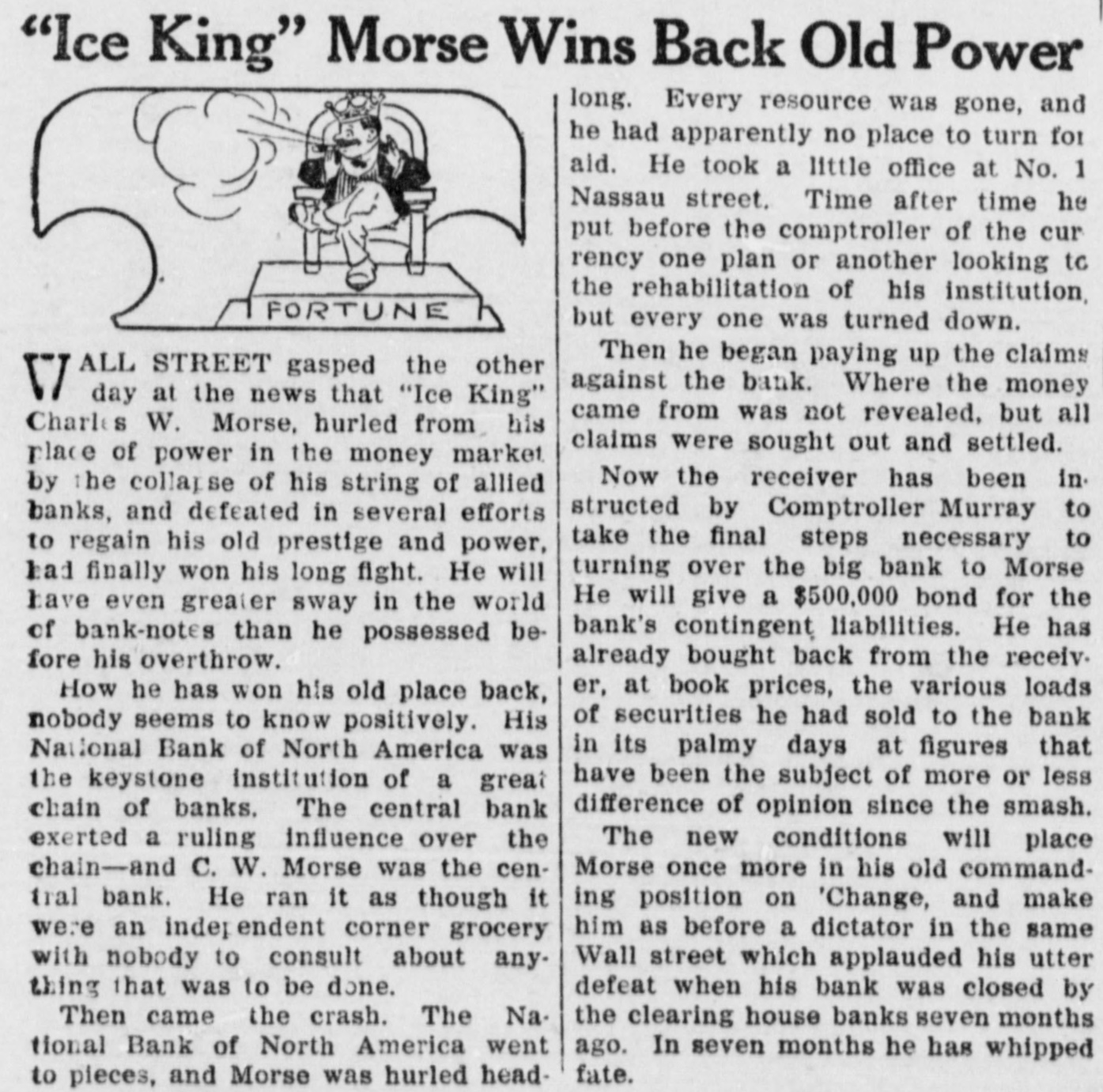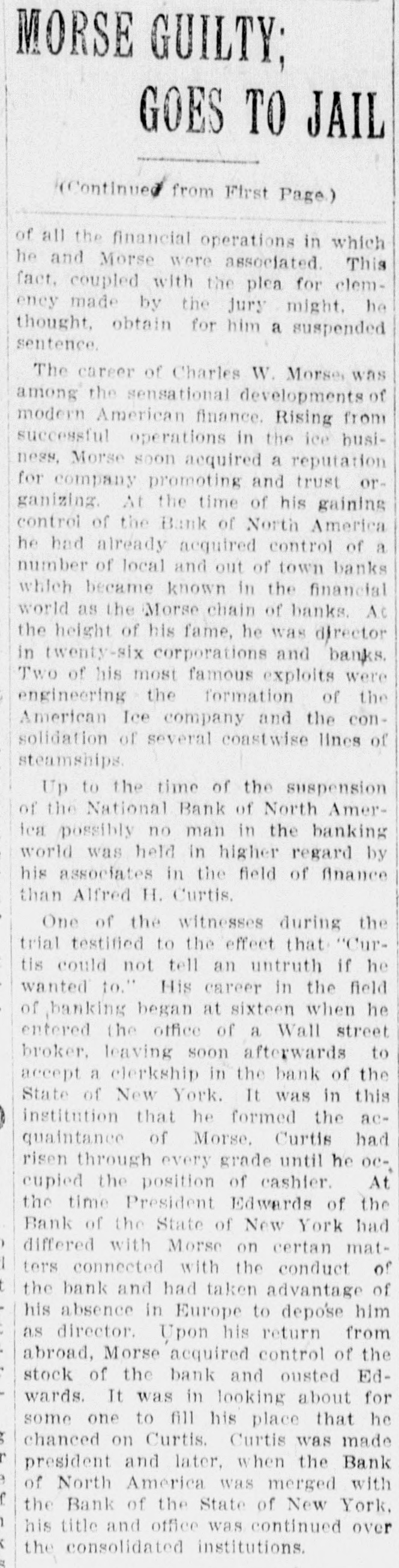 MERCANTILE BANK DEBIT BALANCE When Made Known. Gave Favorable Sentiment on Banking and Business Circles Setback. THE AMOUNT IS $1,900,000. Methods Eliminated from Situation of Last Decade-Acknowledged That Crisis Was Serious One. New York. Oct. 21.-The most favorable sentiment in business and banking circles resultant from yesterday's changes in various bank managements and the promises of support made by the Clearing House association received something of a setack today when it became known that the debit balance of the Mercantile National bank, at the clearing house was $1,900,000. The debit balance of the National Bank of North America was$850,000. These figures indicated that heavy withdrawals from the two banks were being made and the totals were referred to by one member of the Clearing House association as "unexpectedly large and disconcerting." It was announced in a short time. however, that the Clearing House association would extend assistance to the Mercantile and National Bank of North America. Seth M. Milliken, the newly elected president of the Mercantile National bank. said today that counting out the Heinze-Morse loans, the assets of the bank are $1.40 for every dollar of liability and that the loans in ques~ tion are of value. Stocks today opened strong and higher, all the market leaders participating in the rise. Sunday's meeting of bank prestdents succeeded in finally eliminating the Heinze, Morse and Thomas interests on certain of the clearing house banks. Besides choosing new officers for the banks in question, and announcing that each was in a solvent condition, a fund of $10,000,000 was pledged by a score of individual banks to extend aid to those banks and render such assistance to meet their depositors as the clearing house committee may think necessary The deposits of the banks represented at the Sunday conference amounted to $1,250,000,000. The men, 15 in number, every one a practical banker, decided upon the measures for eliminating the interests which have been under criticism, which measures, later in the day were carried out. The methods that have ben eliminated from the local banking situation, it is stated are a. development of the last decade. These consist of buying of a bank. then putting up the stock representing that control as collateral for funds to buy control of another bank, and continuing the process with banks and trust companies, so that the result is a pyramid controlling "chains" of financial institutions and their deposits. The crisis, it is declared. was a serious one, but the cure extended is expected to be complete. Manager Shearer, of the Clearing House, said today that that institution had the situation under control; that all the undesirable elements had been eliminated, and that from this time would begin a new era in banking in New York. It was officially denied that it would be necessary to issue clearing house certificates, in order to secure support for the banks, which have been under criticism. United Copper, a Heinze security, advanced two points today from 73/2 to 9Β½. Seth M. Milliken, the new president of the Mercantile National bank, questioned as to loans made to F. A. Heinze and Charles W. Morse, said it was expected that they would repay them as soon as they were able.