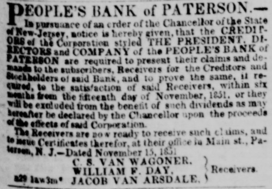 PEOPLE'S BANK of PATERSON.In pursuance of an order of the Chancellor of the State of New Jersey, notice is hereby given. that the CREDITORS of the Corporation styled THE PRESIDENT. DtRECTORS and COMPANY of the PEOPLE'S BANK of PATERSON are required to present their claims and demanda to the subscribers, Receivers for the Creditors and Stock holders of said Bank, and to prove the same, is required, to the satisfaction of said Receivers, within six meaths from the fitteenth day of November, 1831. or they will be excluded from the benefit of such dividends as may hereafter be declared by the Chancellor upon the proceeds of the effects of said Corporation. The Receivers are DO N ready to receive such claims, and to issue Certificates therefor, at their office in Main st., Palersen, N. J.-Dated November 15, 1831 C.S. VAN WAGONER. Receivers. WILLIAM F. DAY, law3m JACOB VAN ARSDALE.