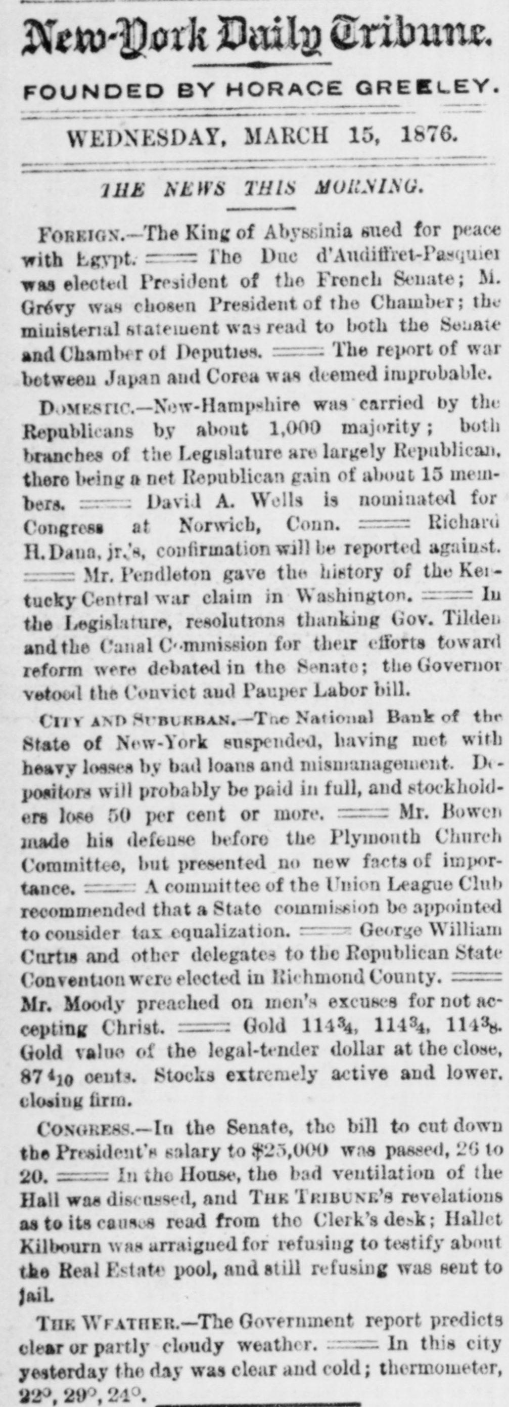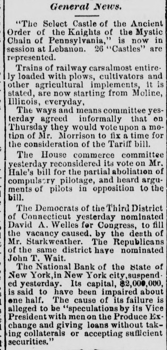 DOMESTIC NEWS. East. Some excitement was produced in New York financial circles, the past week, by the failure of the National Bank of the State of New York, in New York city. It is stated that customers and depositors will lose nothing by the suspension of the bank. Ex-President Woolsev, of Yale College, has written a letter on the Beecher business, in which he expresses & belief in the Plymouth pastor's innocence, but thinks he has acted unwisely. The poorhouse at Norwich, Ct., was recently destroyed ty fire. About a dozen of the inmates perished in the flames. New York papers announce the death of Mrs. Schurz, wife of ex-Senator Carl Schurz. West. The Chicago papers state that indictment for conspiracy to defraud the government has been found by the United States grand jury against Jasper D. Ward, formerly a member of Congress, and latterly United States district attorney. Chicago elevators, as per official returns, contain 3,198,007 bushels of wheat, 2,091,745 bushels of corn, 718,641 bushels of oats, 142,315 bushels of rye, and 389,963 bushels of barley, making a total of €,540,071 bushels, against 6,894,885 bushels at this period last year. The people of Cincinnati have voted to issue $6,000,000 bonds to the Cincinnati Southern railway, in addition to the $10,000,000 already issued. A party of 200 gold-hunters left Chicago for the Black Hills a few days ago. In the United States District Court at Chieago, last week, A. C. Hesing, Jacob Rhem and several of the indicted distillers pleaded guilty to the charge of conspiracy to defraud the Government. News comes from the far West that Gen. Crook, the famous Indian fighter, is making it exceedingly warm for the red-skins. He had left Fort Reno with fifteen days' rations, and struck out after the Indians known to be north of that place. Springfield, Ill., has had a disastrous conflagration, involving the destruction of Hon. Jacob Bunn's Opera-House, and three adjoining business edifices. The total loss is about $170,000. Mr. Bunn had no insurance on the opera-house. which cost $130,000 when built, ten years ag Although a number of emigrants en route to the Black Hills are snowed in upon the plains, and grave apprehensions are expressed as to their fate, the tide of emigration sweeps on toward that supposed new El Dorado with undiminished volume. A special train of twelve cars had to be sent out from Omaha the other day to accommodate the number on the way. A suit has been brought in the United States Court in Ohio to eject ex-Gov. William Allen from his famous farm at Fruit Hill, on the ground that he became possessed of it by causing the will of his father-in-law. ex-Gov. Duncan MeArthur, of Ohio, to be set aside in fraud of the rights of minor heirs, whereby the property went to Allen's wife. There is in Chicago a rare dramatic phenomenon. It is a boy tragedian-Edwin Byron. aged seventeen years. This youthful prodigy appears upon the stage of Col. Wood's Museum in the most diffic.ll Shakespearian characters, and interprets them with a truthfulness and power unsurpassed by many tragedians of mature years and large pretensions. Hundreds of teams between Yankton and the Black Hills were caught out in the recent severe storms, and reports of great suffering to men and stock are anticipated. South. J. D. Bell, proprietor of the People's Defense newspaper, at Jackson, Miss., recently shot and killed & printer in his employ named Augnstus Carey. The difficulty originated in the settlement of Carey's account. The murderer was arrested. The city of Charleston, S. C., has been visited by a destructive conflagration. The loss is estimated at not less than half a million dollars, with very little insurance. Hundreds of persons are rendered homeless and penniless by the calamity, and much suffering is reported. During the progress of the fire bands of negro robbers roamed over the city, sacking every house to which they could gain access. The recent severe snow-storm extended as far south as Tennessee, and was the severest ever experienced in that region. There was a fall of ten inches at Memphis, and fourteen inches at Cairo.