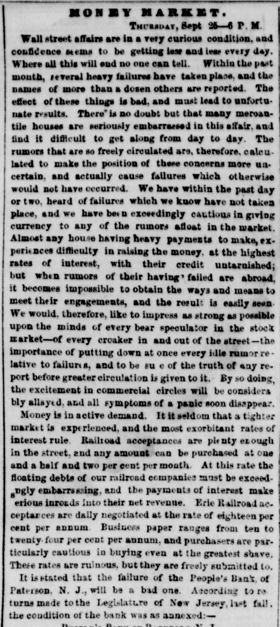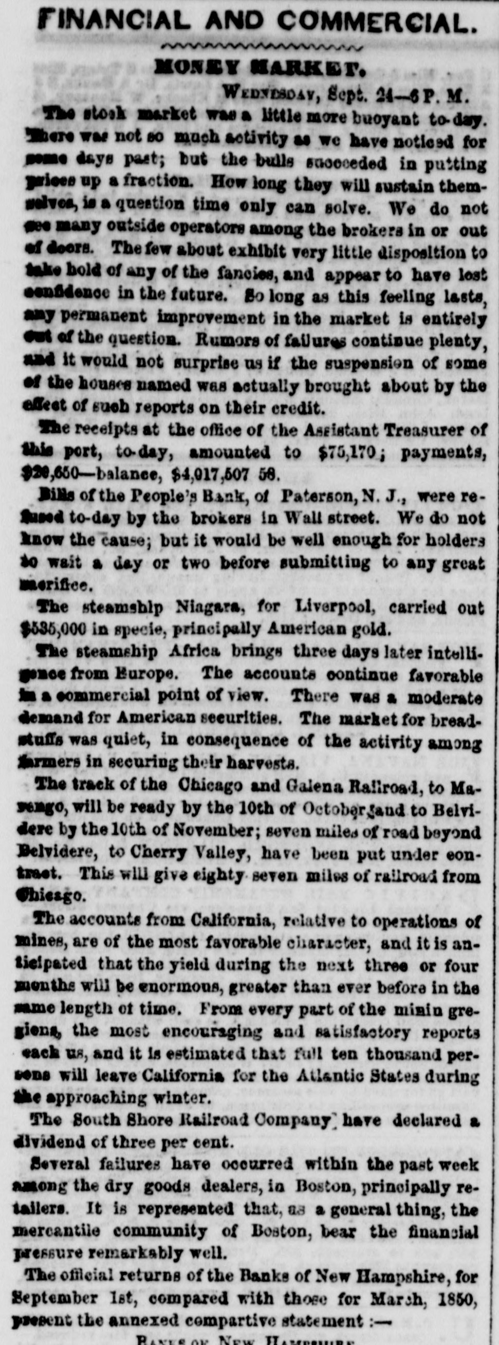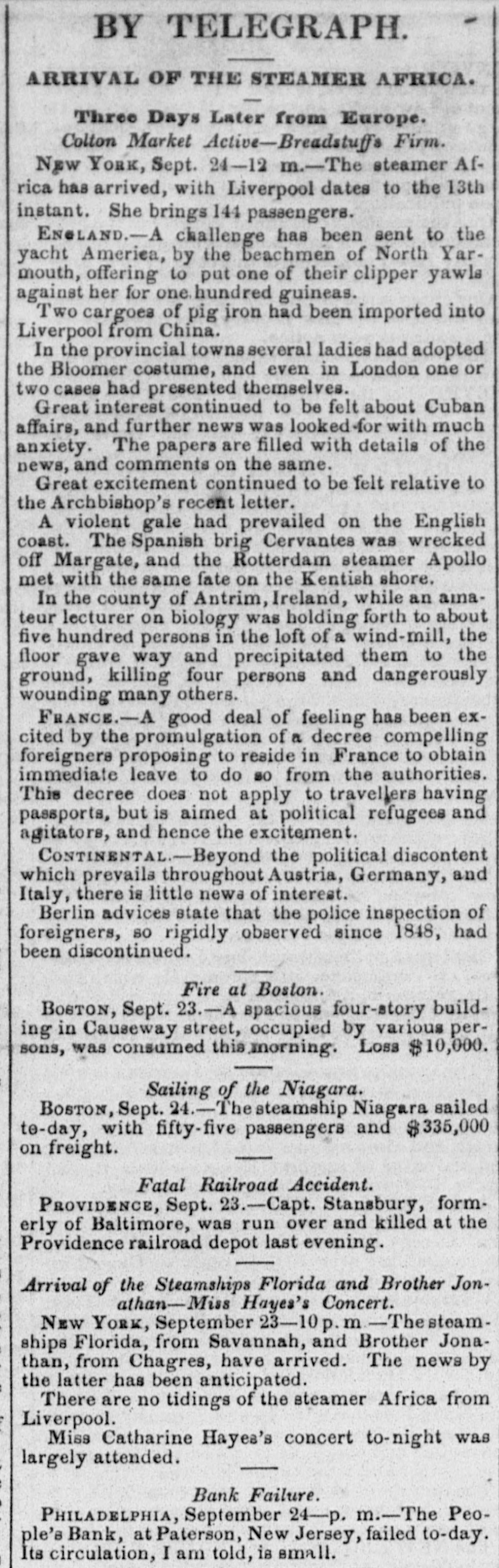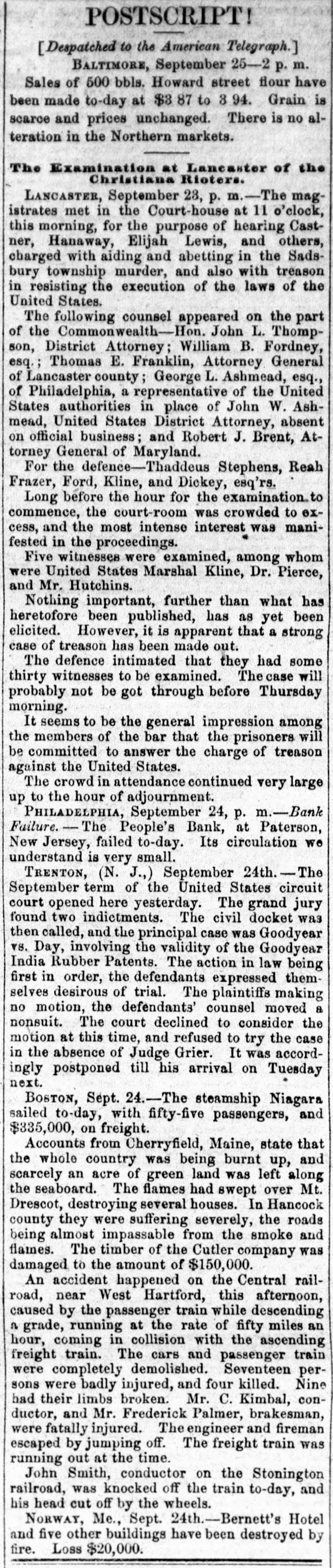 POSTSCRIPT! [Despatched to the American Telegraph.] BALTIMORE, September 25-2 p. m. Sales of 500 bbls. Howard street flour have been made to-day at $8 87 to 94. Grain is scarce and prices unchanged. There is no alteration in the Northern markets. The Examination at Lancaster of the Christiana Rioters. LANCASTER, September 23, p. n.-The magistrates met in the Court-house at 11 o'clock, this morning, for the purpose of hearing Castner, Hanaway, Elijah Lewis, and others, charged with aiding and abetting in the Sadsbury township murder, and also with treason in resisting the execution of the laws of the United States. The following counsel appeared on the part of the Commonwealth-Hon. John L. Thompson, District Attorney; William B. Fordney, esq.; Thomas E. Franklin, Attorney General of Lancaster county; George L. Ashmead, esq., of Philadelphia, a representative of the United States authorities in place of John W. Ashmead, United States District Attorney, absent on official business; and Robert J. Brent, Attorney General of Maryland. For the defence-Thaddeus Stephens, Reah Frazer, Ford, Kline, and Dickey, esq'rs. Long before the hour for the examination. to commence, the court-room was crowded to excess, and the most intense interest was manifested in the proceedings. Five witnesses were examined, among whom were United States Marshal Kline, Dr. Pierce, and Mr. Hutchins. Nothing important, further than what has heretofore been published, has as yet been elicited. However, it is apparent that a strong case of treason has been made out. The defence intimated that they had some thirty witnesses to be examined. The case will probably not be got through before Thursday morning. It seems to be the general impression among the members of the bar that the prisoners will be committed to answer the charge of treason against the United States. The crowd in attendance continued very large up to the hour of adjournment. PHILADELPHIA, September 24, p. m.-Bank Failure. - The People's Bank, at Paterson, New Jersey, failed to-day. Its circulation we understand is very small. TRENTON, (N. J.,) September 24th.-The September term of the United States circuit court opened here yesterday. The grand jury found two indictments. The civil docket was then called, and the principal case was Goodyear vs. Day, involving the validity of the Goodyear India Rubber Patents. The action in law being first in order, the defendants expressed themselves desirous of trial. The plaintiffs making no motion, the defendants' counsel moved a nonsuit. The court declined to consider the motion at this time, and refused to try the case in the absence of Judge Grier. It was accordingly postponed till his arrival on Tuesday next. BOSTON, Sept. 24.-The steamship Niagara sailed to-day, with fifty-five passengers, and $335,000, on freight. Accounts from Cherryfield, Maine, state that the whole country was being burnt up, and scarcely an acre of green land was left along the seaboard. The flames had swept over Mt. Drescot, destroying several houses. In Hancock county they were suffering severely, the roads being almost impassable from the smoke and flames. The timber of the Cutler company was damaged to the amount of $150,000. An accident happened on the Central railroad, near West Hartford, this afternoon, caused by the passenger train while descending a grade, running at the rate of fifty miles an hour, coming in collision with the ascending freight train. The cars and passenger train were completely demolished. Seventeen persons were badly injured, and four killed. Nine had their limbs broken. Mr. C. Kimbal, conductor, and Mr. Frederick Palmer, brakesman, were fatally injured. The engineer and fireman was escaped by jumping off. The freight train running out at the time. John Smith, conductor on the Stonington railroad, was knocked off the train to-day, and his head cut off by the wheels. NORWAY, Me., Sept. 24th.-Bernett's Hotel and five other buildings have been destroyed by fire. Loss $20,000.
