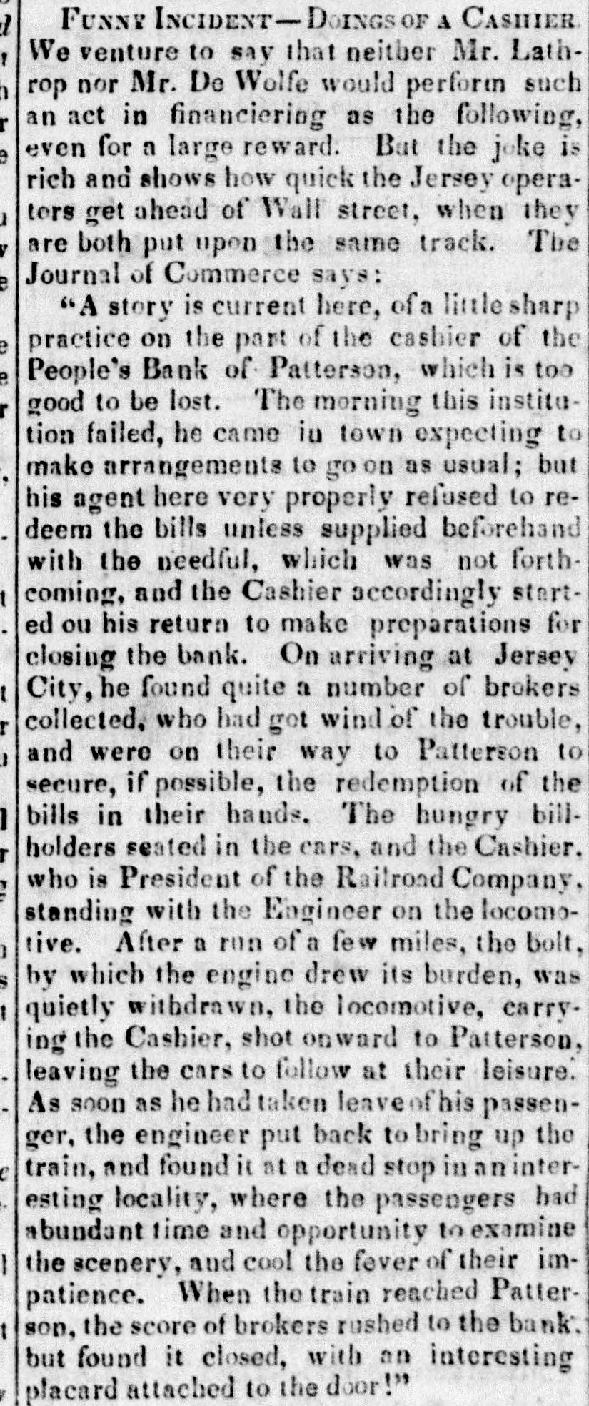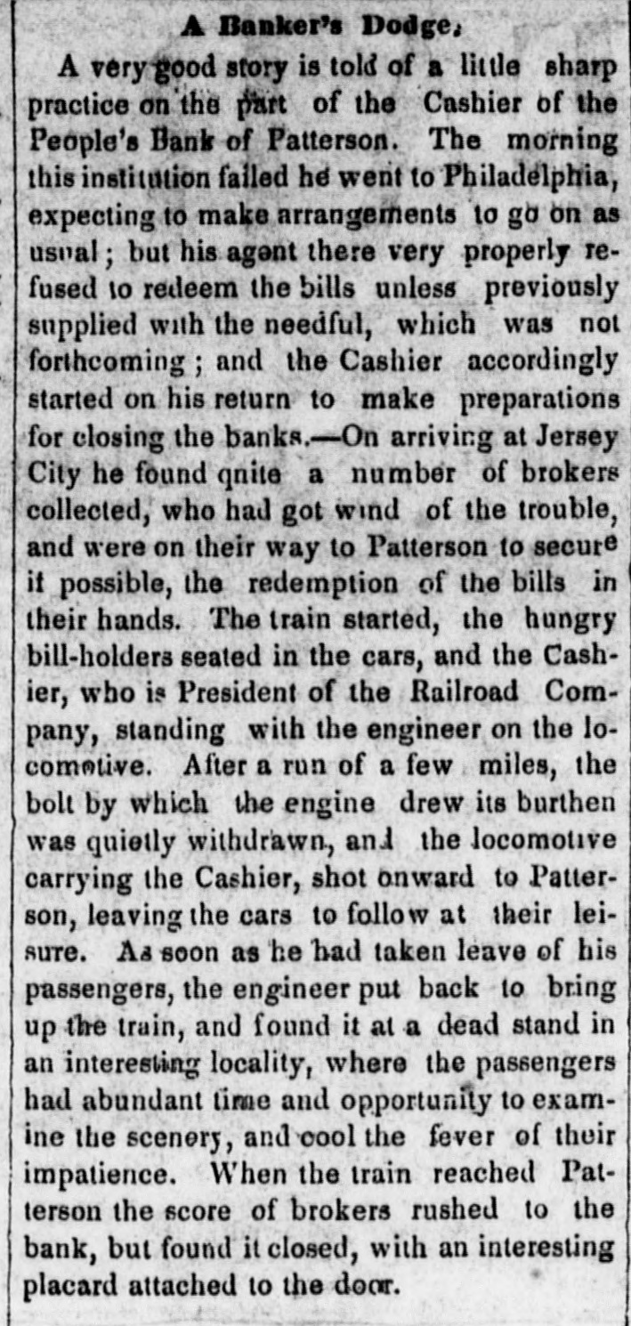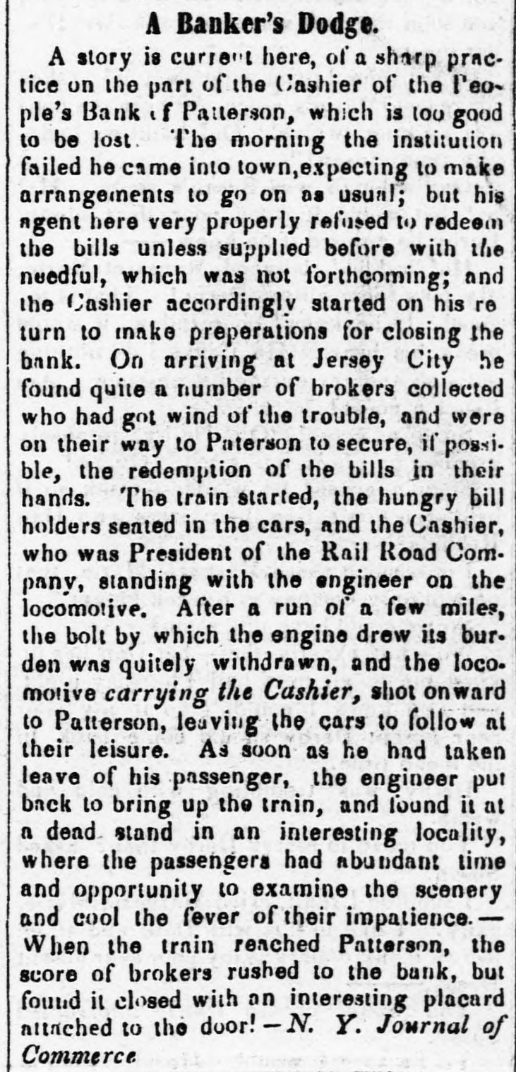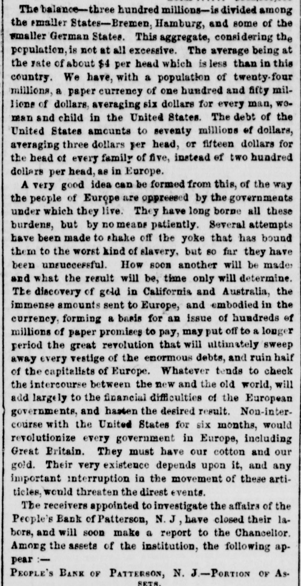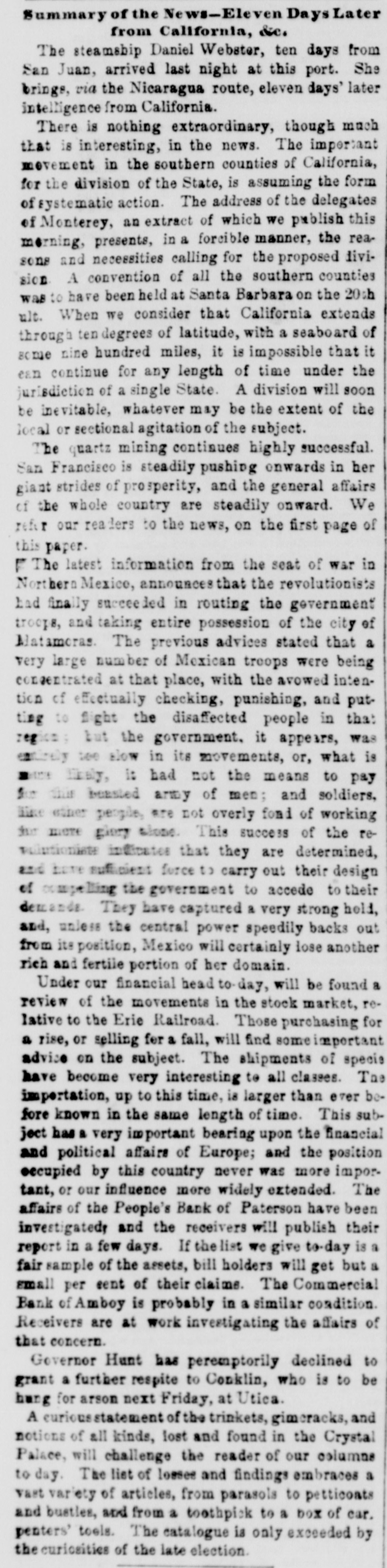 POSTSCRIPT! [Despatched to the American Telegraph.] BALTIMORE, September 25-2 p. m. Sales of 500 bbls. Howard street flour have been made to-day at $8 87 to 94. Grain is scarce and prices unchanged. There is no alteration in the Northern markets. The Examination at Lancaster of the Christiana Rioters. LANCASTER, September 23, p. n.-The magistrates met in the Court-house at 11 o'clock, this morning, for the purpose of hearing Castner, Hanaway, Elijah Lewis, and others, charged with aiding and abetting in the Sadsbury township murder, and also with treason in resisting the execution of the laws of the United States. The following counsel appeared on the part of the Commonwealth-Hon. John L. Thompson, District Attorney; William B. Fordney, esq.; Thomas E. Franklin, Attorney General of Lancaster county; George L. Ashmead, esq., of Philadelphia, a representative of the United States authorities in place of John W. Ashmead, United States District Attorney, absent on official business; and Robert J. Brent, Attorney General of Maryland. For the defence-Thaddeus Stephens, Reah Frazer, Ford, Kline, and Dickey, esq'rs. Long before the hour for the examination. to commence, the court-room was crowded to excess, and the most intense interest was manifested in the proceedings. Five witnesses were examined, among whom were United States Marshal Kline, Dr. Pierce, and Mr. Hutchins. Nothing important, further than what has heretofore been published, has as yet been elicited. However, it is apparent that a strong case of treason has been made out. The defence intimated that they had some thirty witnesses to be examined. The case will probably not be got through before Thursday morning. It seems to be the general impression among the members of the bar that the prisoners will be committed to answer the charge of treason against the United States. The crowd in attendance continued very large up to the hour of adjournment. PHILADELPHIA, September 24, p. m.-Bank Failure. - The People's Bank, at Paterson, New Jersey, failed to-day. Its circulation we understand is very small. TRENTON, (N. J.,) September 24th.-The September term of the United States circuit court opened here yesterday. The grand jury found two indictments. The civil docket was then called, and the principal case was Goodyear vs. Day, involving the validity of the Goodyear India Rubber Patents. The action in law being first in order, the defendants expressed themselves desirous of trial. The plaintiffs making no motion, the defendants' counsel moved a nonsuit. The court declined to consider the motion at this time, and refused to try the case in the absence of Judge Grier. It was accordingly postponed till his arrival on Tuesday next. BOSTON, Sept. 24.-The steamship Niagara sailed to-day, with fifty-five passengers, and $335,000, on freight. Accounts from Cherryfield, Maine, state that the whole country was being burnt up, and scarcely an acre of green land was left along the seaboard. The flames had swept over Mt. Drescot, destroying several houses. In Hancock county they were suffering severely, the roads being almost impassable from the smoke and flames. The timber of the Cutler company was damaged to the amount of $150,000. An accident happened on the Central railroad, near West Hartford, this afternoon, caused by the passenger train while descending a grade, running at the rate of fifty miles an hour, coming in collision with the ascending freight train. The cars and passenger train were completely demolished. Seventeen persons were badly injured, and four killed. Nine had their limbs broken. Mr. C. Kimbal, conductor, and Mr. Frederick Palmer, brakesman, were fatally injured. The engineer and fireman was escaped by jumping off. The freight train running out at the time. John Smith, conductor on the Stonington railroad, was knocked off the train to-day, and his head cut off by the wheels. NORWAY, Me., Sept. 24th.-Bernett's Hotel and five other buildings have been destroyed by fire. Loss $20,000.