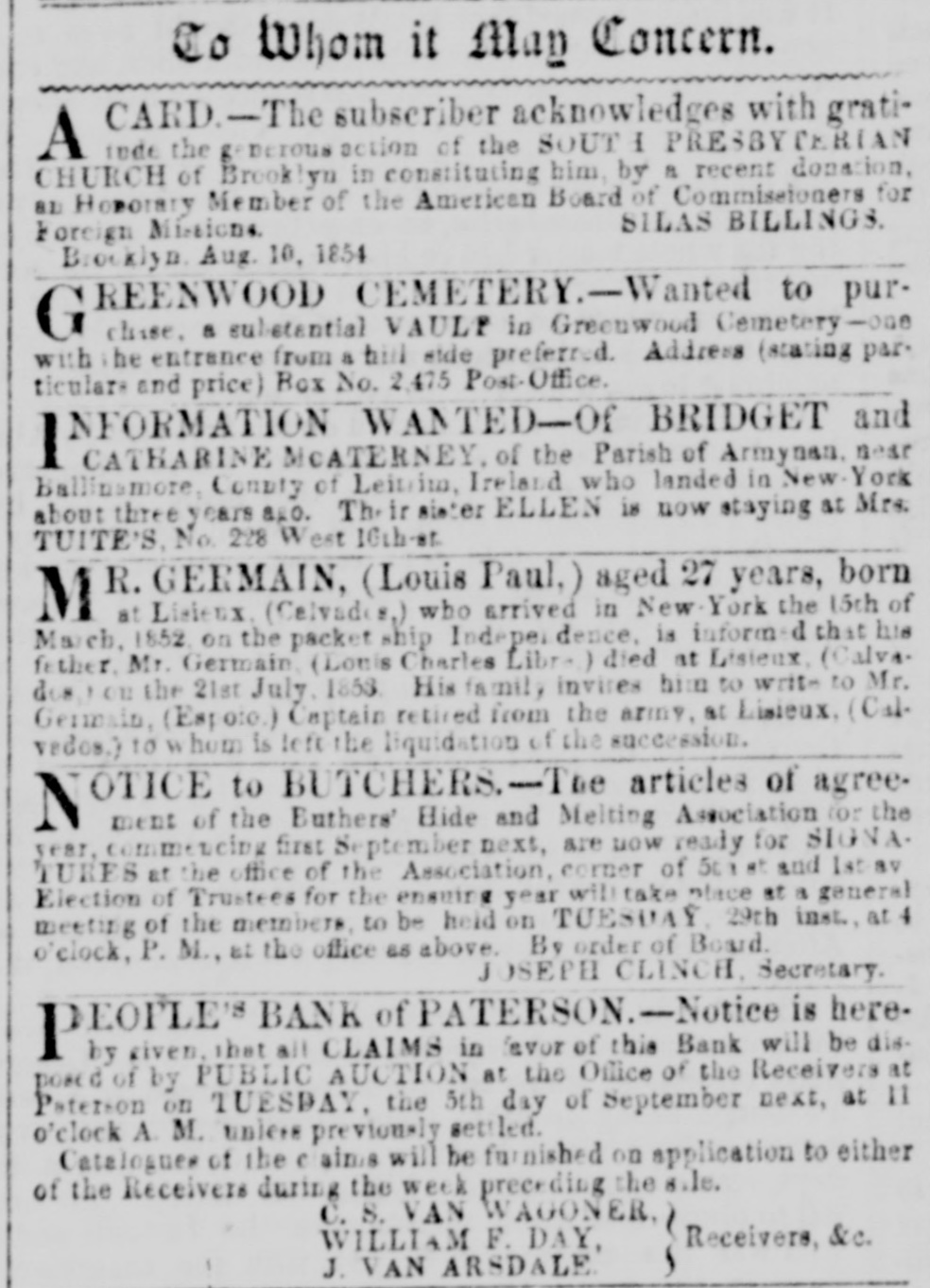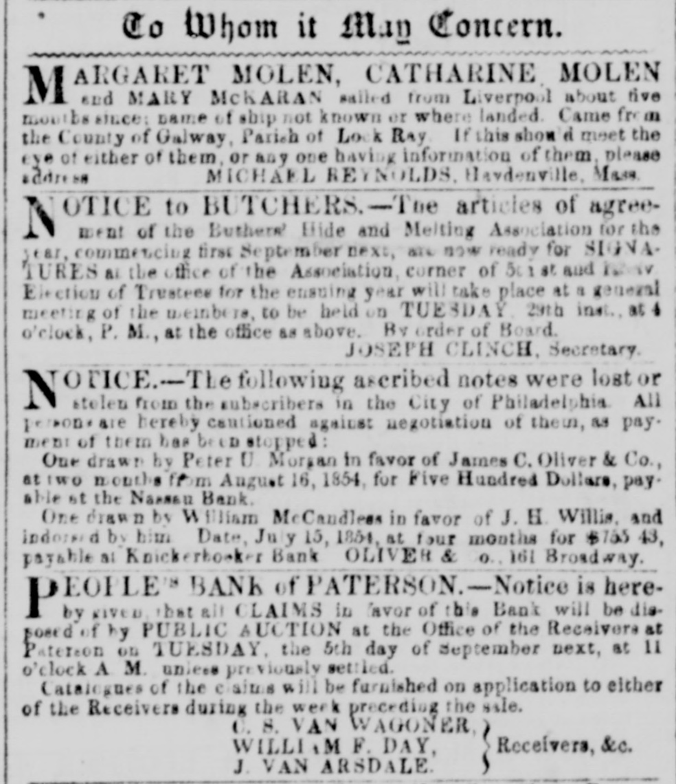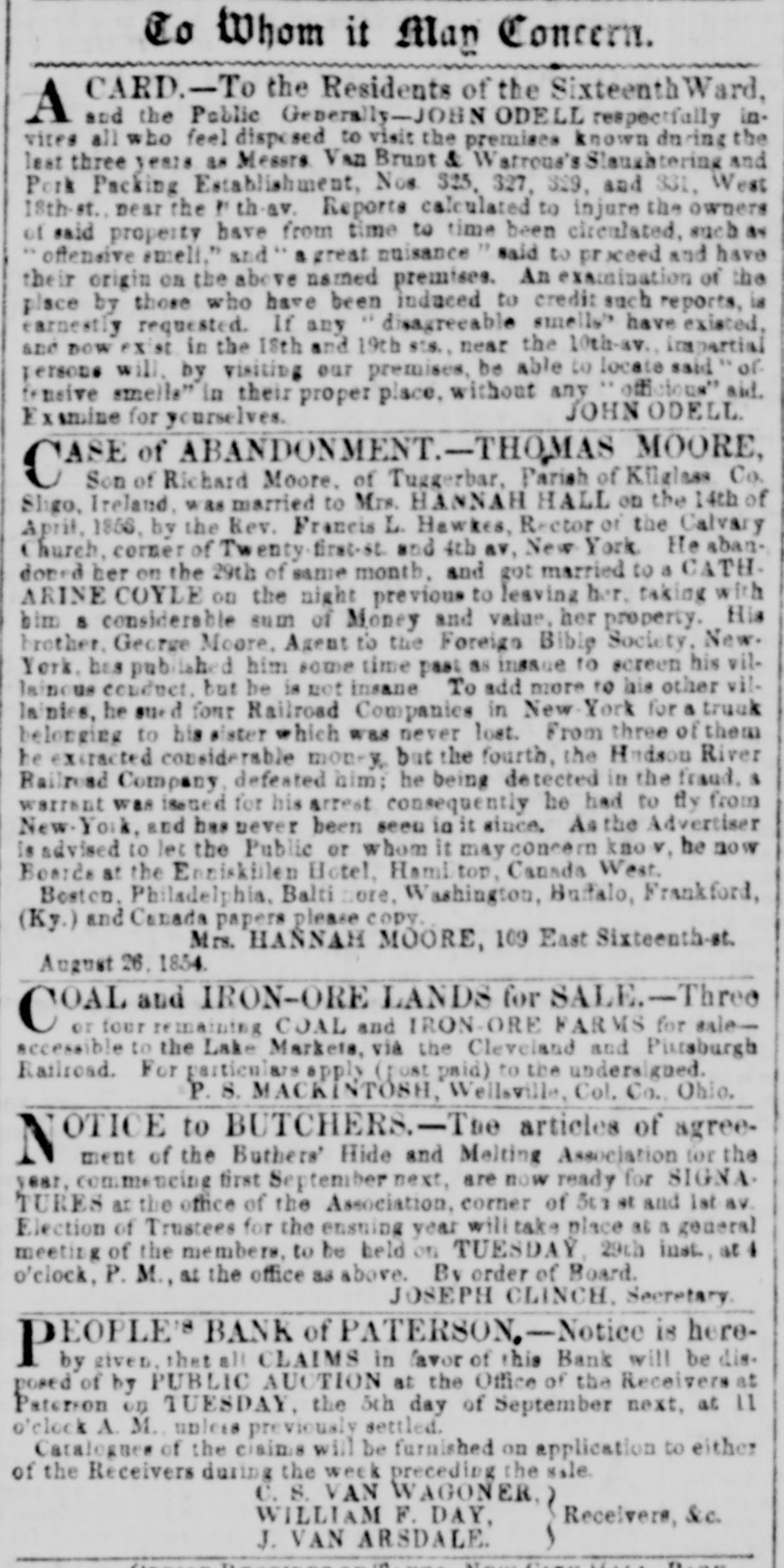 Co Whom it Man Concern. CARD.-To the Residents of the Sixteenth Ward, A and the Public Generally-JOHN ODELL respectfully in. vites all who feel disposed to visit the premises known du ring the leat three years as Measts Van Brunt & Watrona's Slaughtering and Pork Packing Establishment, Nos S25. 327, 329, and 331, West 18th st. Dear the thtav. Reports calculated to injure the owners of said property have from time to time been circulated, such as offensive smell," and a great nuisance" said to proceed and have their origin on the above named premises. An examination of the place by those who have been induced to credit such reports, is earnestly requested. If any disagreeable smells have existed, and now exist in the 18th and 19th sts., near the 10th-av. impartial persons will. by visiting our premises, be able to locate said of fensive smells" in their proper place. without any officious" aid. JOHN ODELL Examine for yourselves. ASE of PABANDONMENT.-THOMAS MOORE, Son of Richard Moore. of Tuggerbar Parish of Kilglass Co. Shgo, Ireland, was married to Mrs. HANNAH HALL on the 14th of April, 1858, by the Rev. Francis L. Hawkes, Rector of the Calvary Church, corner of Twenty first-st. and 4th av. New York He abandoned her on the 29th of same month. and got married to a CATH. ARINE COYLE on the night previous to leaving her. taking with him 8 considerable sum of Money and value, her property. His brother. George Moore. Agent to the Foreign Bible Society, New. York. has published him some time past as insuge to screen his villainous conduct. but be is not insane To add more to his other villainies, he sued four Railroad Companies in New York for a truck belonging to his sister which was never lost. From three of them he extracted considerable money but the fourth, the Hadson River Railroad Company defeated him; he being detected in the fraud. $ warrant was issued for his arrest consequently he had to fly from New York, and has never been seen in it since. As the Advertiser is advised to let the Public or whom it may concern kao v. he now Boards at the Enniskillen Hotel, Hami top, Canada West. Boston. Philadelphia, Balti ore, Washington, Huffalo, Frankford, (Ky.) and Canada papers please copy. Mrs. HANNAH MOORE, 109 East Sixteenth-st. August 26. 1854. OAL and IRON-ORE LANDS for SALE.-Three C or four remaining COAL and IRON ORE FARMS for saleaccessible to the Lake Markets, via the Cleveland and Pittsburgh Railroad. For particulars apply (post paid) to the undersigned. P. S. MACKINTOSH, Wellsville, Col. Co., Ohio. OTICE to BUTCHERS.-Tte articles of agreement of the Buthers' Hide and Melting Association for the year, commencing first September next, are now ready for SIGNA. TURES at the office of the Association. corner of 5th at and 1st av. Election of Trustees for the ensuing year will take place at a general meeting of the members. to be held on TUESDAY 29th inst. at 4 o'clock, P. M., at the office as above. By order of Board. JOSEPH CLINCH. Secretary DEOPLE'S BANK of PATERSON.-Notice is hereP by given. that all CLAIMS in favor of this Bank will be dis. posed of by PUBLIC AUCTION at the Office of the Receivers at Paterson on TUESDAY, the 5th day of September next. at 11 o'clock A. M. unless previously settled. Catalogues of the claims will be furnished on application to either of the Receivers during the week preceding the sale. C. S. VAN WAGONER WILLIAM F. DAY, Receivers, &c. J. VAN ARSDALE.