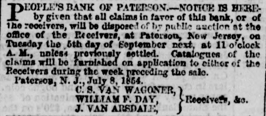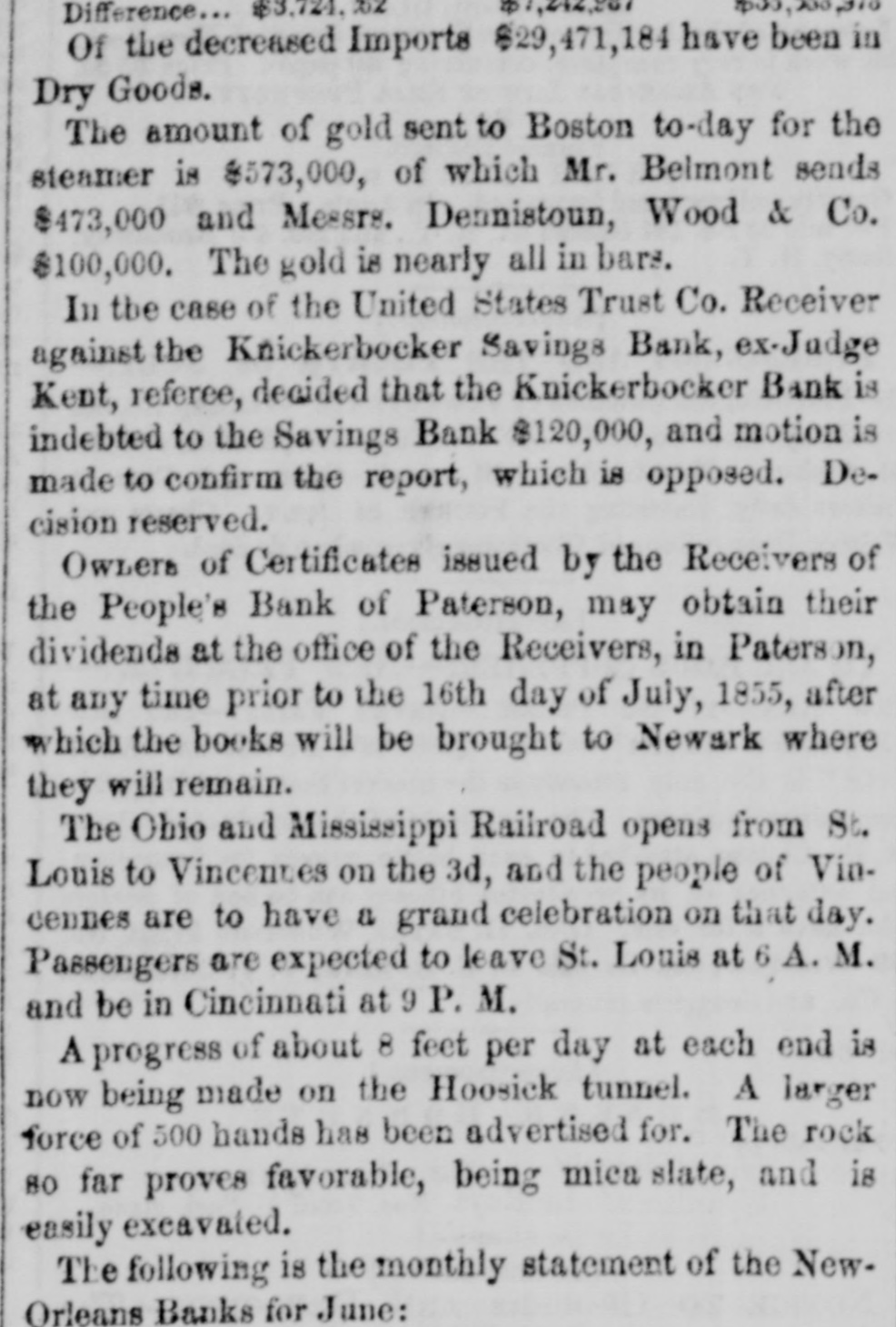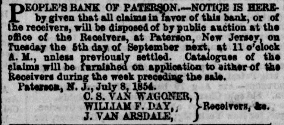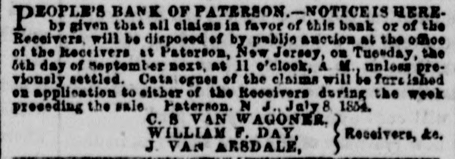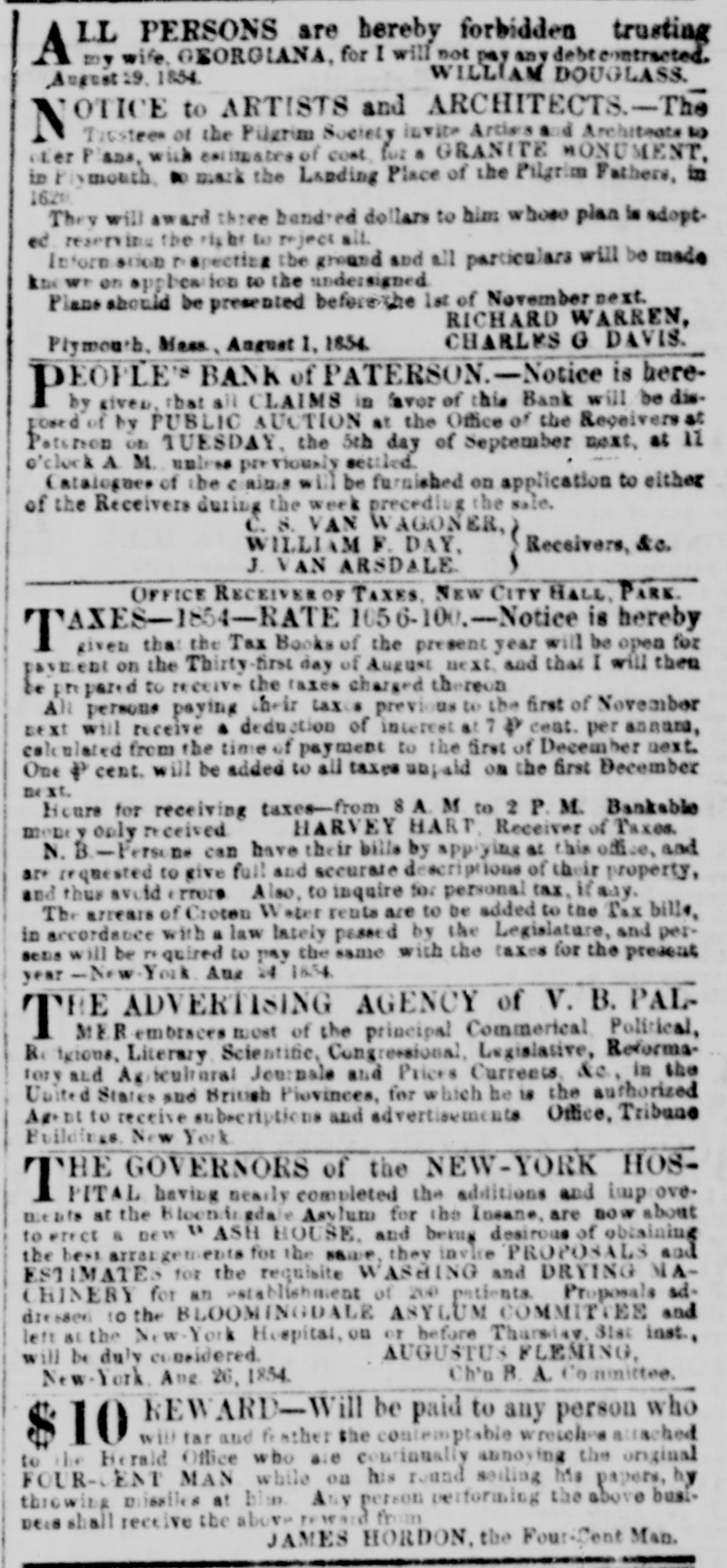 Co Whom it Man Concern. CARD.-To the Residents of the Sixteenth Ward, A and the Public Generally-JOHN ODELL respectfully in. vites all who feel disposed to visit the premises known du ring the leat three years as Measts Van Brunt & Watrona's Slaughtering and Pork Packing Establishment, Nos S25. 327, 329, and 331, West 18th st. Dear the thtav. Reports calculated to injure the owners of said property have from time to time been circulated, such as offensive smell," and a great nuisance" said to proceed and have their origin on the above named premises. An examination of the place by those who have been induced to credit such reports, is earnestly requested. If any disagreeable smells have existed, and now exist in the 18th and 19th sts., near the 10th-av. impartial persons will. by visiting our premises, be able to locate said of fensive smells" in their proper place. without any officious" aid. JOHN ODELL Examine for yourselves. ASE of PABANDONMENT.-THOMAS MOORE, Son of Richard Moore. of Tuggerbar Parish of Kilglass Co. Shgo, Ireland, was married to Mrs. HANNAH HALL on the 14th of April, 1858, by the Rev. Francis L. Hawkes, Rector of the Calvary Church, corner of Twenty first-st. and 4th av. New York He abandoned her on the 29th of same month. and got married to a CATH. ARINE COYLE on the night previous to leaving her. taking with him 8 considerable sum of Money and value, her property. His brother. George Moore. Agent to the Foreign Bible Society, New. York. has published him some time past as insuge to screen his villainous conduct. but be is not insane To add more to his other villainies, he sued four Railroad Companies in New York for a truck belonging to his sister which was never lost. From three of them he extracted considerable money but the fourth, the Hadson River Railroad Company defeated him; he being detected in the fraud. $ warrant was issued for his arrest consequently he had to fly from New York, and has never been seen in it since. As the Advertiser is advised to let the Public or whom it may concern kao v. he now Boards at the Enniskillen Hotel, Hami top, Canada West. Boston. Philadelphia, Balti ore, Washington, Huffalo, Frankford, (Ky.) and Canada papers please copy. Mrs. HANNAH MOORE, 109 East Sixteenth-st. August 26. 1854. OAL and IRON-ORE LANDS for SALE.-Three C or four remaining COAL and IRON ORE FARMS for saleaccessible to the Lake Markets, via the Cleveland and Pittsburgh Railroad. For particulars apply (post paid) to the undersigned. P. S. MACKINTOSH, Wellsville, Col. Co., Ohio. OTICE to BUTCHERS.-Tte articles of agreement of the Buthers' Hide and Melting Association for the year, commencing first September next, are now ready for SIGNA. TURES at the office of the Association. corner of 5th at and 1st av. Election of Trustees for the ensuing year will take place at a general meeting of the members. to be held on TUESDAY 29th inst. at 4 o'clock, P. M., at the office as above. By order of Board. JOSEPH CLINCH. Secretary DEOPLE'S BANK of PATERSON.-Notice is hereP by given. that all CLAIMS in favor of this Bank will be dis. posed of by PUBLIC AUCTION at the Office of the Receivers at Paterson on TUESDAY, the 5th day of September next. at 11 o'clock A. M. unless previously settled. Catalogues of the claims will be furnished on application to either of the Receivers during the week preceding the sale. C. S. VAN WAGONER WILLIAM F. DAY, Receivers, &c. J. VAN ARSDALE.