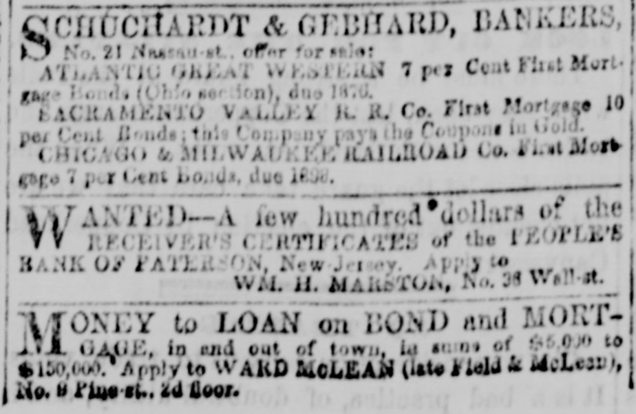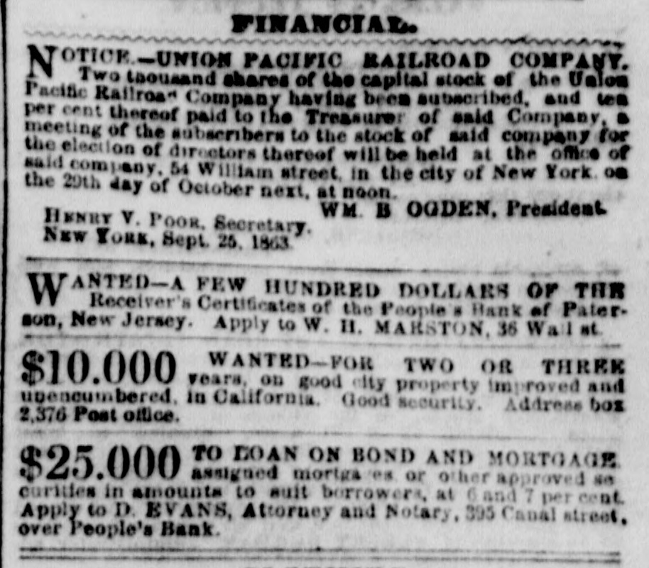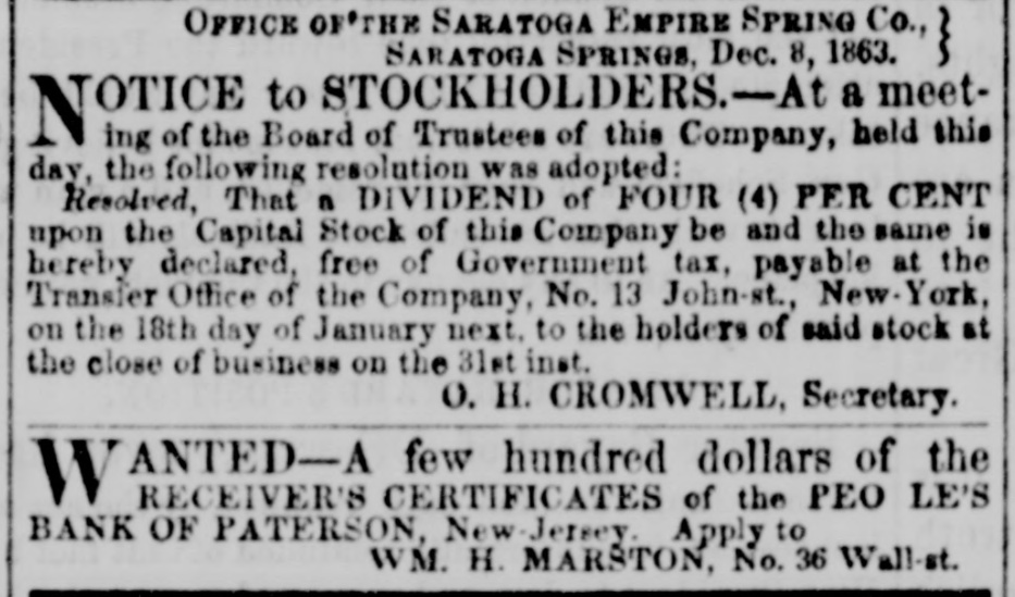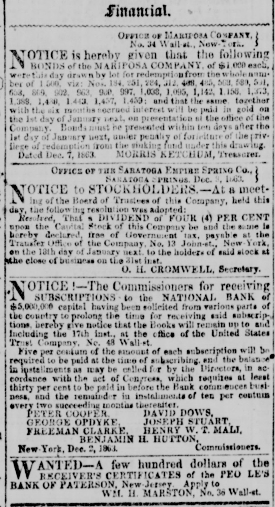 Financial. OFFICE OF MARIPOSA COMPANY, } No. 34 Wall-st., New-* OTICE is hereby given that the following N BONDS of the MARIPOSA COMPANY, of $1,000 each, werethis day drawn by lot for redemption: from the whole anniber of 1.500, viz: Nos. 184, 251, 284, 312, 408, 485, 568, 580, 591, 658, 809, 902, 963, 980, 997, 1,038, 1,095, 1,142, 1,158, 1,3.3, 1,388, 1,488, 1.443. 1,457, 1,459: and that the same. together with the six months secrued interest will be paid in gold on the 1st day of January next, on presentation at the office of the Company. Bonds must be presented within ten days after the 1st day of January next, under penalty of forfeiture of the privilege of redemption from the sinking fund under this drawing. Dated Dec. 7, 1863. MORRIS KETCHUM, Treasurer. OFFICE OF THE SARATOGA EMPIRE SPRING Co., } SARATOGA SPRINGS. Dec. 8, 1863. NOTICE to STOCKHOLDERS.-At 8 meetBoard of Trustees of this Company, held this day, the following resolution was adopted: Resolved, That a DIVIDEND of FOUR (4) PER CENT upon the Capital Stock of this Company be and the same is hereby declared, free of Government tax, payable at the Transfer Office of the Company, No. 13 John-st., New-York, on the 18th day of January next. to the holders of said stock at the close of business on the 31st inst. O. H. CROMWELL, Secretary. OTICE !-The Commissioners for receiving N SUBSCRIPTIONS to the NATIONAL BANK of $5,000,000 capital having been solicited from various parts of the country to prolong the time for receiving said subscriptions, hereby give notice that the Books will remain up to and Including the 17th inst., at the office of the United States Trust Company, No. 48 Wall-st. Five per contum of the amount of each subscription will be required to be paid at the time of subscribing. and the balance in installments as may be called for by the Directors, in accordance with the act of Congress, which requires at least thirty per cent to be paid in before the Bank commences business, and the remainder in installments of ten per centum every two succeeding months thereafter. DAVID DOWS, PETER COOPER. JOSEPH STUART, GEORGE OPDYKE, FREEMAN CLARKE, HENRY W. T. MALI, BENJAMIN H. HUTTON, Commissioners. New-York, Dec. 2, 1863. ANTED-A few hundred dollars of the W RECEIVER'S CERTIFICATES of the PEO LE'S BANK OF PATERSON, New-Jersey. Apply to WM. H. MARSTON, No. 36 Wall-st.