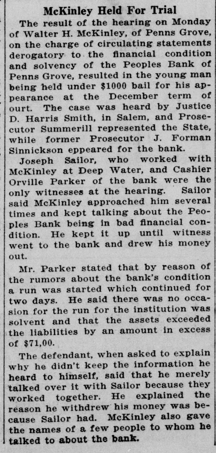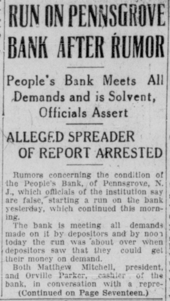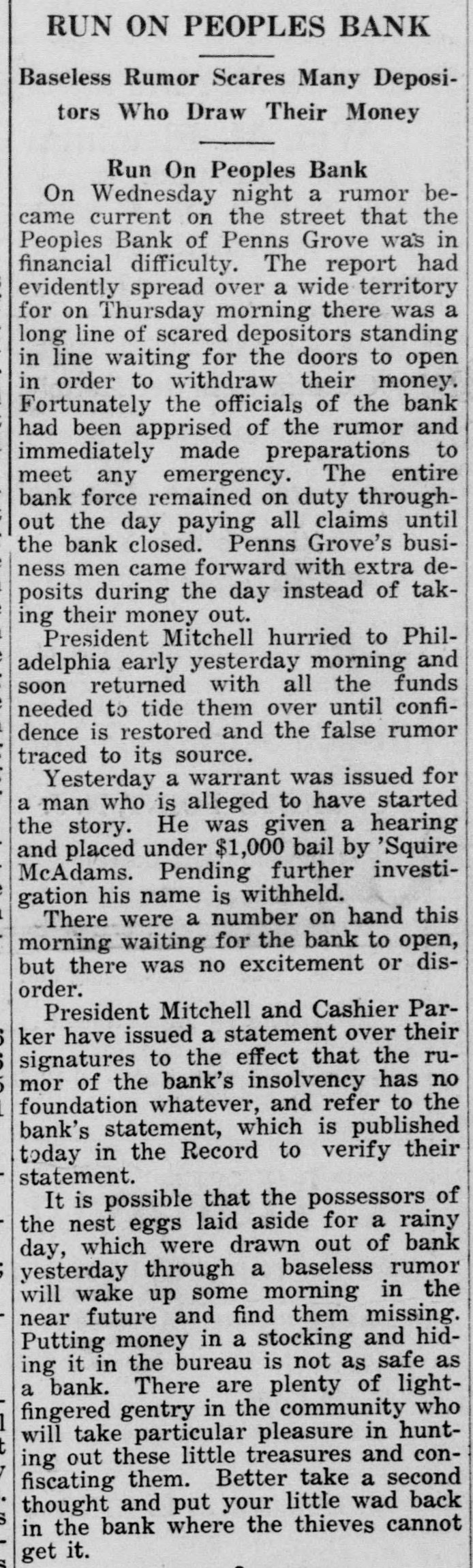 RUN ON PEOPLES BANK Baseless Rumor Scares Many Depositors Who Draw Their Money Run On Peoples Bank On Wednesday night a rumor became current on the street that the Peoples Bank of Penns Grove was in financial difficulty. The report had evidently spread over a wide territory for on Thursday morning there was a long line of scared depositors standing in line waiting for the doors to open in order to withdraw their money. Fortunately the officials of the bank had been apprised of the rumor and immediately made preparations to meet any emergency. The entire bank force remained on duty throughout the day paying all claims until the bank closed. Penns Grove's business men came forward with extra deposits during the day instead of taking their money out. President Mitchell hurried to Philadelphia early yesterday morning and soon returned with all the funds needed to tide them over until confidence is restored and the false rumor traced to its source. Yesterday a warrant was issued for a man who is alleged to have started the story. He was given a hearing and placed under $1,000 bail by 'Squire McAdams. Pending further investigation his name is withheld. There were a number on hand this morning waiting for the bank to open, but there was no excitement or disorder. President Mitchell and Cashier Parker have issued a statement over their signatures to the effect that the rumor of the bank's insolvency has no foundation whatever, and refer to the bank's statement, which is published today in the Record to verify their statement. It is possible that the possessors of the nest eggs laid aside for a rainy day, which were drawn out of bank yesterday through a baseless rumor will wake up some morning in the near future and find them missing. Putting money in a stocking and hiding it in the bureau is not as safe as a bank. There are plenty of lightfingered gentry in the community who will take particular pleasure in hunting out these little treasures and confiscating them. Better take a second thought and put your little wad back in the bank where the thieves cannot get it.