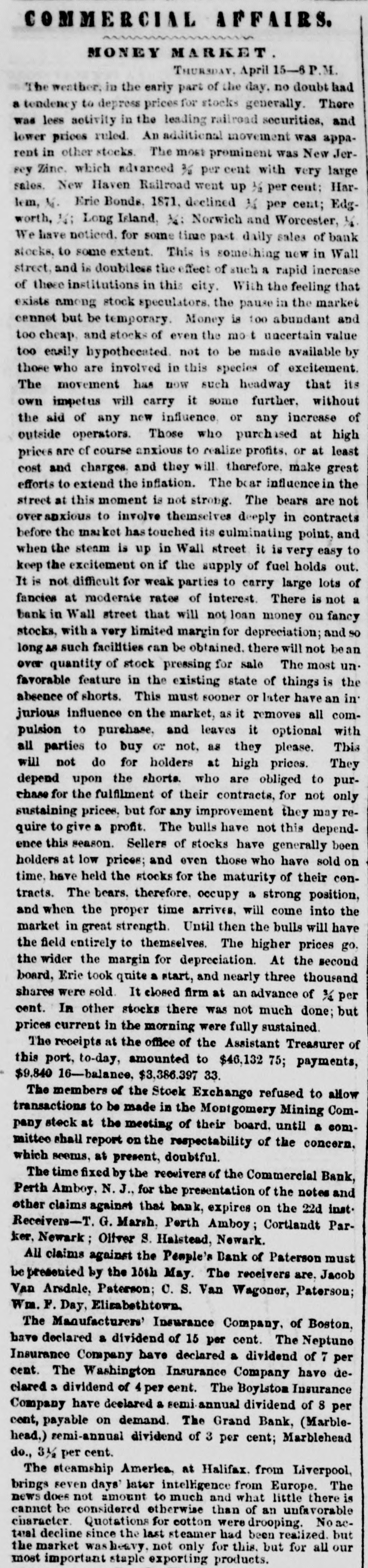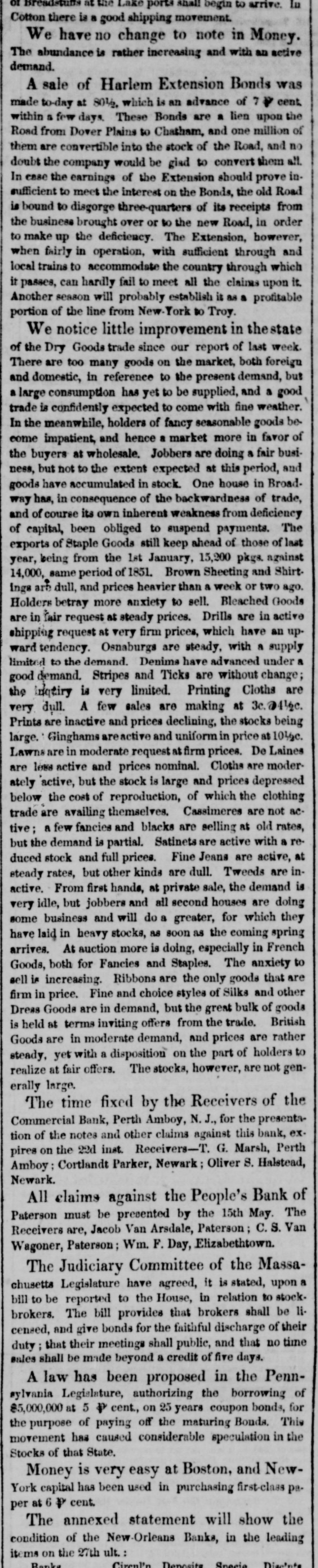 or Breadstuds at the Lake ports shall begin to arrive. In Cotton there is a good shipping movement. We have no change to note in Money. The abundance is rather increasing and with an active demand. A sale of Harlem Extension Bonds was made to-day at 801/2, which is an advance of 7 cent. within a few days. These Bonds are a lien upon the Road from Dover Plains to Chatham, and one million of them are convertible into the stock of the Road, and no doubt the company would be giad to convert them all. In case the earnings of the Extension should prove insufficient to meet the interest on the Bonds, the old Road is bound to disgorge three-quarters of its receipts from the business brought over or to the new Road, in order to make up the deficiency. The Extension, however, when fairly in operation, with sufficient through and local trains to accommodate the country through which it passes, can hardly fail to meet all the claims upon it. Another season will probably establish it as a profitable portion of the line from New-York to Troy. We notice little improvement in thestate of the Dry Goods trade since our report of last week. There are too many goods on the market, both foreign and domestic, in reference to the present demand, but large consumption has yet to be supplied, and a good trade is confidently expected to come with fine weather. In the meanwhile, holders of fancy seasonable goods become impatient, and hence a market more in favor of the buyers at wholesale. Jobbers are doing a fair business, but not to the extent expected at this period, and goods have accumulated in stock. One house in Broadway has, in consequence of the backwardness of trade, and of course its own inherent weakness from deficiency of capital, been obliged to suspend payments. The exports of Staple Goods still keep ahead of those of last year, being from the 1st January, 15,200 pkgs. against 14,000, same period of 1851. Brown Sheeting and Shirtings are dull, and prices heavier than a week or two ago. Holders betray more anxiety to sell. Bleached Goods are in fair request at steady prices. Drills are in active shipping request at very firm prices, which have an upward tendency. Osnaburgs are steady, with a supply limited to the demand. Denims have advanced under a good demand. Stripes and Ticks are without change; the inquiry is very limited. Printing Cloths are very dull. A few sales are making at 3c. 44/2c. Prints are inactive and prices declining, the stocks being large. Ginghams areactive and uniform in price at 10 4/cc. Lawnsare in moderate request firm prices. De Laines are loss active and prices nominal. Cloths are moderately active, but the stock is large and prices depressed below the cost of reproduction, of which the clothing trade are availing themselves. Cassimeres are not active; a few fancies and blacks are selling at old rates, but the demand is partial. Satinets are active with a reduced stock and full prices. Fine Jeans are active, at steady rates, but other kinds are dull. Tweeds are inactive. From first hands, at private sale, the demand is very idle, but jobbers and all second houses are doing some business and will do a greater, for which they have laid in heavy stocks, as soon as the eoming spring arrives. At auction more is doing, especially in French Goods, both for Fancies and Staples. The anxiety to sell is increasing. Ribbons are the only goods that are firm in price. Fine and choice styles of Silks and other Dress Goods are in demand, but the great bulk of goods is held at terms inviting offers from the trade. British Goods are in moderate demand, and prices are rather steady, yet with a disposition on the part of holders to realize at fair offers. The stocks, however, are not generally large. The time fixed by the Receivers of the Commercial Bank, Perth Amboy, N.J., for the presentation of the notes and other claims against this bank, expires on the 22d inst. Receivers-T. G. Marsh, Perth Amboy; Cortlandt Parker, Newark Oliver S. Halstead, Newark. All claims against the People's Bank of Paterson must be presented by the 15th May. The Receivers are, Jacob Van Arsdale, Paterson; C. S. Van Wagoner, Paterson; Wm. F. Day, Elizabethtown. The Judiciary Committee of the Massachusetta Legislature have agreed, it is stated, upon a bill to be reported to the House, in relation to stock. brokers. The bill provides that brokers shall be licensed, and give bonds for the faithful discharge of their duty that their meetings shall public, and that no time sales shall be made beyond a credit of five days. A law has been proposed in the Pennsylvania Legislature, authorizing the borrowing of $5,000,000 at 5 P cent., on 25 years coupon bonds, for the purpose of paying off the maturing Bonds. This movement has caused considerable speculation in the Stocks of that State. Money is very easy at Boston, and NewYork capital has been used in purchasing first-class paper at 6 P cent. The annexed statement will show the condition of the New-Orleans Banks, in the leading items on the 27th ult. Circul'n Deposite Special Discipts