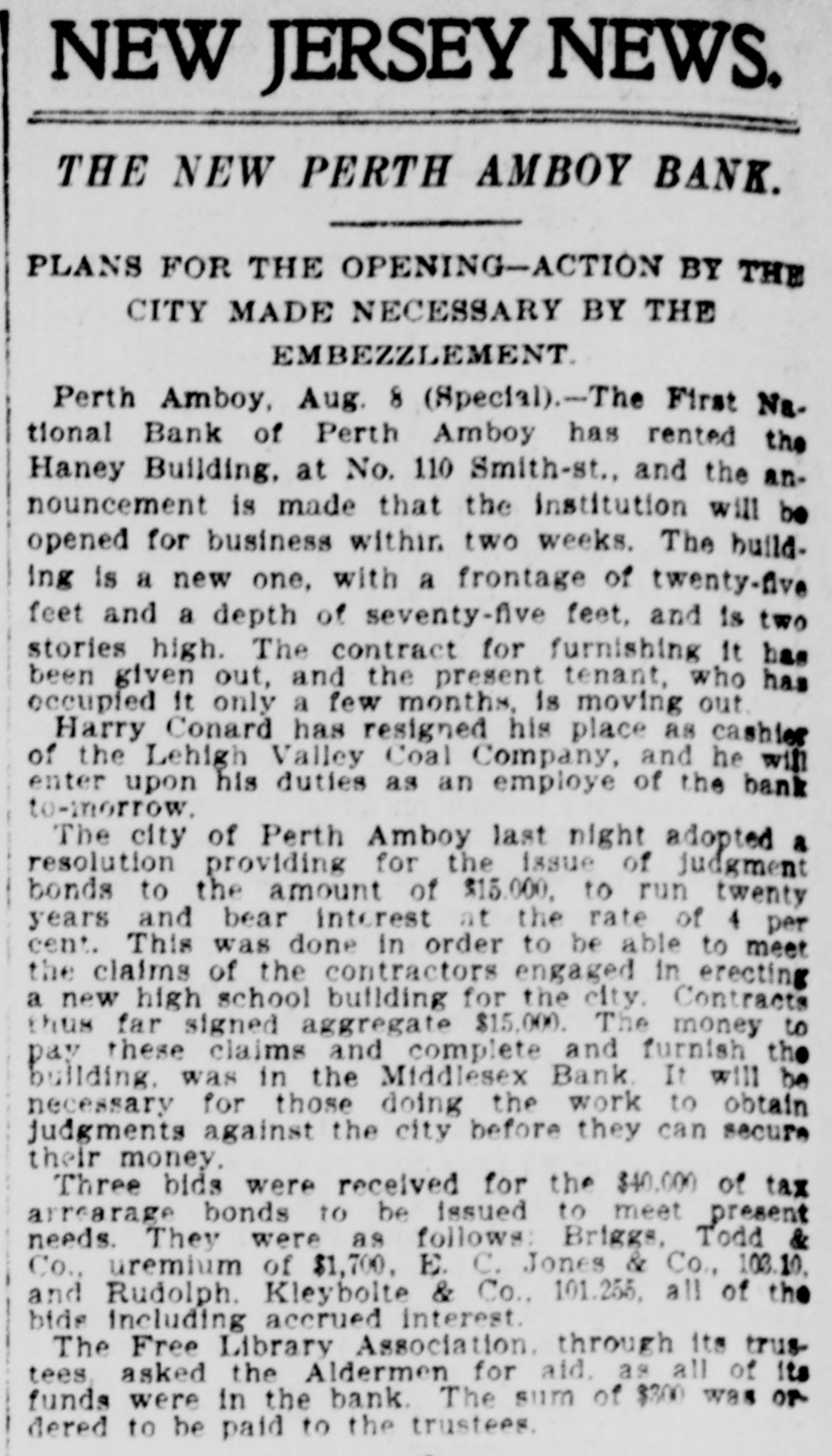 NEW JERSEY NEWS. THE NEW PERTH AMBOY BANK. PLANS FOR THE OPENING-ACTION BY THE CITY MADE NECESSARY BY THE EMBEZZLEMENT Perth Amboy, Aug. 8 (Special).-The First National Bank of Perth Amboy has rented the Haney Building, at No. 110 Smith-st., and the announcement is made that the institution will be opened for business within two weeks. The building is a new one, with a frontage of twenty-five feet and a depth of seventy-five feet, and is two stories high. The contract for furnishing It has been given out, and the present tenant, who has occupied it only a few months, is moving out. Harry Conard has resigned his place as cashier of the Lehigh Valley Coal Company, and he will enter upon his duties as an employe of the bank to-morrow. The city of Perth Amboy last night adopted a resolution providing for the issue of judgment bonds to the amount of $15.000, to run twenty years and bear interest at the rate of 4 per cent. This was done in order to be able to meet the claims of the contractors engaged in erecting a new high school building for the city, Contracts thus far signed aggregate $15,000. The money to pay these claims and complete and furnish the building. was in the Middlesex Bank. It will be necessary for those doing the work to obtain judgments against the city before they can secure their money. Three bids were received for the $40.000 of tax arrearage bonds to be issued to meet present needs. They were as follows: Briggs, Todd & Co., uremium of $1,700, E. C. Jones & Co., 103.10, and Rudolph. Kleybolte & Co., 101.255, all of the bide including accrued interest. The Free Library Association. through its trustees, asked the Aldermen for aid, as all of its funds were in the bank. The sum of $300 was or dered to be paid to the trustees.