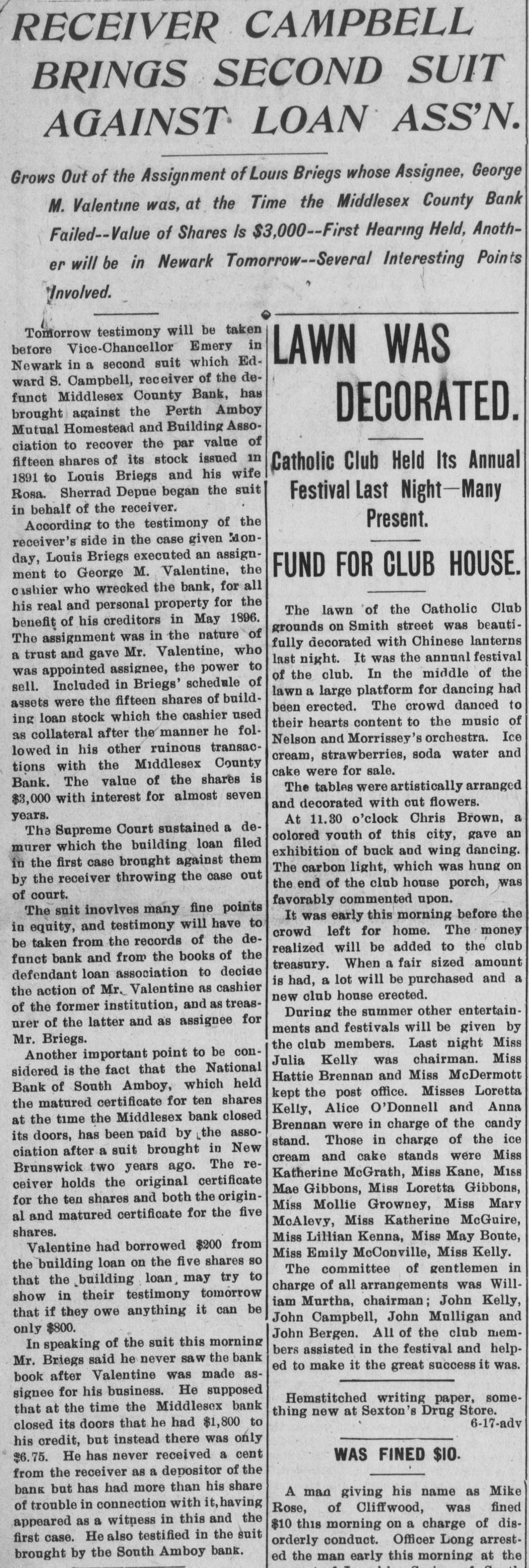 RECEIVER CAMPBELL BRINGS SECOND SUIT AGAINST LOAN ASS'N. Grows Out of the Assignment of Louis Briegs whose Assignee, George M. Valentine was, at the Time the Middlesex County Bank Failed--Value of Shares Is $3,000- First Hearing Held, Another will be in Newark Tomorrow--Severe Interesting Points Involved. Tomorrow testimony will be taken before Vice-Chancellor Emery in LAWN WAS Newark in a second suit which Edward S. Campbell, receiver of the defunct Middlesex County Bank, has brought against the Perth Amboy DECORATED. Mutual Homestead and Building Association to recover the par value of fifteen shares of its stock issued in Catholic Club Held Its Annual 1891 to Louis Briegs and his wife Rosa. Sherrad Depue began the suit Festival Last Night-Many in behalf of the receiver. Present. According to the testimony of the receiver's side in the case given Monday, Louis Briegs executed an assignFUND FOR CLUB HOUSE. ment to George M. Valentine, the cashier who wrecked the bank, for all his real and personal property for the The lawn of the Catholic Club benefit of his creditors in May 1896. grounds on Smith street was beautiThe assignment was in the nature of fully decorated with Chinese lanterns a trust and gave Mr. Valentine, who last night. It was the annual festival was appointed assignee, the power to of the club. In the middle of the sell. Included in Briegs' schedule of lawn a large platform for dancing had assets were the fifteen shares of buildbeen erected. The crowd danced to ing loan stock which the cashier used their hearts content to the music of as collateral after the manner he folNelson and Morrissey's orchestra. Ice lowed in his other ruinous transaccream, strawberries, soda water and tions with the Middlesex County cake were for sale. Bank. The value of the shares is The tables were artistically arranged $3,000 with interest for almost seven and decorated with cut flowers. years. At 11.30 o'clock Chris Brown, a The Supreme Court sustained a decolored youth of this city, gave an murer which the building loan filed exhibition of buck and wing dancing. in the first case brought against them The carbon light, which was hung on by the receiver throwing the case out the end of the club house porch, was of court. favorably commented upon. The suit inovives many fine points It was early this morning before the in equity, and testimony will have to crowd left for home. The money be taken from the records of the derealized will be added to the club funct bank and from the books of the treasury. When a fair sized amount defendant loan association to deciae is had, a lot will be purchased and a the action of Mr. Valentine as cashier new club house erected. of the former institution, and as treasDuring the summer other entertainurer of the latter and as assignee for ments and festivals will be given by Mr. Briegs. the club members. Last night Miss Another important point to be conJulia Kelly was chairman. Miss sidered is the fact that the National Hattie Brennan and Miss McDermott Bank of South Amboy, which held kept the post office. Misses Loretta the matured certificate for ten shares Kelly, Alice O'Donnell and Anna at the time the Middlesex bank closed Brennan were in charge of the candy its doors, has been paid by the assostand. Those in charge of the ice ciation after a suit brought in New cream and cake stands were Miss Brunswick two years ago. The reKatherine McGrath, Miss Kane, Miss ceiver holds the original certificate Mae Gibbons, Miss Loretta Gibbons, for the ten shares and both the originMiss Mollie Growney, Miss Mary al and matured certificate for the five McAlevy, Miss Katherine McGuire, shares. Miss Lillian Kenna, Miss May Boute, Valentine had borrowed $200 from Miss Emily McConville, Miss Kelly. the building loan on the five shares so The committee of gentlemen in that the building loan may try to charge of all arrangements was Willshow in their testimony tomorrow iam Murtha, chairman; John Kelly, that if they owe anything it can be John Campbell, John Mulligan and only $800. John Bergen. All of the club memIn speaking of the suit this morning bers assisted in the festival and helpMr. Briegs said he never saw the bank ed to make it the great success it was. book after Valentine was made assignee for his business. He supposed Hemstitched writing paper, somethat at the time the Middlesex bank thing new at Sexton's Drug Store. 6-17-adv closed its doors that he had $1,800 to his credit, but instead there was only WAS FINED $10. $6.75. He has never received a cent from the receiver as a depositor of the bank but has had more than his share A man giving his name as Mike of trouble in connection with it, having Rose, of Cliff wood, was fined appeared as a witness in this and the $10 this morning on a charge of disfirst case. He also testified in the suit orderly conduct. Officer Long arrestbrought by the South Amboy bank. ed the man early this morning at the