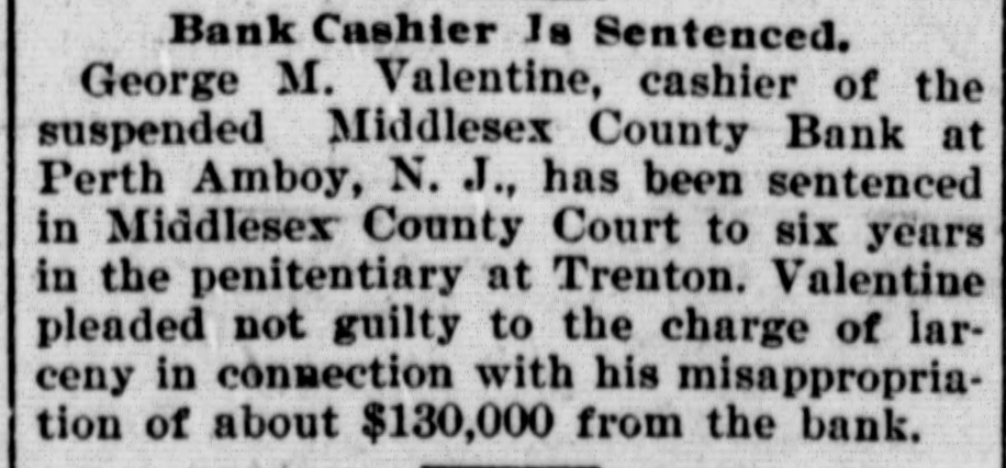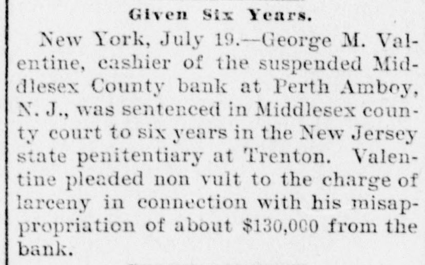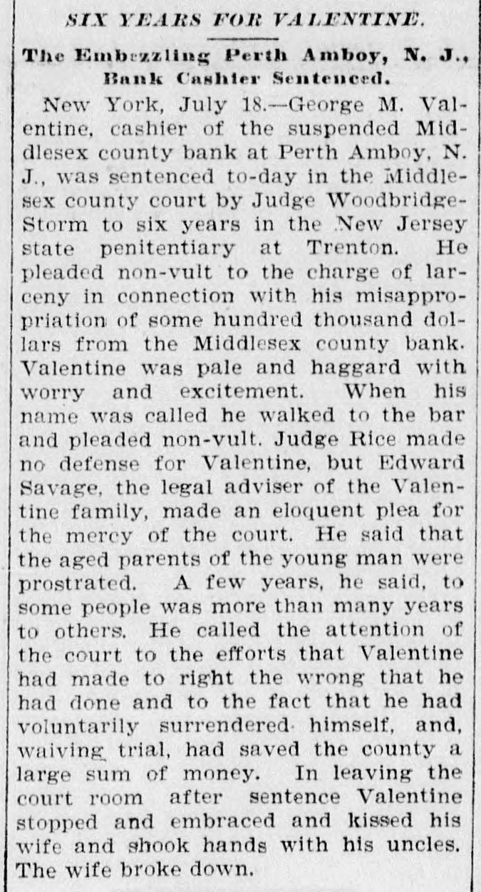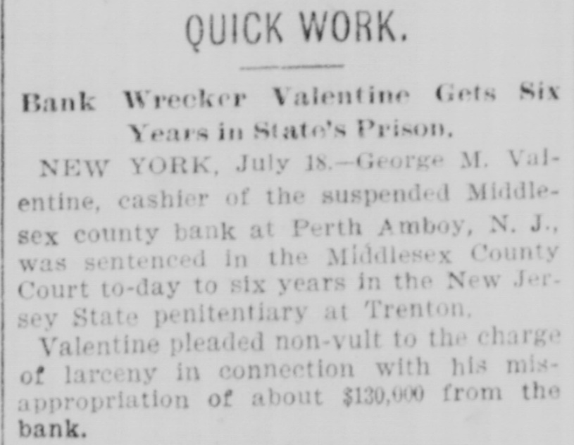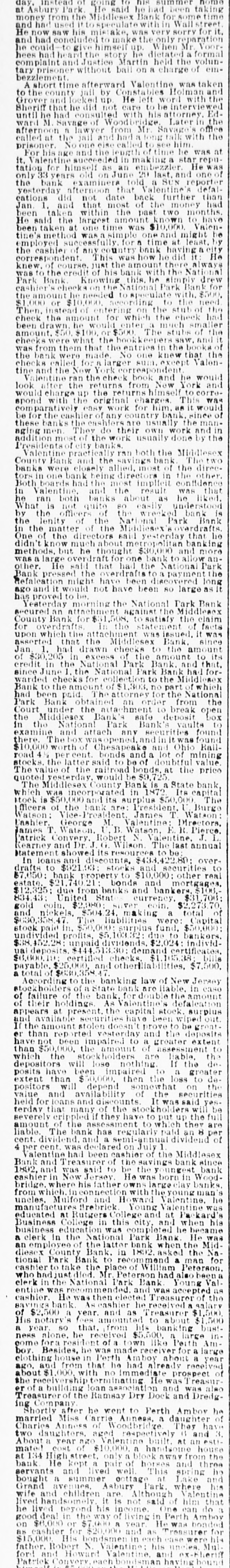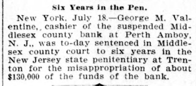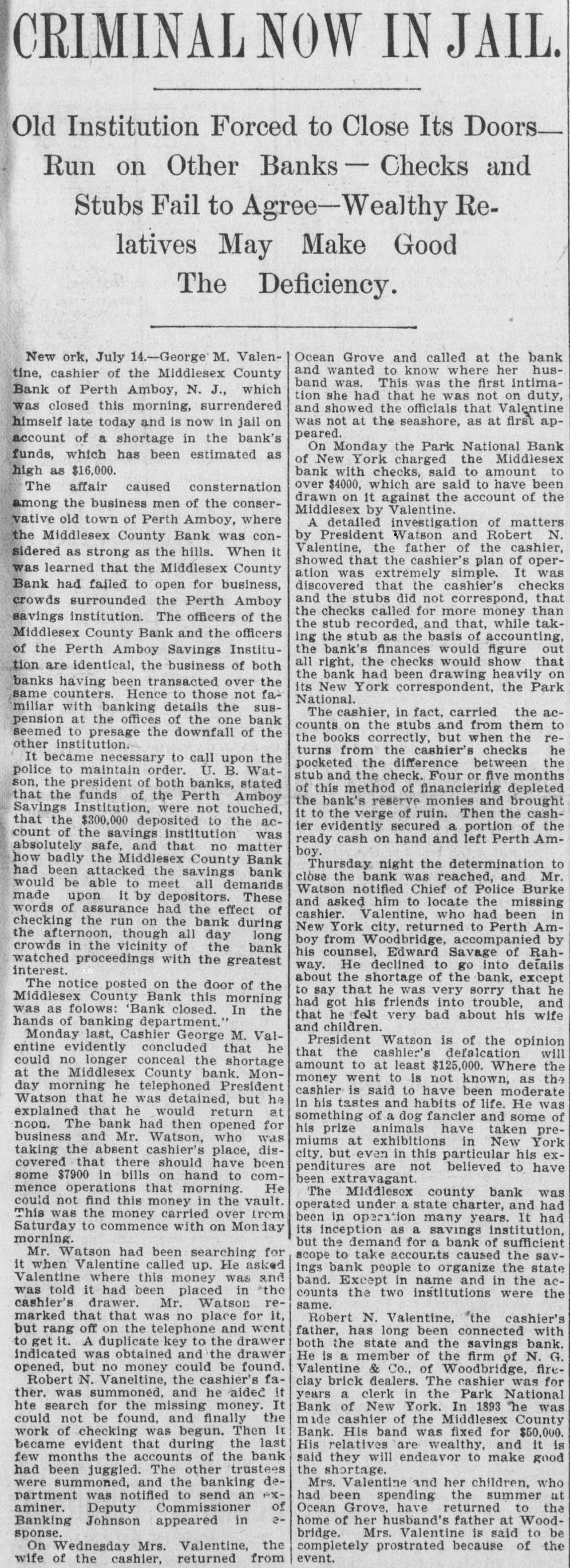 CRIMINAL NOW IN JAIL. Old Institution Forced to Close Its Doors_ Run on Other Banks - Checks and Stubs Fail to Agree-Wealthy Relatives May Make Good The Deficiency. Ocean Grove and called at the bank New ork, July 14.-George M. Valenand wanted to know where her hustine, cashier of the Middlesex County band was. This was the first intimaBank of Perth Amboy, N. J., which tion she had that he was not on duty, was closed this morning, surrendered and showed the officials that Valentine was not at the seashore, as at first aphimself late today and is now in jail on peared. account of a shortage in the bank's On Monday the Park National Bank funds, which has been estimated as of New York charged the Middlesex high as $16,000. bank with checks, said to amount to over $4000, which are said to have been The affair caused consternation drawn on it against the account of the among the business men of the conserMiddlesex by Valentine. vative old town of Perth Amboy, where A detailed investigation of matters by President Watson and Robert N. the Middlesex County Bank was conValentine, the father of the cashier, sidered as strong as the hills. When it showed that the cashier's plan of operwas learned that the Middlesex County ation was extremely simple. It was discovered that the cashier's checks Bank had failed to open for business, and the stubs did not correspond, that crowds surrounded the Perth Amboy the checks called for more money than savings institution. The officers of the the stub recorded, and that, while takMiddlesex County Bank and the officers ing the stub as the basis of accounting, the bank's finances would figure out of the Perth Amboy Savings Instituall right, the checks would show that tion are identical, the business of both the bank had been drawing heavily on banks having been transacted over the its New York correspondent, the Park same counters. Hence to those not faNational. miliar with banking details the susThe cashier, in fact, carried the acpension at the offices of the one bank counts on the stubs and from them to seemed to presage the downfall of the the books correctly, but when the reother institution. turns from the cashier's checks he It became necessary to call upon the pocketed the difference between the police to maintain order. U. B. Watstub and the check. Four or five months son, the president of both banks, stated of this method of financiering depleted that the funds of the Perth Amboy the bank's reserve monies and brought Savings Institution, were not touched, it to the verge of ruin. Then the cashthat the $300,000 deposited to the acier evidently secured a portion of the count of the savings institution was ready cash on hand and left Perth Amabsolutely safe, and that no matter boy. how badly the Middlesex County Bank Thursday night the determination to had been attacked the savings bank clòse the bank was reached, and Mr. would be able to meet all demands Watson notified Chief of Police Burke made upon it by depositors. These and asked him to locate the missing words of assurance had the effect of cashier. Valentine, who had been in checking the run on the bank during New York city, returned to Perth Amthe afternoon, though all day long boy from Woodbridge, accompanied by crowds in the vicinity of the bank his counsel, Edward Savage of Rahwatched proceedings with the greatest way. He declined to go into details interest. about the shortage of the bank, except The notice posted on the door of the to say that he was very sorry that he Middlesex County Bank this morning had got his friends into trouble, and was as folows: 'Bank closed. In the that he felt very bad about his wife hands of banking department." and children. Monday last, Cashier George M. ValPresident Watson is of the opinion entine evidently concluded that he that the cashier's defalcation will could no longer conceal the shortage amount to at least $125,000. Where the at the Middlesex County bank. Monmoney went to is not known, as the day morning he telephoned President cashier is said to have been moderate Watson that he was detained, but he in his tastes and habits of life. He was explained that he would return at something of a dog fancier and some of noon. The bank had then opened for his prize animals have taken prebusiness and Mr. Watson, who was miums at exhibitions in New York taking the absent cashier's place, discity. but even in this particular his excovered that there should have been penditures are not believed to have some $7900 in bills on hand to combeen extravagant. mence operations that morning. He The Middlesex county bank was could not find this money in the vault. operated under a state charter, and had This was the money carried over from been in operation many years. It had Saturday to commence with on Monday its inception as a savings institution, morning. but the demand for a bank of sufficient Mr. Watson had been searching for scope to take accounts caused the savit when Valentine called up. He asked ings bank people to organize the state Valentine where this money was and band. Except in name and in the acwas told it had been placed in *the counts the two institutions were the cashier's drawer. Mr. Watson resame. marked that that was no place for it, Robert N. Valentine, the cashier's but rang off on the telephone and went father, has long been connected with to get it. A duplicate key to the drawer both the state and the savings bank. indicated was obtained and the drawer He is a member of the firm of N. G. opened, but no money could be found. Valentine & Co., of Woodbridge, fireRobert N. Vaneltine, the cashier's faclay brick dealers. The cashier was for ther. was summoned, and he aided it years a clerk in the Park National hte search for the missing money. It Bank of New York. In 1893 "he was could not be found, and finally the mide cashier of the Middlesex County work of checking was begun. Then it Bank. His band was fixed for $50,000. became evident that during 
