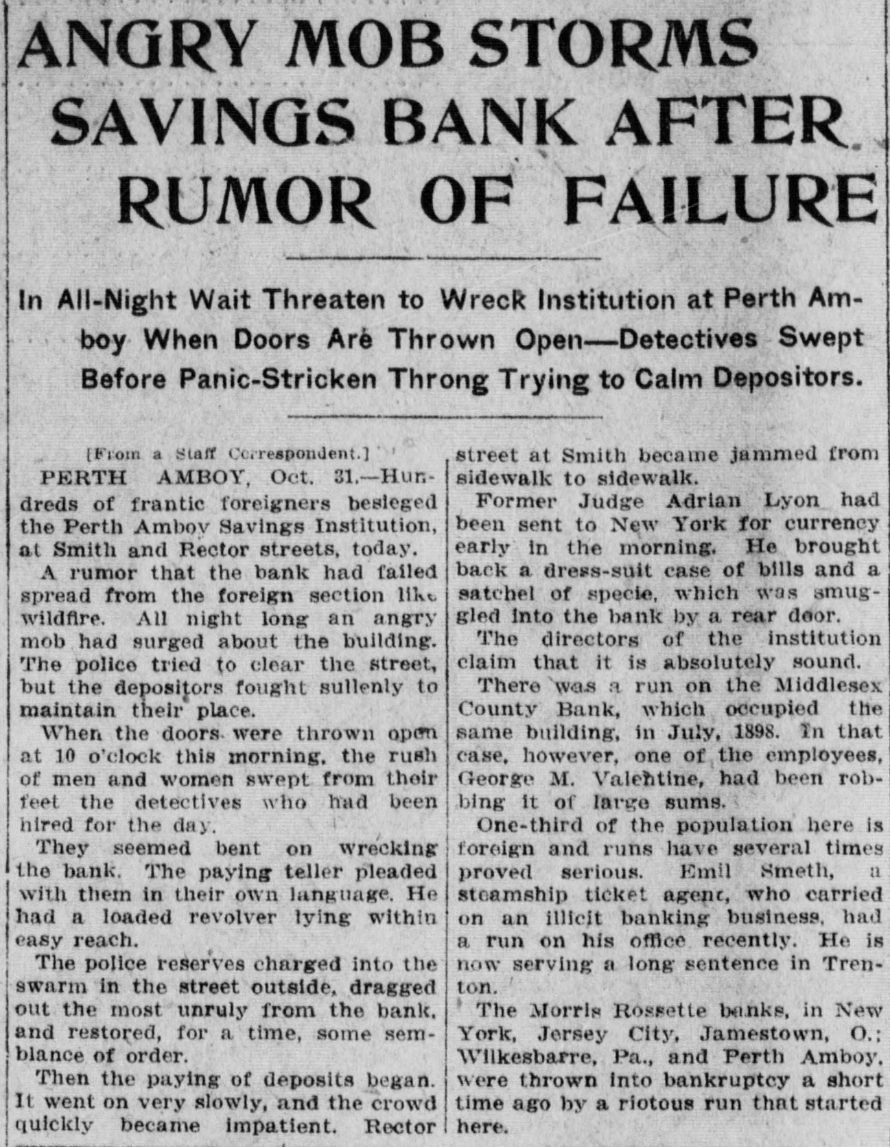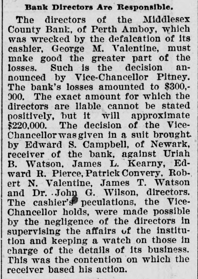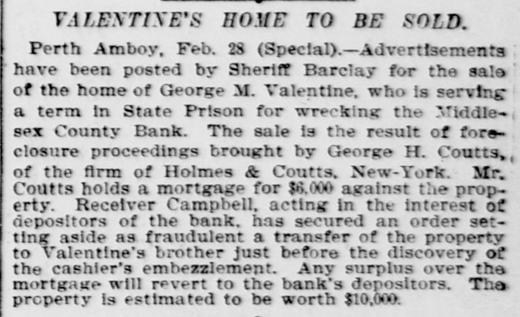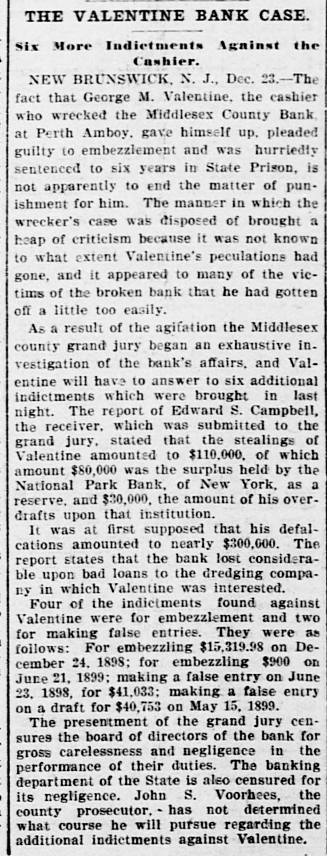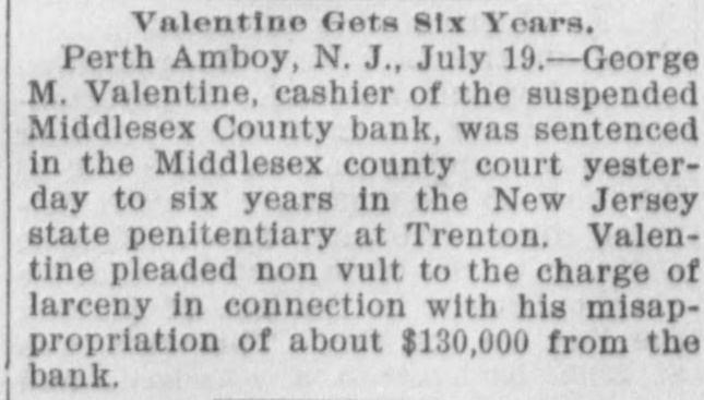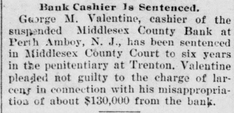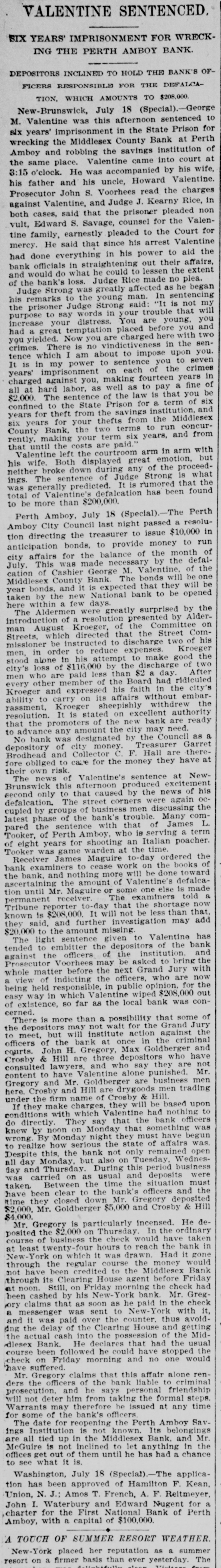 CRIMINAL NOW IN JAIL. Old Institution Forced to Close Its Doors_ Run on Other Banks - Checks and Stubs Fail to Agree-Wealthy Relatives May Make Good The Deficiency. Ocean Grove and called at the bank New ork, July 14.-George M. Valenand wanted to know where her hustine, cashier of the Middlesex County band was. This was the first intimaBank of Perth Amboy, N. J., which tion she had that he was not on duty, was closed this morning, surrendered and showed the officials that Valentine was not at the seashore, as at first aphimself late today and is now in jail on peared. account of a shortage in the bank's On Monday the Park National Bank funds, which has been estimated as of New York charged the Middlesex high as $16,000. bank with checks, said to amount to over $4000, which are said to have been The affair caused consternation drawn on it against the account of the among the business men of the conserMiddlesex by Valentine. vative old town of Perth Amboy, where A detailed investigation of matters by President Watson and Robert N. the Middlesex County Bank was conValentine, the father of the cashier, sidered as strong as the hills. When it showed that the cashier's plan of operwas learned that the Middlesex County ation was extremely simple. It was discovered that the cashier's checks Bank had failed to open for business, and the stubs did not correspond, that crowds surrounded the Perth Amboy the checks called for more money than savings institution. The officers of the the stub recorded, and that, while takMiddlesex County Bank and the officers ing the stub as the basis of accounting, the bank's finances would figure out of the Perth Amboy Savings Instituall right, the checks would show that tion are identical, the business of both the bank had been drawing heavily on banks having been transacted over the its New York correspondent, the Park same counters. Hence to those not faNational. miliar with banking details the susThe cashier, in fact, carried the acpension at the offices of the one bank counts on the stubs and from them to seemed to presage the downfall of the the books correctly, but when the reother institution. turns from the cashier's checks he It became necessary to call upon the pocketed the difference between the police to maintain order. U. B. Watstub and the check. Four or five months son, the president of both banks, stated of this method of financiering depleted that the funds of the Perth Amboy the bank's reserve monies and brought Savings Institution, were not touched, it to the verge of ruin. Then the cashthat the $300,000 deposited to the acier evidently secured a portion of the count of the savings institution was ready cash on hand and left Perth Amabsolutely safe, and that no matter boy. how badly the Middlesex County Bank Thursday night the determination to had been attacked the savings bank clòse the bank was reached, and Mr. would be able to meet all demands Watson notified Chief of Police Burke made upon it by depositors. These and asked him to locate the missing words of assurance had the effect of cashier. Valentine, who had been in checking the run on the bank during New York city, returned to Perth Amthe afternoon, though all day long boy from Woodbridge, accompanied by crowds in the vicinity of the bank his counsel, Edward Savage of Rahwatched proceedings with the greatest way. He declined to go into details interest. about the shortage of the bank, except The notice posted on the door of the to say that he was very sorry that he Middlesex County Bank this morning had got his friends into trouble, and was as folows: 'Bank closed. In the that he felt very bad about his wife hands of banking department." and children. Monday last, Cashier George M. ValPresident Watson is of the opinion entine evidently concluded that he that the cashier's defalcation will could no longer conceal the shortage amount to at least $125,000. Where the at the Middlesex County bank. Monmoney went to is not known, as the day morning he telephoned President cashier is said to have been moderate Watson that he was detained, but he in his tastes and habits of life. He was explained that he would return at something of a dog fancier and some of noon. The bank had then opened for his prize animals have taken prebusiness and Mr. Watson, who was miums at exhibitions in New York taking the absent cashier's place, discity. but even in this particular his excovered that there should have been penditures are not believed to have some $7900 in bills on hand to combeen extravagant. mence operations that morning. He The Middlesex county bank was could not find this money in the vault. operated under a state charter, and had This was the money carried over from been in operation many years. It had Saturday to commence with on Monday its inception as a savings institution, morning. but the demand for a bank of sufficient Mr. Watson had been searching for scope to take accounts caused the savit when Valentine called up. He asked ings bank people to organize the state Valentine where this money was and band. Except in name and in the acwas told it had been placed in *the counts the two institutions were the cashier's drawer. Mr. Watson resame. marked that that was no place for it, Robert N. Valentine, the cashier's but rang off on the telephone and went father, has long been connected with to get it. A duplicate key to the drawer both the state and the savings bank. indicated was obtained and the drawer He is a member of the firm of N. G. opened, but no money could be found. Valentine & Co., of Woodbridge, fireRobert N. Vaneltine, the cashier's faclay brick dealers. The cashier was for ther. was summoned, and he aided it years a clerk in the Park National hte search for the missing money. It Bank of New York. In 1893 "he was could not be found, and finally the mide cashier of the Middlesex County work of checking was begun. Then it Bank. His band was fixed for $50,000. became evident that during 