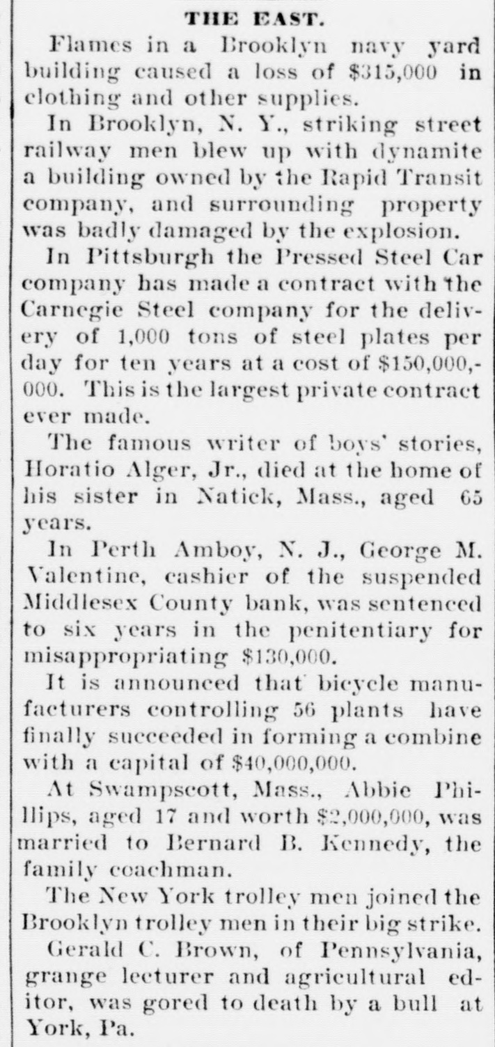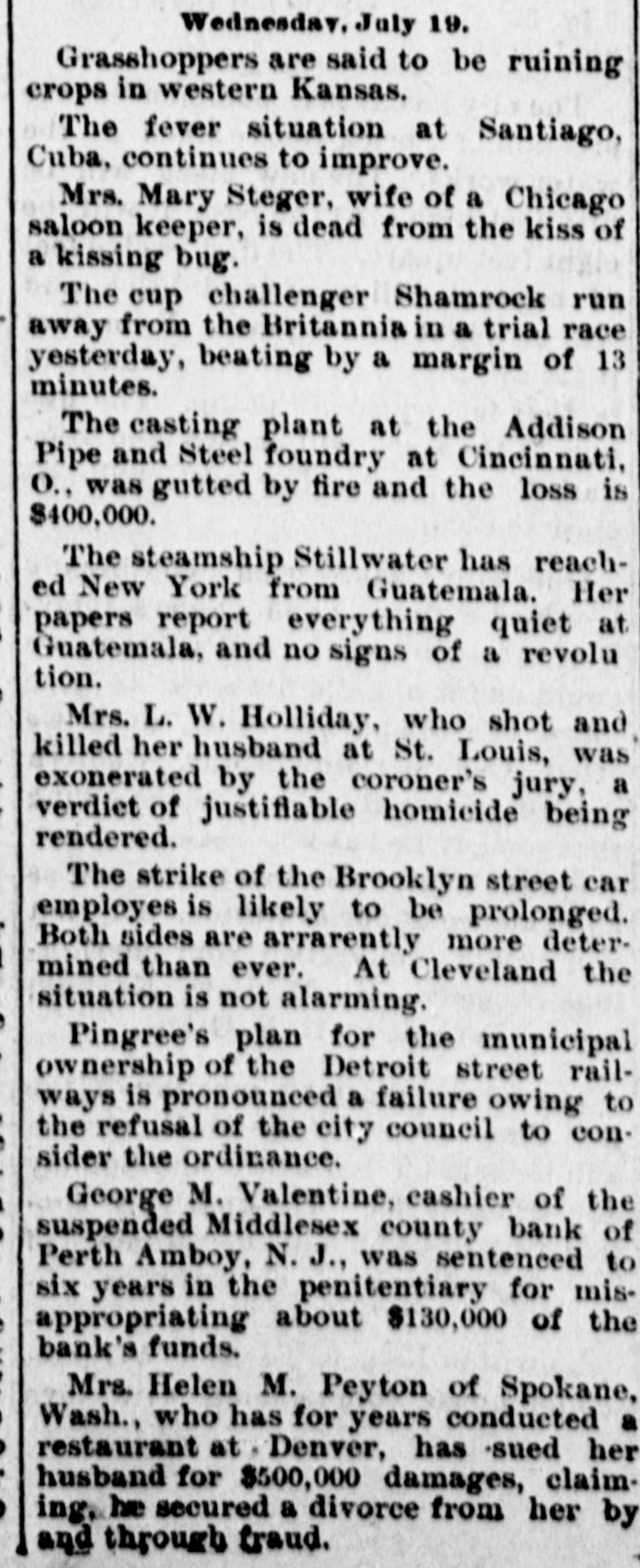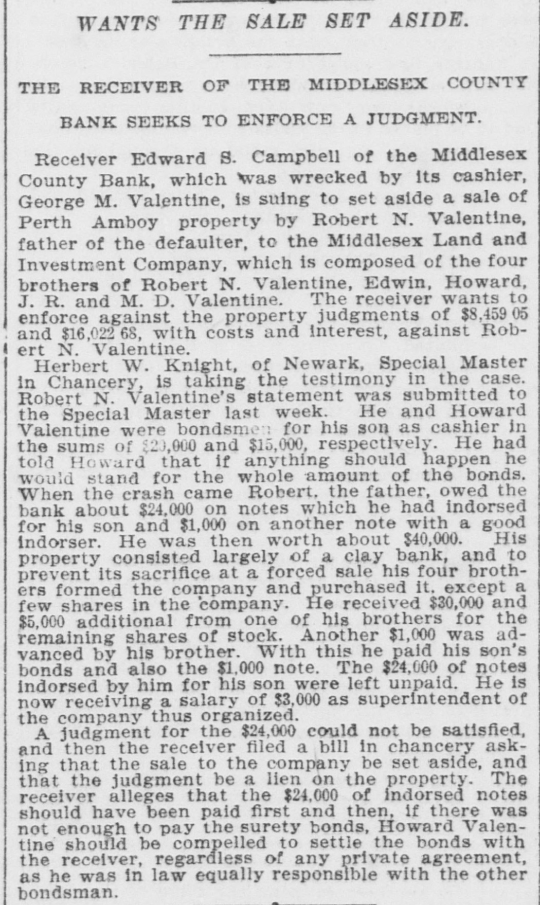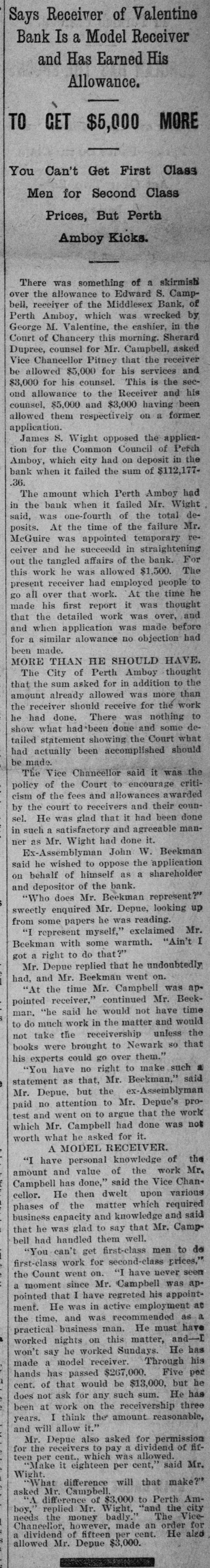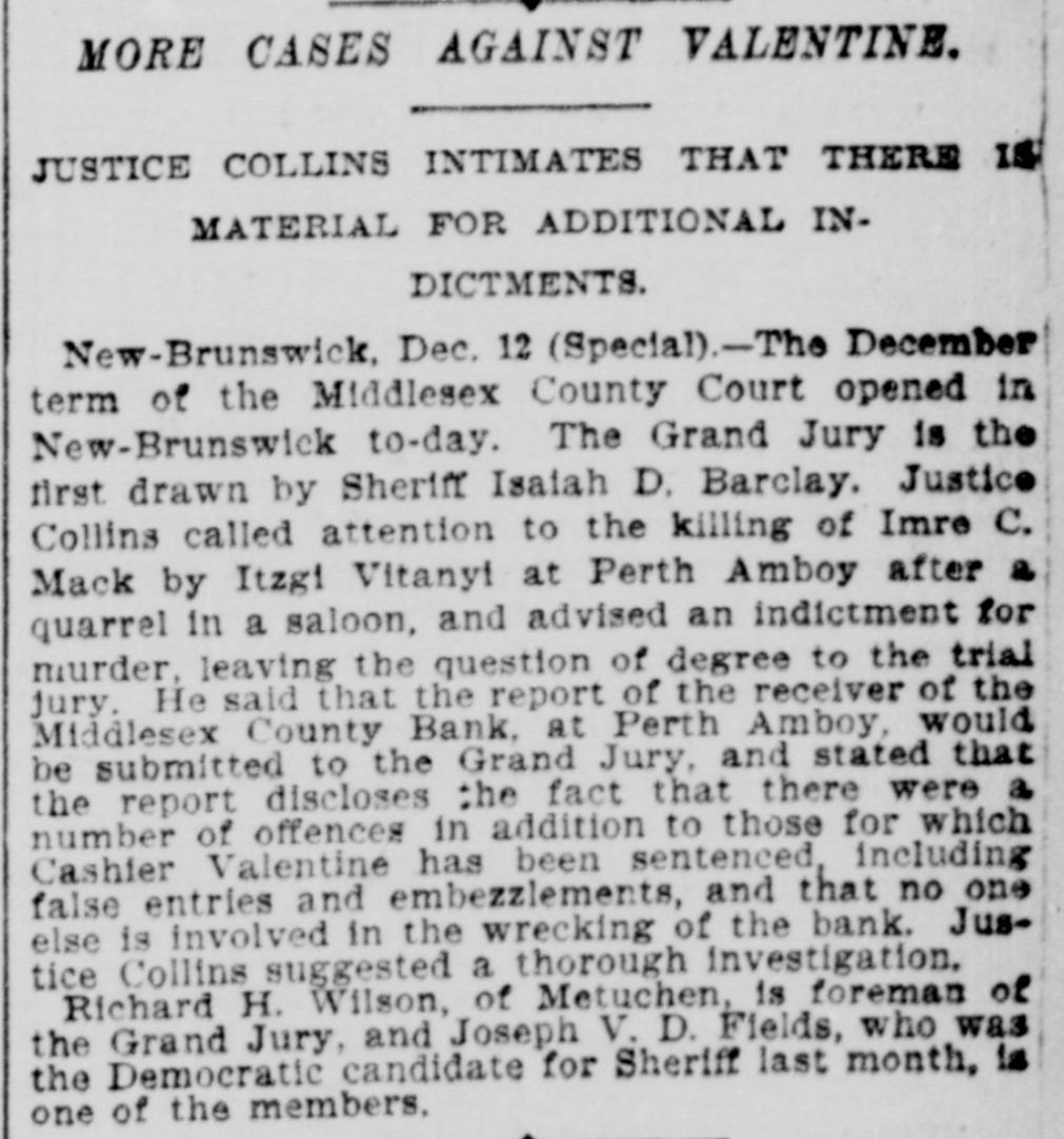 CRIMINAL NOW IN JAIL. Old Institution Forced to Close Its Doors_ Run on Other Banks - Checks and Stubs Fail to Agree-Wealthy Relatives May Make Good The Deficiency. Ocean Grove and called at the bank New ork, July 14.-George M. Valenand wanted to know where her hustine, cashier of the Middlesex County band was. This was the first intimaBank of Perth Amboy, N. J., which tion she had that he was not on duty, was closed this morning, surrendered and showed the officials that Valentine was not at the seashore, as at first aphimself late today and is now in jail on peared. account of a shortage in the bank's On Monday the Park National Bank funds, which has been estimated as of New York charged the Middlesex high as $16,000. bank with checks, said to amount to over $4000, which are said to have been The affair caused consternation drawn on it against the account of the among the business men of the conserMiddlesex by Valentine. vative old town of Perth Amboy, where A detailed investigation of matters by President Watson and Robert N. the Middlesex County Bank was conValentine, the father of the cashier, sidered as strong as the hills. When it showed that the cashier's plan of operwas learned that the Middlesex County ation was extremely simple. It was discovered that the cashier's checks Bank had failed to open for business, and the stubs did not correspond, that crowds surrounded the Perth Amboy the checks called for more money than savings institution. The officers of the the stub recorded, and that, while takMiddlesex County Bank and the officers ing the stub as the basis of accounting, the bank's finances would figure out of the Perth Amboy Savings Instituall right, the checks would show that tion are identical, the business of both the bank had been drawing heavily on banks having been transacted over the its New York correspondent, the Park same counters. Hence to those not faNational. miliar with banking details the susThe cashier, in fact, carried the acpension at the offices of the one bank counts on the stubs and from them to seemed to presage the downfall of the the books correctly, but when the reother institution. turns from the cashier's checks he It became necessary to call upon the pocketed the difference between the police to maintain order. U. B. Watstub and the check. Four or five months son, the president of both banks, stated of this method of financiering depleted that the funds of the Perth Amboy the bank's reserve monies and brought Savings Institution, were not touched, it to the verge of ruin. Then the cashthat the $300,000 deposited to the acier evidently secured a portion of the count of the savings institution was ready cash on hand and left Perth Amabsolutely safe, and that no matter boy. how badly the Middlesex County Bank Thursday night the determination to had been attacked the savings bank clòse the bank was reached, and Mr. would be able to meet all demands Watson notified Chief of Police Burke made upon it by depositors. These and asked him to locate the missing words of assurance had the effect of cashier. Valentine, who had been in checking the run on the bank during New York city, returned to Perth Amthe afternoon, though all day long boy from Woodbridge, accompanied by crowds in the vicinity of the bank his counsel, Edward Savage of Rahwatched proceedings with the greatest way. He declined to go into details interest. about the shortage of the bank, except The notice posted on the door of the to say that he was very sorry that he Middlesex County Bank this morning had got his friends into trouble, and was as folows: 'Bank closed. In the that he felt very bad about his wife hands of banking department." and children. Monday last, Cashier George M. ValPresident Watson is of the opinion entine evidently concluded that he that the cashier's defalcation will could no longer conceal the shortage amount to at least $125,000. Where the at the Middlesex County bank. Monmoney went to is not known, as the day morning he telephoned President cashier is said to have been moderate Watson that he was detained, but he in his tastes and habits of life. He was explained that he would return at something of a dog fancier and some of noon. The bank had then opened for his prize animals have taken prebusiness and Mr. Watson, who was miums at exhibitions in New York taking the absent cashier's place, discity. but even in this particular his excovered that there should have been penditures are not believed to have some $7900 in bills on hand to combeen extravagant. mence operations that morning. He The Middlesex county bank was could not find this money in the vault. operated under a state charter, and had This was the money carried over from been in operation many years. It had Saturday to commence with on Monday its inception as a savings institution, morning. but the demand for a bank of sufficient Mr. Watson had been searching for scope to take accounts caused the savit when Valentine called up. He asked ings bank people to organize the state Valentine where this money was and band. Except in name and in the acwas told it had been placed in *the counts the two institutions were the cashier's drawer. Mr. Watson resame. marked that that was no place for it, Robert N. Valentine, the cashier's but rang off on the telephone and went father, has long been connected with to get it. A duplicate key to the drawer both the state and the savings bank. indicated was obtained and the drawer He is a member of the firm of N. G. opened, but no money could be found. Valentine & Co., of Woodbridge, fireRobert N. Vaneltine, the cashier's faclay brick dealers. The cashier was for ther. was summoned, and he aided it years a clerk in the Park National hte search for the missing money. It Bank of New York. In 1893 "he was could not be found, and finally the mide cashier of the Middlesex County work of checking was begun. Then it Bank. His band was fixed for $50,000. became evident that during 