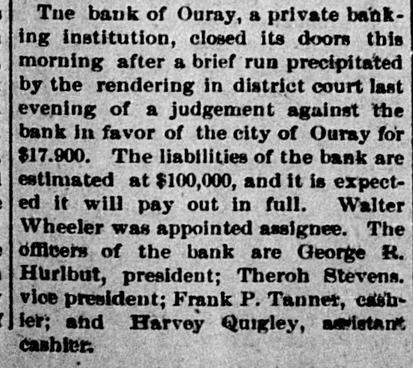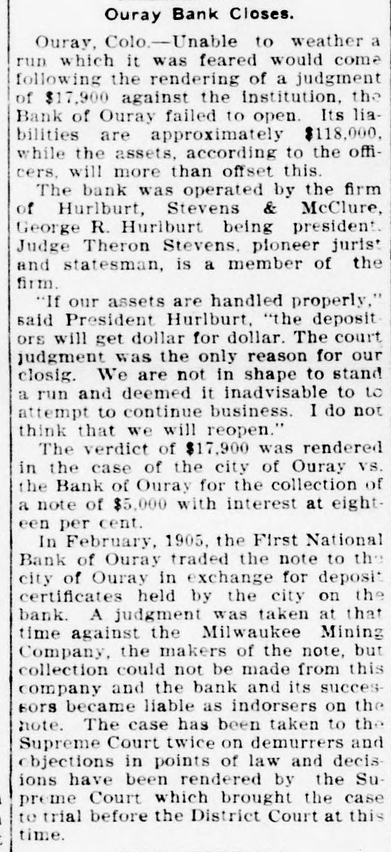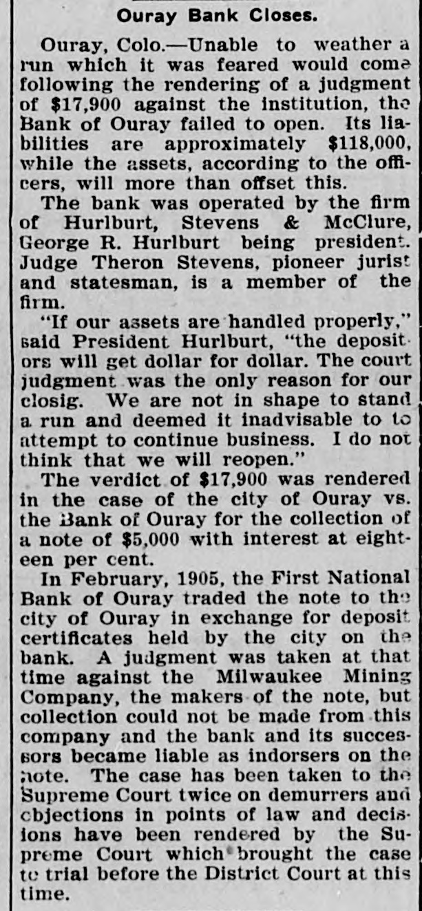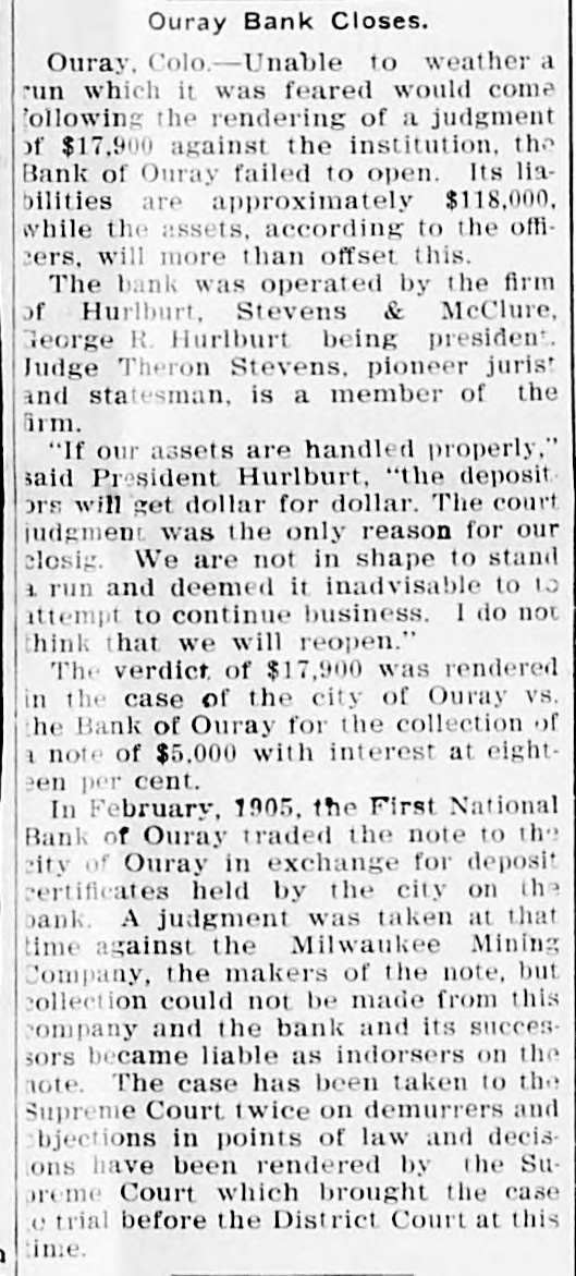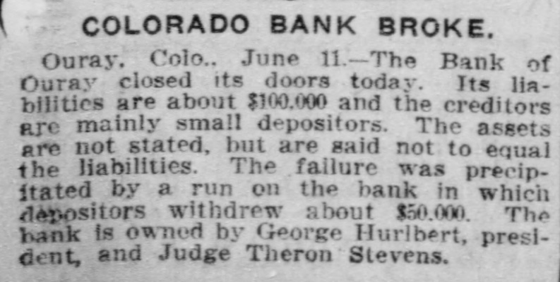 Patrick Gibbons, supposed 10 DO Insane, brutally assaulted Mrs. Chris Jorgensen, aged 87, at Anaconda, Mont. A crowd of women attempted to lynch Gibbons and would have succeeded ,but for the officers. Wells Morton, a prominent broker and promoter, has been found by the Goldfield mining stock exchange to be insolvent. The failure was caused by short interests in Jumbo Extension and other rising securities. J. Ross Clark of the Salt Lake Route states that trains should be running into Goldfield by Sept. 1, and that rights-of-way are being secured through Columbia, Diamondfield and other towns on the way to Tonopah. While pursuing two Montana horse thieves, Sheriff Guy and a posse from Johnson county, Wyoming, shot and killed one of the robbers that held up a Northern Pacific passenger train at Welch Spur recently. The other man escaped. For the first time in the history of the Wells-Fargo Express company anywhere, it has made a shipment of structural steel in carload lots by express. Two carloads of iron and steel to be used in the completion of the new Goldfield News building was shipped from Reno to Goldfield by express. The Bank of Ouray, Colo., nas closed its doors. Its liabilities are about $100,000 the creditors are mainly small depositors. The assets are not stated, but are said not to equal the liabilities. The failure was precipitated by a run on the bank in which depositors withdrew about $50,000. The train dispatchers of Sparks, Verdi and Reno complain that the Southern Pacific company is not obeying the eight-hour law in regard to operators and dispatchers passed by the last legislature, and have asked District Attorney Moran to take action against the company to enforce the law.