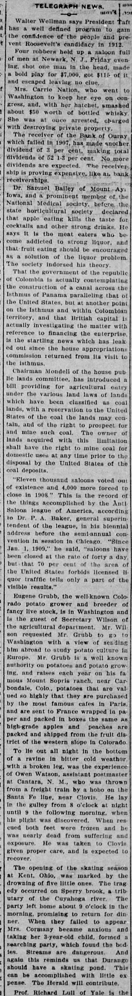 198 TELEGRAPH NEWS. mard Walter Wellman says President Taft well defined program to gain prehas confidence a of the people and 1912. vent the Roosevelt's candidacy in full Four robbers held up a saloon men at Newark, N. J., Friday made evenof shot one man in the head, of it ing. bold play for $7,000, got $116 and a escaped leaving no clue, to Mrs. Carrie Nation. who went Washington to keep her eye smashed on conand. with her hatchet, whisky gress, $50 worth of bottled about She was at once arrested, charged with destroying private property. The receiver of the Bank of another Ouray which failed in 1907, has made total dividend of 3 per cent. making dividends of 52 1-3 per cent. No more dividends are expected. The receiver bank ship is proving expensive. like au receiverships. Dr. Samuel Balley of Mount - A of the and a prominent member the National Iowa, Medical society, before declared state horticultural society for apple eating kills the taste He cocktails that and other strong drinks. who be it Is the meat eaters and come says addicted to strong liquor, encouraged fruit eating should be problem. that a solution of the liquor The as society indorsed his theory. That the government of the republic Colombia is actually contemplating the of construction of a canal across that of the Isthmus of Panama paralleling point United States, but at another Colombian the the Isthmus and within is on and that British capital with territory, investigating the matter reference actually to financing the enterprise leak the startling news which has is since the house appropriations to ed commission out returned from its visit the isthmus. Mondell of the house pub Chairman lands committee. has introduced entry lic providing for agricultural lands bill the various land laws of coal under have been classified as United which with a reservation to the conlands, of the coal the lands may for States and of the right to prospect owner of tain, mine such coal. The limitation lands and acquired with this coal for have the right to mine to the shall uses at any time prior of the disposal domestic by the United States coal deposits. "Eleven thousand saloons voted forced out to of existence and 4,000 more record of in 1908." This is the Anti close things accomplished by according the the league of America, superinin Saloon to Dr. P. A. Baker, general his biennial tendent of the league, semi-annual conbefore "Since in session in address vention the Chicago have 1. 1909." he said, "saloons a day, Jan. closed at the rate of forty area of been that 70 per cent of the licensed IIbut United States forbids of the quor the traffic tells only a part visible results." Colo Eugene Grubb, the well-known breeder of potato grower and and rado live stock, is in Washington Wilson of fancy guest of Secretary Mr. Wil is the agricultural department. to go to the requested Mr. Grubb sending son with a view of culture in Washington abroad to study potato known him Mr. Grubb is a well growEurope. on potatoes and potato his fa authority and raises each year on Caring. Mount Sopris ranch. near are val mous Colo., potatoes that purchased bondale, 80 highly that they are in Paris, ued the most famous cafes in paby sent to France wrapped as and and are packed in boxes peaches the same are high-grade per apples and the fruit dis and shipped from Colorado packed of the western slope in bottom trict lie out all night in the weather To ravine in bitter cold experience of a broken leg. was the postmaster with Owen a Watson, assistant thrown of Cantara. N. M., who was on the from at a freight train by Clovis. a hobo He lay Fe line. near at night Santa gulley from 8 o'clock when in the the following morning. resuntil plight 9 was discovered When and he his both feet were frozen and cued nearly dead from suffering Clovis was He was taken to to recover. exposure. given proper care, and is expected season skating The opening of the marked by the Ohio, was The trag at Kent, of five little ones. a trib drowning edy occurred on Cuyahoga Sperry brook, river. The utary of the about 9 o'clock in din- the morning, party left promising home to return for appear When they failed anxious to and ner. Cormany became child. formed a Mrs. her 3-year-old the bod taking party, which found And searching Streams are dangerous. Durango tes. this reminds us that pond. This again have a skating little ex should accomplished with contribute. I can be The Herald will is pense. Prof. Richard Lull of Yale the