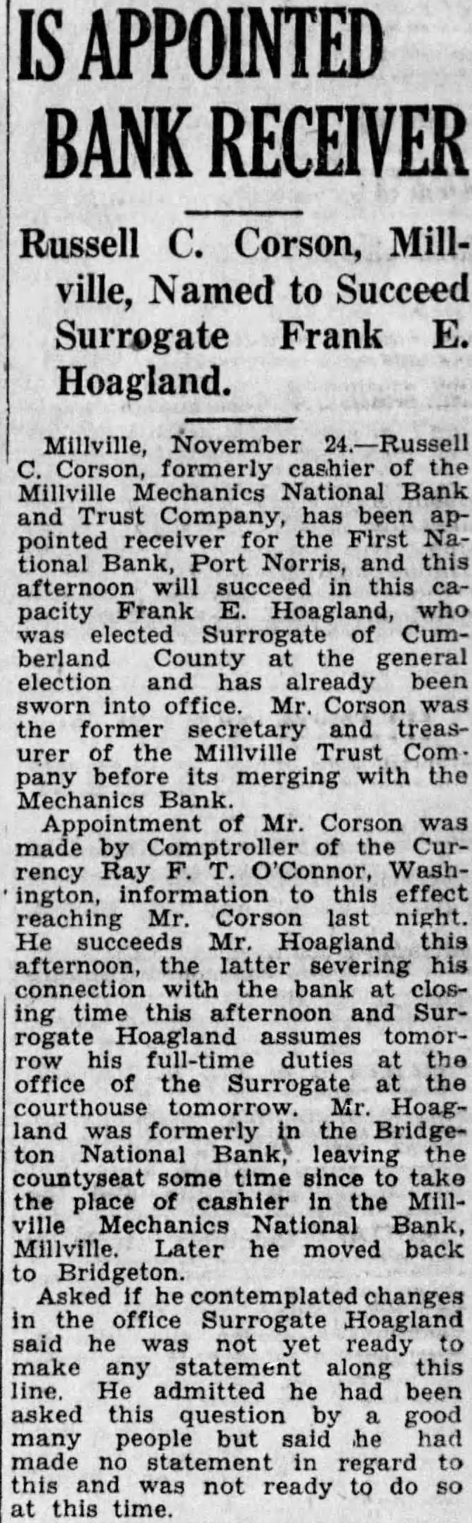 BANK RECEIVER Russell C. Corson, Millville, Named to Succeed Surrogate Frank E. Hoagland. Millville, November formerly cashier Millville Mechanics National Bank Trust Company, has been pointed receiver for the First tional Bank, Port Norris, and this afternoon will succeed in this pacity Frank Hoagland, who elected Surrogate Cumberland County the general election already been sworn into office. Mr. Corson was the secretary and urer the Millville Trust Com. before merging with the Mechanics Bank. Appointment Mr. Corson was the Currency Ray O'Connor, Washington, information to this effect reaching Corson last night. succeeds Mr. Hoagland afternoon, the latter severing connection bank closing time Surrogate Hoagland tomorhis full-time duties the office of the Surrogate courthouse tomorrow. Mr. Hoagland formerly the BridgeNational Bank, leaving countyseat some time since take place cashier the Millville Mechanics National Bank, Millville. Later moved back Asked the office Surrogate Hoagland said ready make along this line He admitted he had been asked this question good many people said he had made statement regard to this and was not ready to do SO this time.