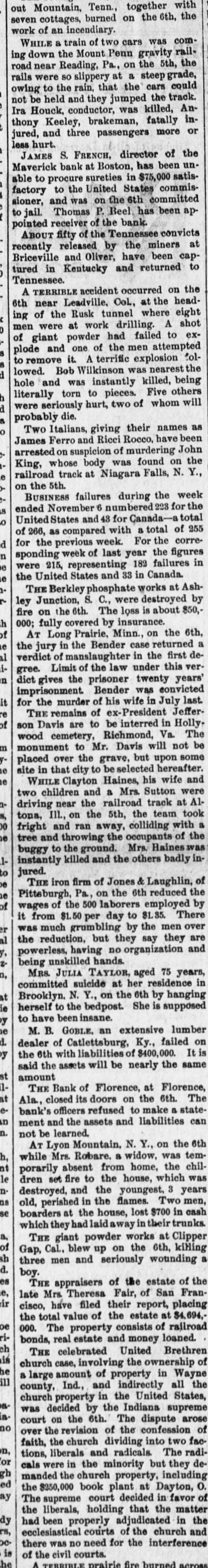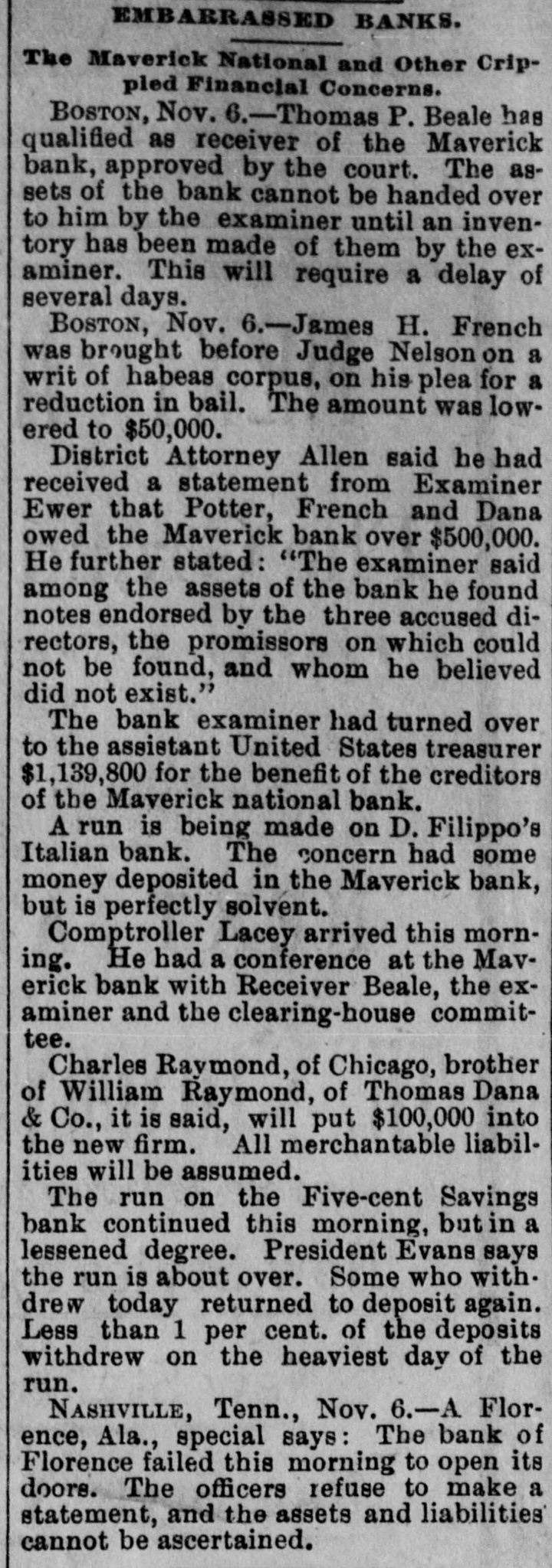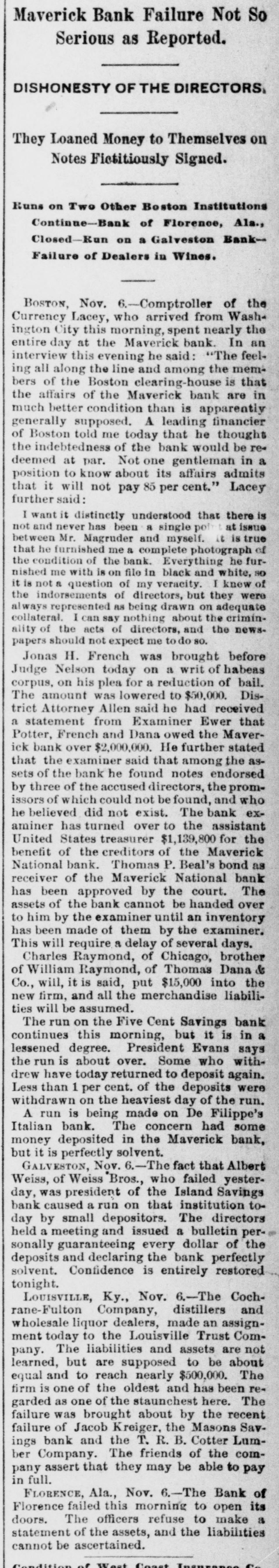Maverick Bank Failure Not So Serious as Reported. DISHONESTY OF THE DIRECTORS, They Loaned Money to Themselves on Notes Fictitiously Signed. Runs on Two Other Boston Institutions Continue-Bank of Florence, Ala., Closed-Run on a Galveston BankFailure of Dealers in Wines. BOSTON, Nov. 6.-Comptroller of the Currency Lacey, who arrived from Wash ington City this morning, spent nearly the entire day at the Maverick bank. In an interview this evening he said: "The feeling all along the line and among the members of the Boston clearing-house is that the affairs of the Maverick bank are in much better condition than is apparently generally supposed. A leading financier of Boston told me today that he thought the indebtedness of the bank would be redeemed at par. Not one gentleman in a position to know about its affairs admits that it will not pay 85 per cent." Lacey further said: I want it distinctly understood that there is not and never has been a single pot tissue between Mr. Magruder and myself. it is true that he furnished me a complete photograph of the condition of the bank. Everything he furnished me with is on file in black and white, so it is not a question of my veracity. I knew of the indorsements of directors, but they were always represented as being drawn on adequate collateral. I can say nothing about the criminality of the acts of directors, and the newspapers should not expect me to do so. Jonas H. French was brought before Judge Nelson today on a writ of habeas corpus, on his plea for a reduction of bail. The amount was lowered to $50,000. District Attorney Allen said he had received a statement from Examiner Ewer that Potter, French and Dana owed the Maverick bank over $2,000,000. He further stated that the examiner said that among the assets of the bank he found notes endorsed by three of the accused directors, the promissors of which could not be found, and who he believed did not exist. The bank examiner has turned over to the assistant United States treasurer $1,139,800 for the benefit of the creditors of the Maverick National bank. Thomas P. Beal's bond as receiver of the Maverick National bank has been approved by the court. The assets of the bank cannot be handed over to him by the examiner until an inventory has been made of them by the examiner. This will require a delay of several days. Charles Raymond, of Chicago, brother of William Raymond, of Thomas Dana & Co., will, it is said, put $15,000 into the new firm, and all the merchandise liabilities will be assumed. The run on the Five Cent Savings bank continues this morning, but it is in a lessened degree. President Evans says the run is about over. Some who withdrew have today returned to deposit again. Less than 1 per cent. of the deposits were withdrawn on the heaviest day of the run. A run is being made on De Filippe's Italian bank. The concern had some money deposited in the Maverick bank, but it is perfectly solvent. GALVESTON, Nov. .-The fact that Albert Weiss, of Weiss Bros., who failed yesterday, was president of the Island Savings bank caused a run on that institution today by small depositors. The directors held a meeting and issued a bulletin personally guaranteeing every dollar of the deposits and declaring the bank perfectly solvent. Confidence is entirely restored tonight. LOUISVILLE, Ky., Nov. 6.-The Cochrane-Fulton Company, distillers and wholesale liquor dealers, made an assignment today to the Louisville Trust Company. The liabilities and assets are not learned, but are supposed to be about equal and to reach nearly $500,000. The firm is one of the oldest and has been regarded as one of the staunchest here. The failure was brought about by the recent failure of Jacob Kreiger, the Masons Savings bank and the T. R. B. Cotter Lumber Company. The friends of the company assert that they may be able to pay in full. FLORENCE, Ala., Nov. 6.-The Bank of Florence failed this morning to open its doors. The officers refuse to make a statement of the assets, and the liabilities cannot be ascertained. West Coast Increases