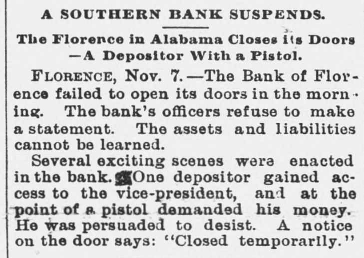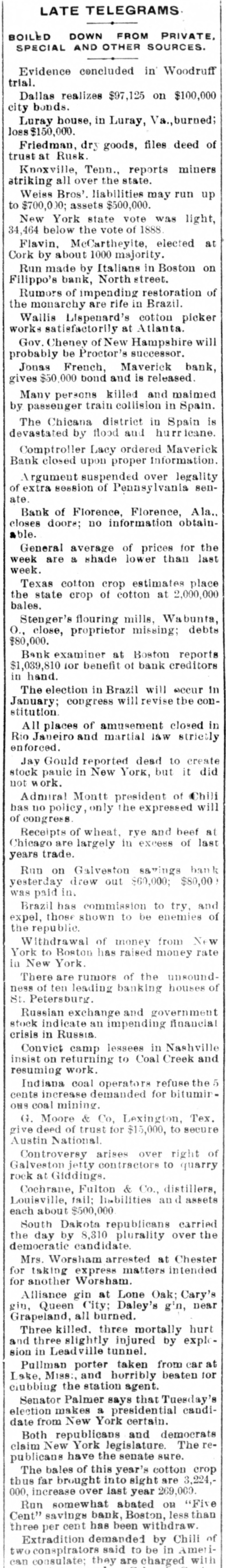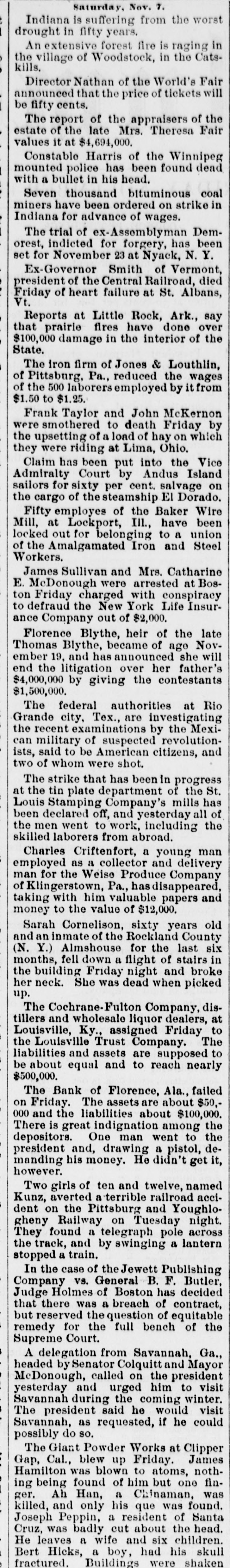 Maverick Bank Failure Not So Serious as Reported. DISHONESTY OF THE DIRECTORS, They Loaned Money to Themselves on Notes Fictitiously Signed. Runs on Two Other Boston Institutions Continue-Bank of Florence, Ala., Closed-Run on a Galveston BankFailure of Dealers in Wines. BOSTON, Nov. 6.-Comptroller of the Currency Lacey, who arrived from Wash ington City this morning, spent nearly the entire day at the Maverick bank. In an interview this evening he said: "The feeling all along the line and among the members of the Boston clearing-house is that the affairs of the Maverick bank are in much better condition than is apparently generally supposed. A leading financier of Boston told me today that he thought the indebtedness of the bank would be redeemed at par. Not one gentleman in a position to know about its affairs admits that it will not pay 85 per cent." Lacey further said: I want it distinctly understood that there is not and never has been a single pot tissue between Mr. Magruder and myself. it is true that he furnished me a complete photograph of the condition of the bank. Everything he furnished me with is on file in black and white, so it is not a question of my veracity. I knew of the indorsements of directors, but they were always represented as being drawn on adequate collateral. I can say nothing about the criminality of the acts of directors, and the newspapers should not expect me to do so. Jonas H. French was brought before Judge Nelson today on a writ of habeas corpus, on his plea for a reduction of bail. The amount was lowered to $50,000. District Attorney Allen said he had received a statement from Examiner Ewer that Potter, French and Dana owed the Maverick bank over $2,000,000. He further stated that the examiner said that among the assets of the bank he found notes endorsed by three of the accused directors, the promissors of which could not be found, and who he believed did not exist. The bank examiner has turned over to the assistant United States treasurer $1,139,800 for the benefit of the creditors of the Maverick National bank. Thomas P. Beal's bond as receiver of the Maverick National bank has been approved by the court. The assets of the bank cannot be handed over to him by the examiner until an inventory has been made of them by the examiner. This will require a delay of several days. Charles Raymond, of Chicago, brother of William Raymond, of Thomas Dana & Co., will, it is said, put $15,000 into the new firm, and all the merchandise liabilities will be assumed. The run on the Five Cent Savings bank continues this morning, but it is in a lessened degree. President Evans says the run is about over. Some who withdrew have today returned to deposit again. Less than 1 per cent. of the deposits were withdrawn on the heaviest day of the run. A run is being made on De Filippe's Italian bank. The concern had some money deposited in the Maverick bank, but it is perfectly solvent. GALVESTON, Nov. .-The fact that Albert Weiss, of Weiss Bros., who failed yesterday, was president of the Island Savings bank caused a run on that institution today by small depositors. The directors held a meeting and issued a bulletin personally guaranteeing every dollar of the deposits and declaring the bank perfectly solvent. Confidence is entirely restored tonight. LOUISVILLE, Ky., Nov. 6.-The Cochrane-Fulton Company, distillers and wholesale liquor dealers, made an assignment today to the Louisville Trust Company. The liabilities and assets are not learned, but are supposed to be about equal and to reach nearly $500,000. The firm is one of the oldest and has been regarded as one of the staunchest here. The failure was brought about by the recent failure of Jacob Kreiger, the Masons Savings bank and the T. R. B. Cotter Lumber Company. The friends of the company assert that they may be able to pay in full. FLORENCE, Ala., Nov. 6.-The Bank of Florence failed this morning to open its doors. The officers refuse to make a statement of the assets, and the liabilities cannot be ascertained. West Coast Increases