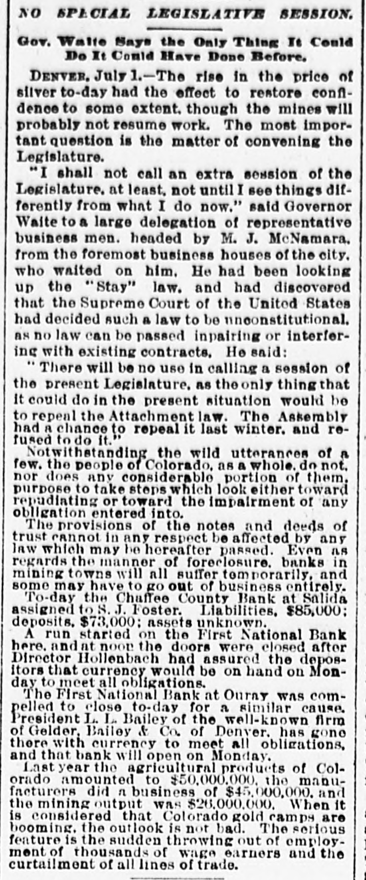 NO SPECIAL LEGISLATIVE SESSION. Gov. Walte Says the Only Thing It Could Do It Could Have Done Before. DENVER. July 1.-The rise in the price of silver to-day had the effect to restore confldence to some extent. though the mines will probably not resume work. The most important question is the matter of convening the Legislature. "I shall not call an extra session of the Legislature. at least, not until I see things differently from what I do now." said Governor Waite to a large delegation of representative business men. headed by M. J. McNamara. from the foremost business houses of the city. who waited on him. He had been looking up the "Stay" law. and had discovered that the Supreme Court of the United States had decided such a law to be unconstitutional. as no law can be passed inpairing or interferinc with existing contracts. He said: 'There will be no use in calling a session of the present Legislature. as the only thing that it could do in the present situation would be to repeal the Attachmentlaw. The Assembly had A chance to repeal it last winter. and refused to do it." Notwithstanding the wild utterances of a few. the people of Colorado, as a whole. do not. nor does any considerable portion of them. purpose to take steps which look either toward repudiating or toward the impairment of any obligation entered into. The provisions of the notes and deeds of trust cannot in any respect be affected by any law which may be hereafter passed. Even as regards the manner of foreclosure. banks in mining towns will all suffer tem porarily. and some may have to go out of business entirely. To-day the Chaffee County Bank at Salida assigned to S. J. Foster. Liabilities, $85,000; deposits. $73,000; assets unknown. A run started on the First National Bank here. and at noon the doors were closed after Director Hollenbach had assured the depositors that currency would be on hand on Monday to meet all obligations. The First National Bank at Ouray was compelled to close to-day for a similar cause. President L. L. Bailey of the well-known firm of Gelder. Bailey & Co. of Denver. has gone there with currency to meet all obligations, and that bank will open on Monday. Last year the agricultural products of Colorado amounted to $50,000,000, the manufacturers did n business of $45,000,000. and the mining output was $20,000,000. When it is considered that Colorado gold camps are booming. the outlook is not bad. The serious feature is the sudden throwing out of employment of thousands of wage earners and the curtailment of all lines of trade.