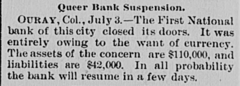 Multiple contemporaneous articles (early July 1893) report a run and that the First National Bank of Ouray closed/suspended due to want of currency and heavy withdrawals. Comptroller appointed a receiver in early August, but later (Oct 1893) numerous notices state the bank resumed business after about two months' suspension. No mention of a false/misinformation trigger; cause is broad money-market stringency/unusual withdrawals.