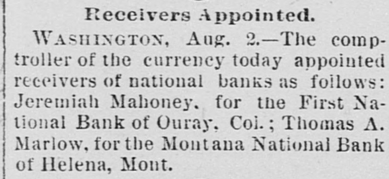 Receivers Appointed. WASHINGTON, Aug. 2.-The comptroller of the currency today appointed receivers of national banks as follows: Jeremiah Mahoney. for the First National Bank of Ouray, Col.; Thomas A. Marlow, for the Montana National Bank of Helena, Mont.