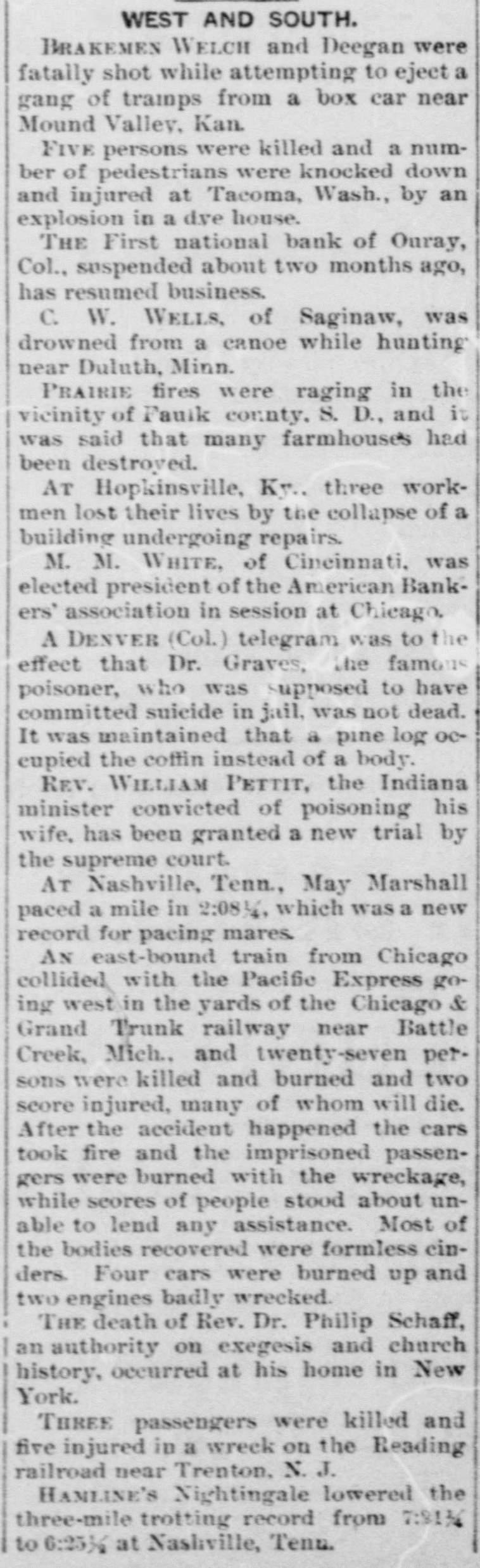 WEST AND SOUTH. BRAKEMEN WELCH and Deegan were fatally shot while attempting to eject a gang of tramps from a box car near Mound Valley, Kan. FIVE persons were killed and a number of pedestrians were knocked down and injured at Tacoma, Wash., by an explosion in a dye house. THE First national bank of Ouray, Col., suspended about two months ago, has resumed business. C. W. WELLS, of Saginaw, was drowned from a canoe while hunting near Duluth, Minn. PRAIRIE fires were raging in the vicinity of Fauik county. S. D., and it was said that many farmhouses had been destroyed. AT Hopkinsville, Ky., three workmen lost their lives by the collapse of a building undergoing repairs. M. M. WHITE, of Cincinnati, was elected president of the American Bankers' association in session at Chicago, A DENVER (Col.) telegram was to the effect that Dr. Graves, the famous poisoner, who was supposed to have committed suicide in jail, was not dead. It was maintained that a pine log oceupied the coffin instead of a body. REV. WILLIAM PETTIT, the Indiana minister convicted of poisoning his wife, has been granted a new trial by the supreme court. AT Nashville, Tenn., May Marshall paced a mile in 2:08 %, which was a new record for pacing mares. AN east-bound train from Chicago collided with the Pacific Express going west in the yards of the Chicago & Grand Trunk railway near Battle Creek, Mich., and twenty-seven persons were killed and burned and two score injured, many of whom will die. After the accident happened the cars took fire and the imprisoned passengers were burned with the wreckage, while seores of people stood about unable to lend any assistance. Most of the bodies recovered were formless cinders. Four cars were burned up and two engines badly wrecked. THE death of Rev. Dr. Philip Schaff, an authority on exegesis and church history, occurred at his home in New York. THREE passengers were killed and five injured in a wreck on the Reading railroad near Trenton, N. J. HAMLINE'S Nightingale lowered the three-mile trotting record from 7:31% to 6:25½ at Nashville, Tenn.